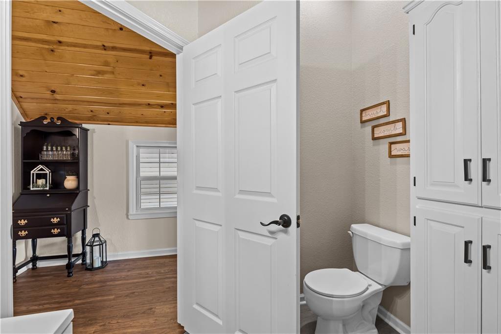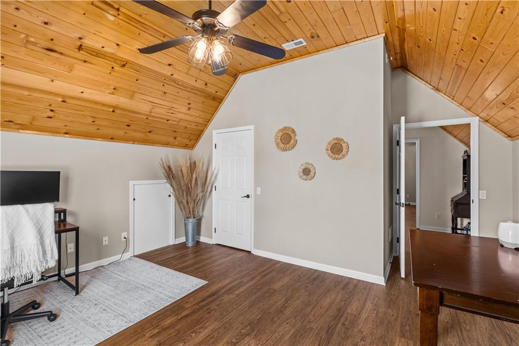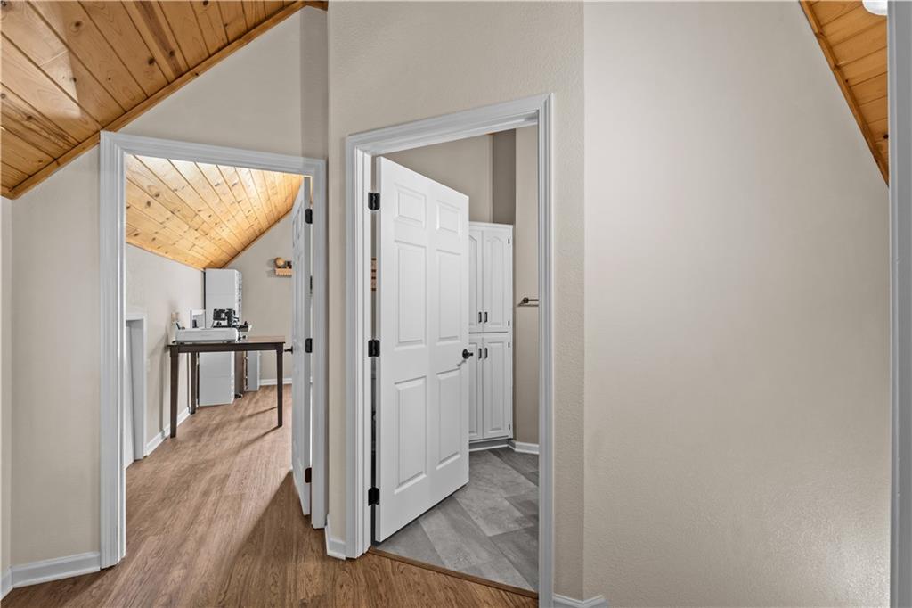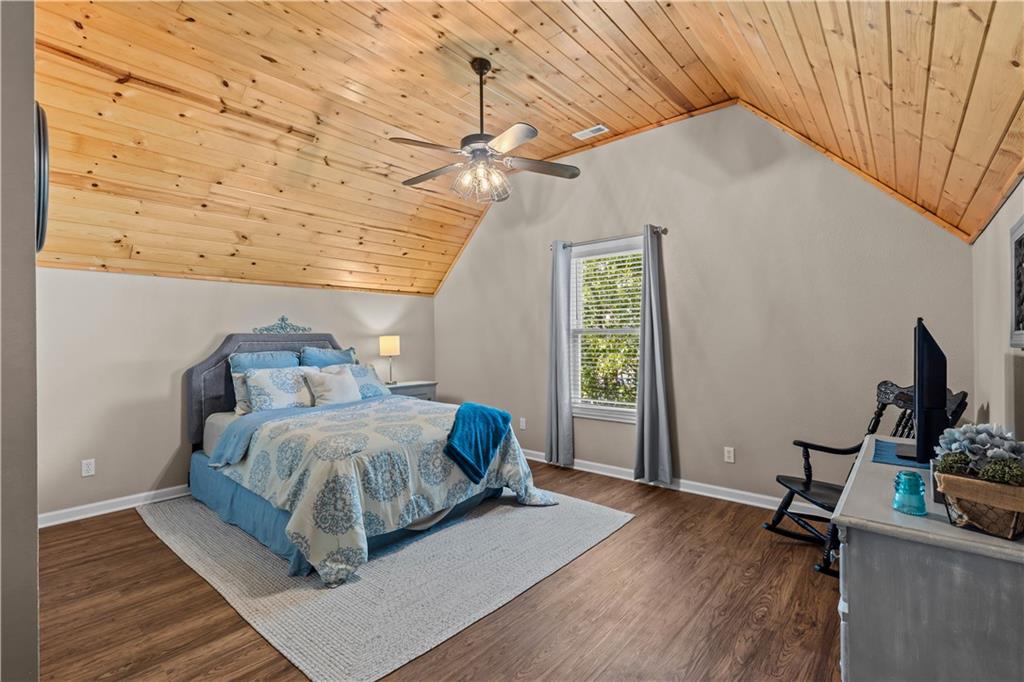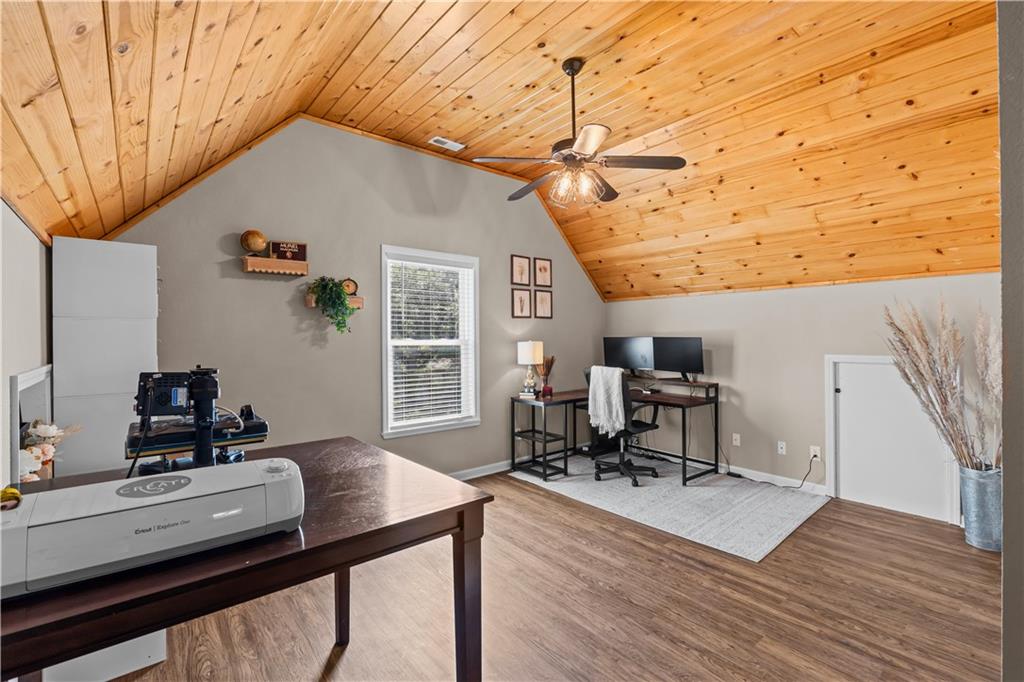 Upstairs, stunning high-angled tongue-and-groove ceilings add warmth and character to the bedrooms. One room makes a perfect home office, while another is great for guests.