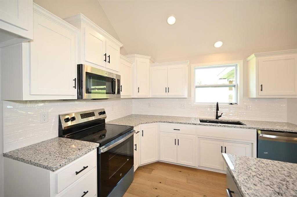 Stunning Custom Home with Modern Features and Inviting Spaces Welcome to your dream home! This exquisite property showcases an open floor plan, ideal for both entertaining and everyday living. The elegant kitchen boasts pristine white granite countertops, custom cabinets, and stainless steel appliances, all seamlessly flowing into the spacious living area centered around a beautiful fireplace. Step outside to discover a covered deck complete with a fan and light, perfect for enjoying serene views of the adjacent pasture. The rich feel of this home is accentuated by LVP throughout and vaulted ceilings enhancing the sense of space and light. The laundry room features stylish tile, while two generously-sized guest bedrooms offer plush carpeting, ceiling fans, and trey ceilings, creating a comfortable retreat for family and friends. The guest bath is tastefully designed, highlighting a tiled tub and a marble vanity that exudes luxury. Retreat to the master bedroom, a good-sized haven with carpet, a ceiling fan, and sophisticated trey ceilings. The walk-in master closet provides ample storage, while the en-suite master bath features elegant tile flooring, a double vanity with sleek black faucets, and a spacious tiled shower. The lower level invites you to enjoy a large fourth bedroom, complete with carpeting and a ceiling fan, alongside a substantial family room perfect for movie nights. The additional full bath boasts a tiled floor and a shower for convenience. Completing this remarkable home is an oversized three-car garage, providing plenty of space for vehicles and storage. The front of the house is adorned with beautiful stone, adding to the curb appeal with shutters to boost the look. Don’t miss the opportunity to make this luxurious yet inviting home your own! SIMULATED PHOTO’S NEW ONES COMING SOON – THE POND IS STOCKED FOR FISHING