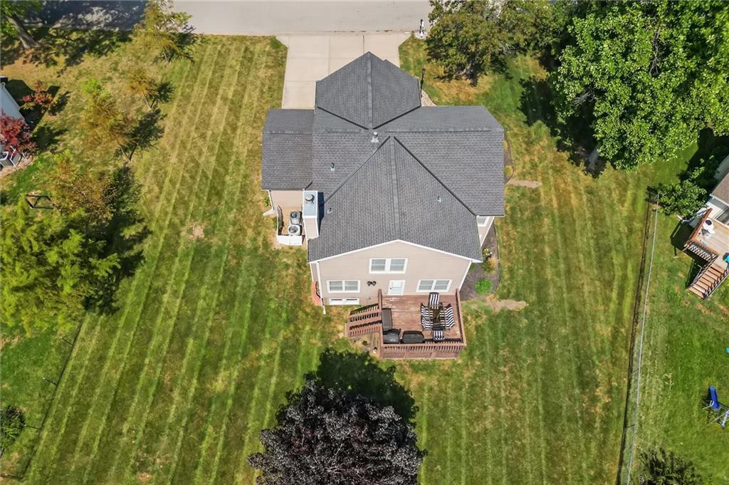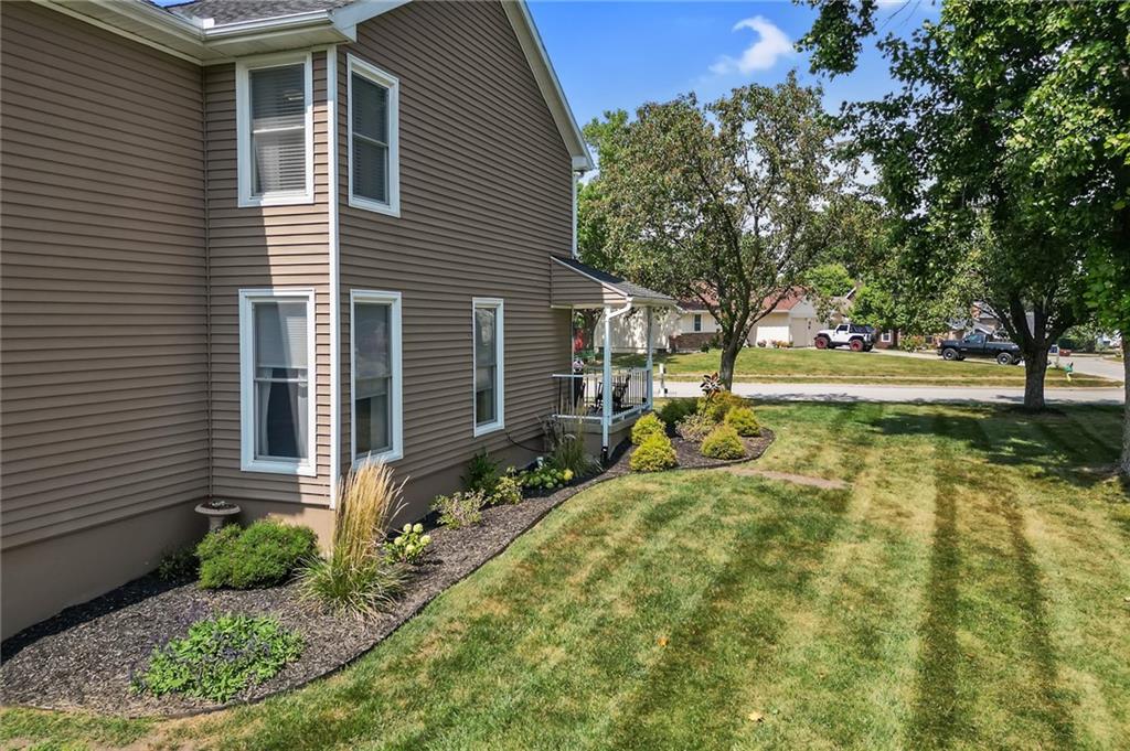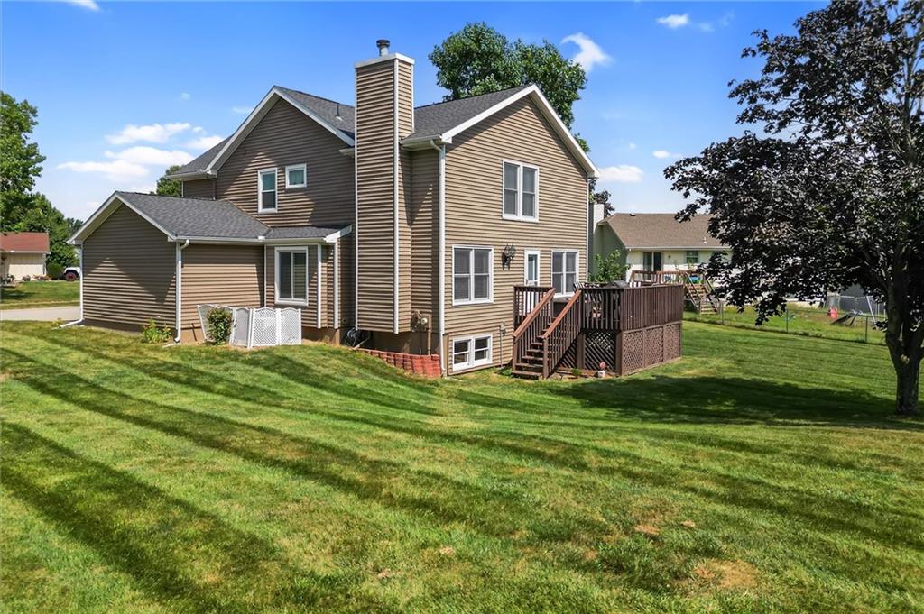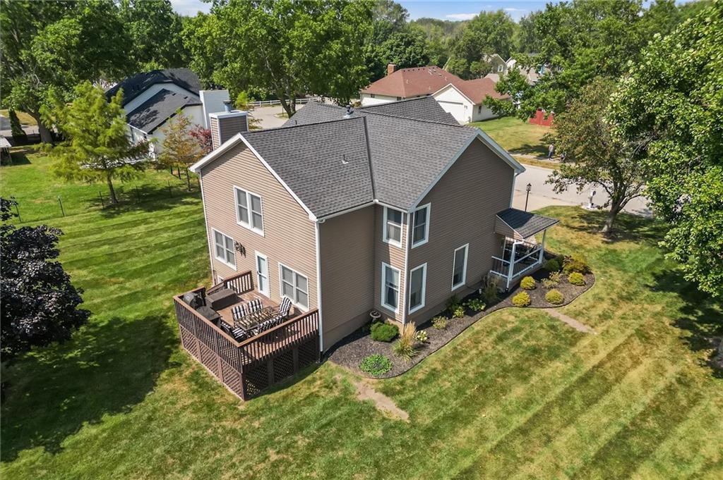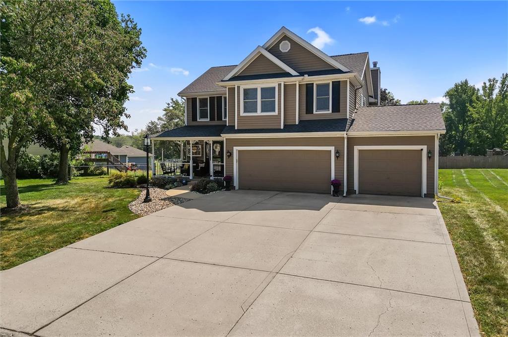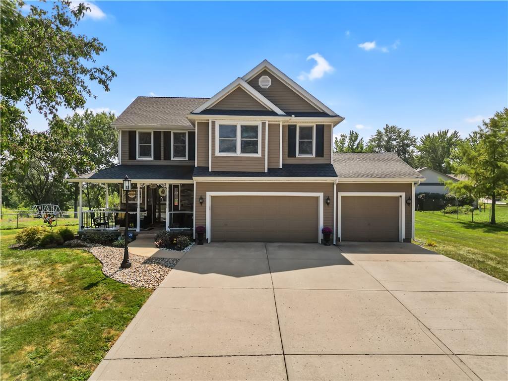 Beautifully situated on the west side, this spacious 2 story home with almost 3,000 square foot offers the perfect blend of comfort, style, and convenience. Just minutes from shopping, grocery stores, and more, the location is hard to beat. A welcoming covered front porch sets the tone before stepping inside, where a stunning staircase ties the main level together with the second level. The entry area includes a half bath, and the large living room boasts soaring ceilings and plenty of natural light. Off the living room, a generous dining room accommodates large gatherings, while the cozy hearth room features a gas fireplace with a striking mantle. The kitchen, dining, and hearth areas flow seamlessly with beautiful wood floors, giving an open concept feel. The oversized kitchen island, abundance of cabinets, and included appliances make it ideal for both cooking and entertaining. Upstairs you’ll find four spacious bedrooms and three full bathrooms, including a Jack and Jill bath connecting two bedrooms. The master suite offers a large retreat with a spa like bath, featuring double sinks, a jacuzzi tub, walk-in shower, and expansive walk-in closet. A dedicated upstairs laundry room adds convenience.The finished basement provides even more living space with new flooring, a half bath, a bar area, and large windows for natural light. A storage area ensures plenty of room for organization. Outside, the home includes a 3 car garage, a large deck perfect for entertaining, and a beautiful treed backyard that was once a double lot, offering extra space and privacy. This home truly has it all space, updates, and a fantastic setting.