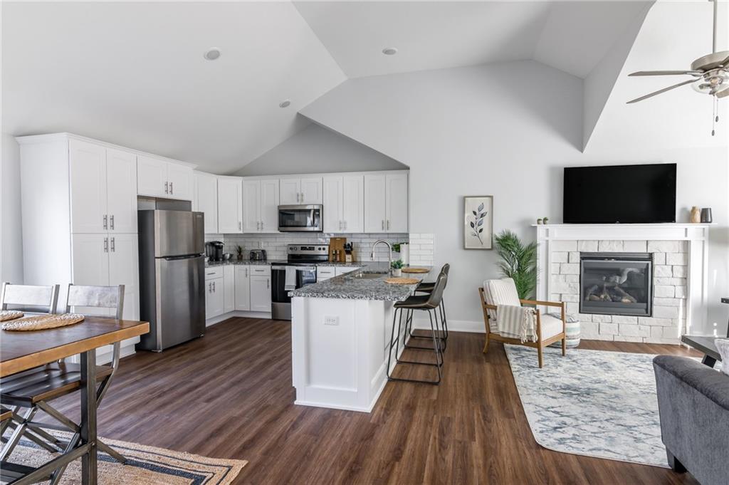 Beautifully designed, charming neighborhood, offering modern elegance and spacious living. Built in 2022! This 4-bedroom, 3-bathroom home features an open-concept layout with stylish finishes throughout. The inviting living room boasts a cozy fireplace, while the chef’s kitchen is equipped with sleek stone countertops, stainless steel appliances, and ample cabinetry. The spacious primary suite includes a luxurious ensuite bathroom, and three additional bedrooms provide comfort for family and guests. The finished lower level offers an entertainment space with a walk-out patio leading to a large, grassy backyard—perfect for relaxation or gatherings. Conveniently located just minutes from the historic square, dining, shopping, and highway access.