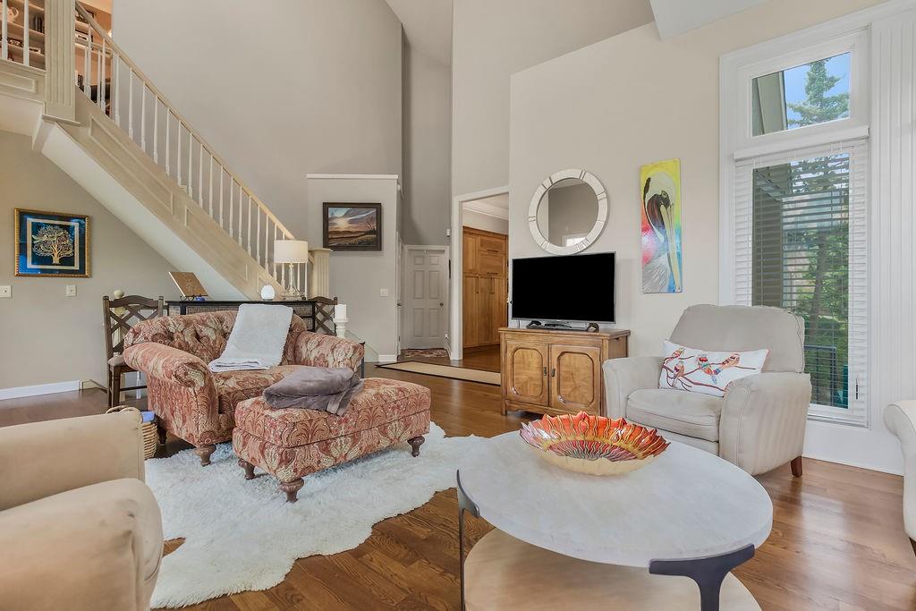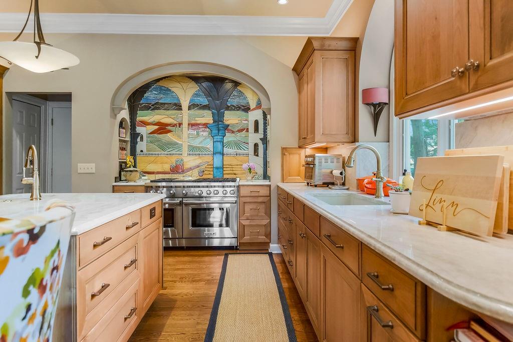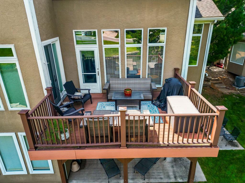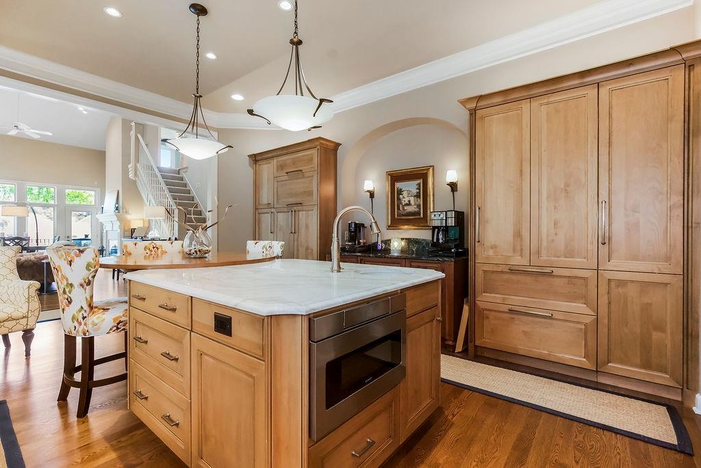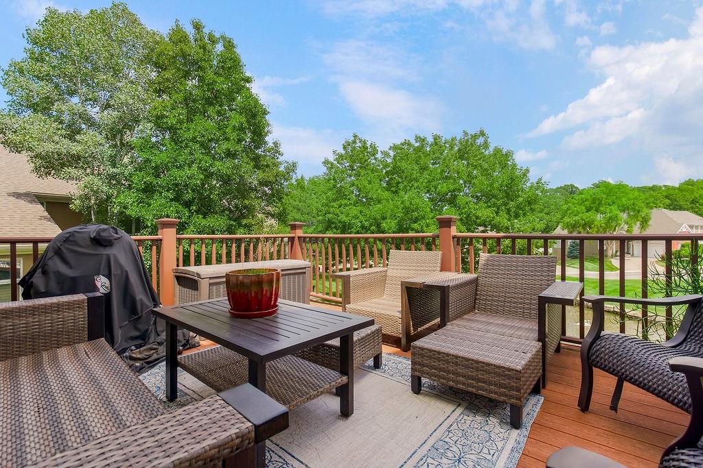 Delightful, Spacious, and Sophisticated: Welcome home and Wow!—one of the largest floorplans in the neighborhood—where grand ceilings and hardwood floors create a warm, inviting atmosphere. The fully remodeled chef’s kitchen is a true centerpiece with granite and marble counters, refined custom Crystal cabinets, soft-close drawers, Sub-Zero fridge, Wolf 6-burner stove, Bosch dishwasher, wine fridge, and a wonderfully designed mural that brings an Italian feel and flair. The primary bedroom is cozy and stylish, featuring its own fireplace and French doors that open to the scenic deck overlooking a serene pond. An airy, open layout flows through the living spaces with abundant natural light, a built-in bookcase, and a second fireplace. The walkout basement expands the living area with a comfortable sitting space, office, and a large storage cabinet in the well apportioned storage area. Walkout to patio for outdoor barbeques. With a new roof, newer HVAC, water tank, and garage door, this home blends thoughtful upgrades, modern convenience, and refined charm. Come experience classic elegance.