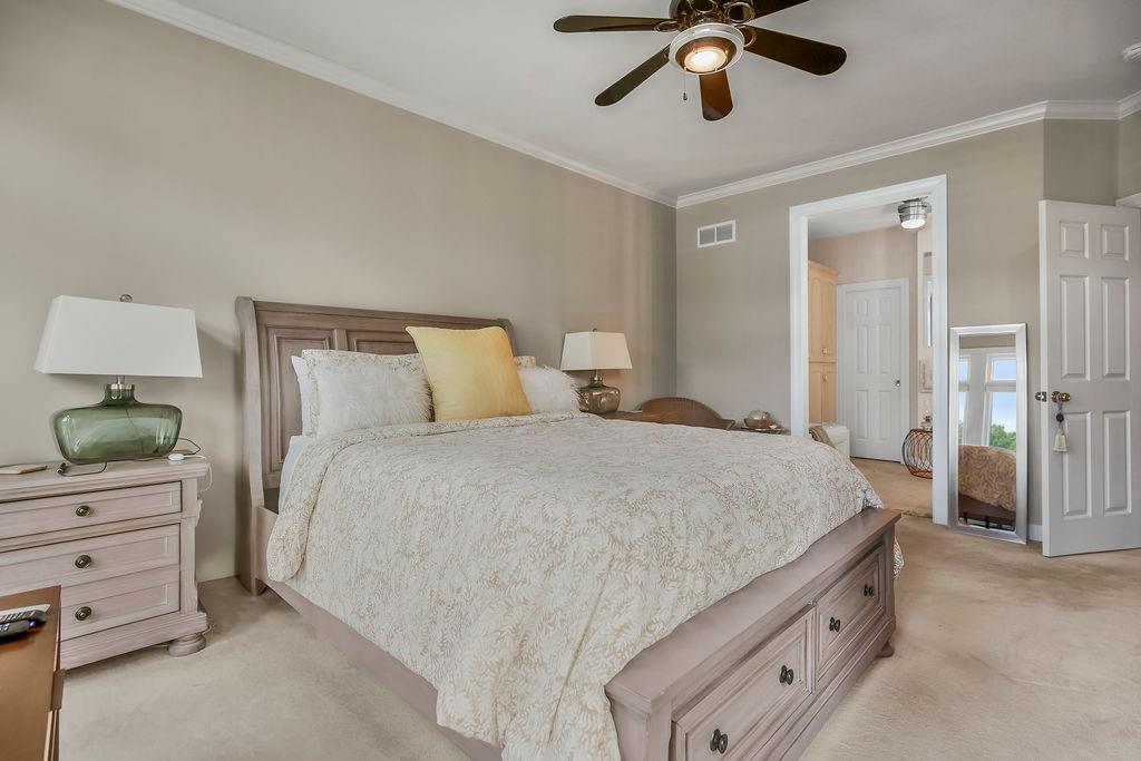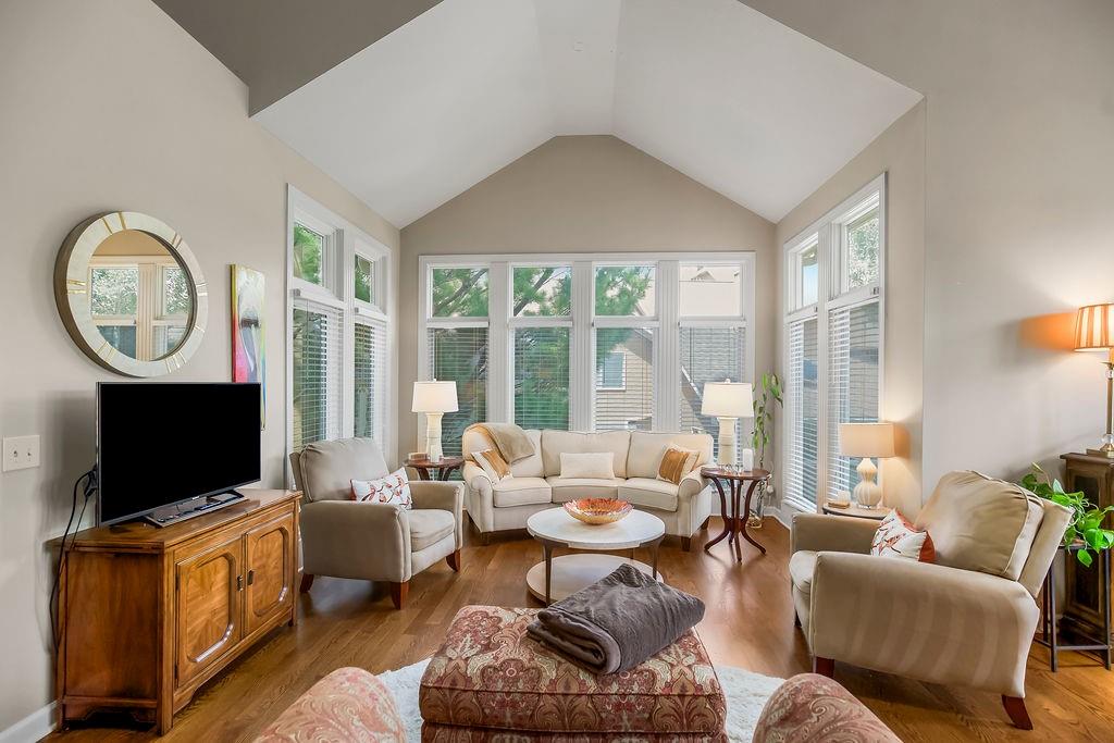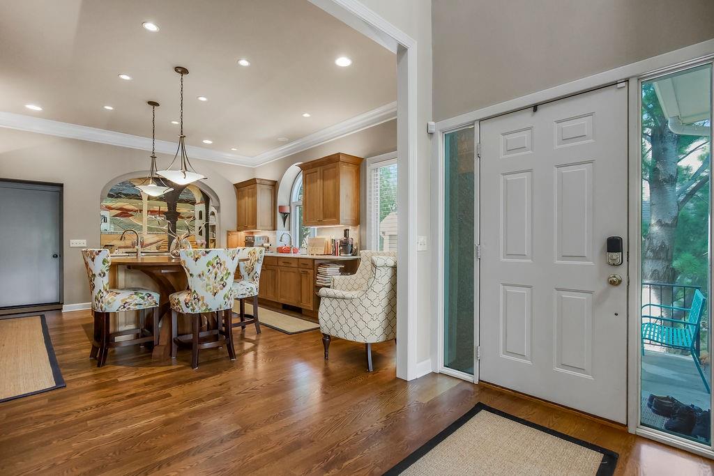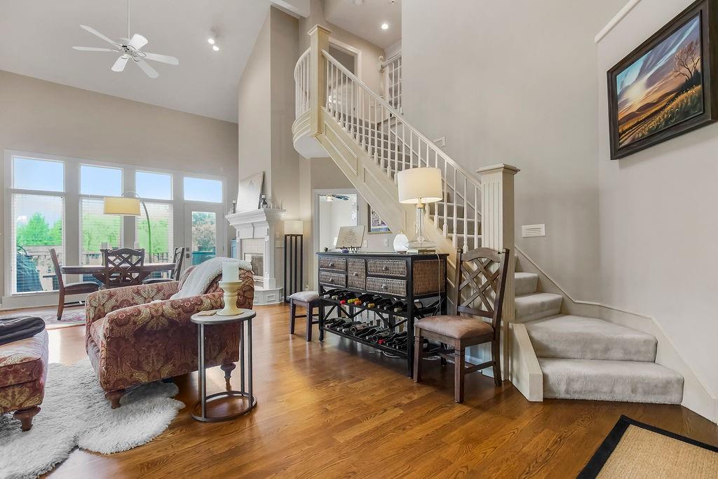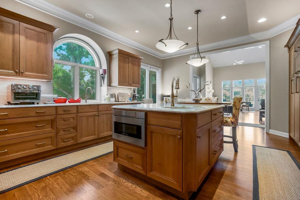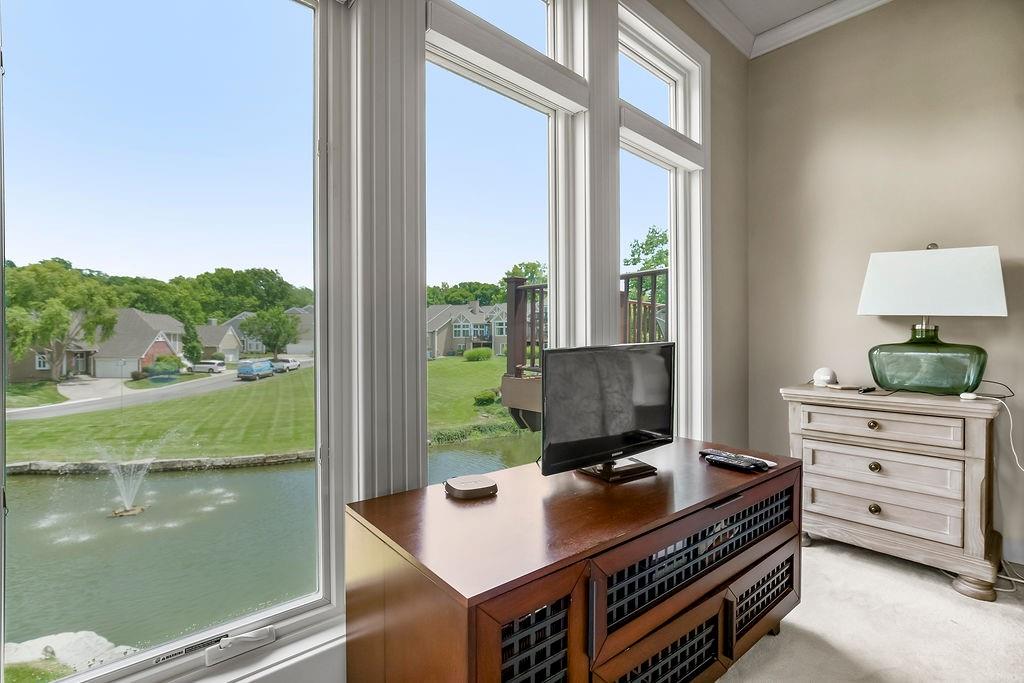 Delightful, Spacious, and Sophisticated: Welcome home and Wow!—one of the largest floorplans in the neighborhood—where grand ceilings and hardwood floors create a warm, inviting atmosphere. The fully remodeled chef’s kitchen is a true centerpiece with granite and marble counters, refined custom Crystal cabinets, soft-close drawers, Sub-Zero fridge, Wolf 6-burner stove, Bosch dishwasher, wine fridge, and a wonderfully designed mural that brings an Italian feel and flair. The primary bedroom is cozy and stylish, featuring its own fireplace and French doors that open to the scenic deck overlooking a serene pond. An airy, open layout flows through the living spaces with abundant natural light, a built-in bookcase, and a second fireplace. The walkout basement expands the living area with a comfortable sitting space, office, and a large storage cabinet in the well apportioned storage area. Walkout to patio for outdoor barbeques. With a new roof, newer HVAC, water tank, and garage door, this home blends thoughtful upgrades, modern convenience, and refined charm. Come experience classic elegance.