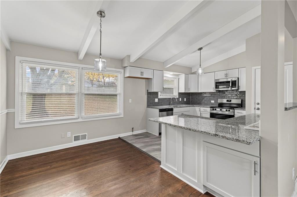 **1% BUY DOWN AVAILABLE AT NO COST CALL LISTING AGENT FOR MORE DETAILS** MOVE IN READY! Total remodel! Fresh paint in and out. You’ll love the warmth of hardwood floors and the character of wood-beamed vaulted ceilings. The updated kitchen features timeless white cabinetry, granite countertops, a modern tile backsplash and new stainless-steel appliances. BONUS room off dinning room that could be 4th bedroom with new bathroom. Both bathrooms have been fully revamped for a fresh, modern feel. The finished basement expands your living space with a large recreation room that’s perfect for guests, kids, or movie nights. 6′ privacy fence in large back yard. Great Gladstone location. Walk to school, park w/playground, basketball & tennis.