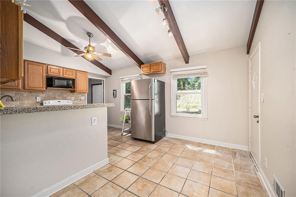 Step onto the inviting wooden front porch — an ideal spot to enjoy sunrises with your morning coffee or watch the kids play in the spacious front yard. Inside, you’ll be greeted by vaulted ceilings and warm wood flooring that set the tone for a home full of potential. The vaulted ceilings carry into the kitchen, a bright and functional space whether cooking is your passion or just part of your routine. Keep its current charm or reimagine it with modern updates.