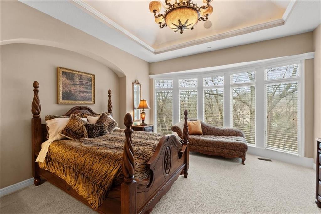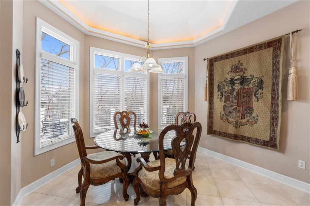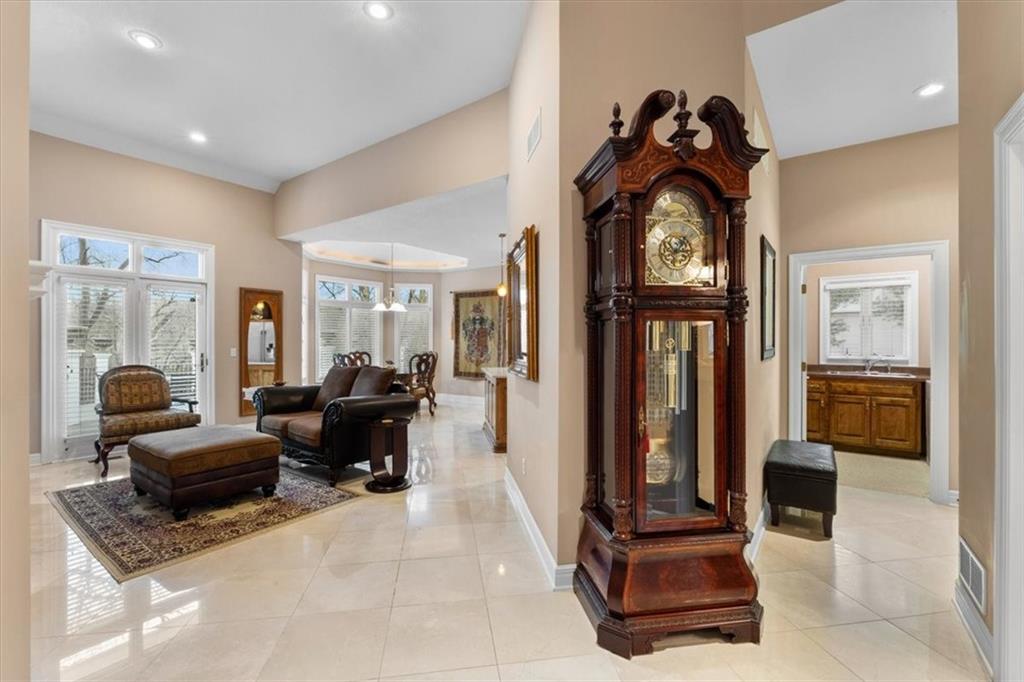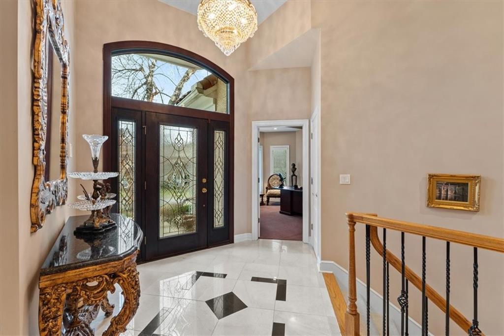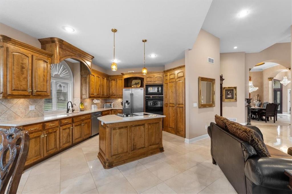 Welcome to this refined retreat on picturesque North Hickory Lane, nestled in the prestigious and final phase of Briarcliff West. This 4-bedroom, 3.5-bath residence offers over 4,500 square feet of thoughtfully designed living space, blending privacy, sophistication, and convenience with easy access to major highways and the airport. Step inside to soaring 12- and 14-foot vaulted ceilings on the main level and 10-foot ceilings throughout the walk-out lower level. Recent upgrades include stunning Taj Mahal Quartzite countertops in the gourmet kitchen, paired with tall birch cabinetry, a walk-in pantry, and a vaulted hexagon-shaped breakfast area. Newer appliances—including refrigerator and dishwasher—make daily living and entertaining a breeze. The luxurious primary suite features floor-to-ceiling windows, plush carpet, and a spa-like bath with tall cabinetry, soaker tub, oversized walk-in shower, and a generous walk-in closet. The expansive lower level is an entertainer’s dream with a two-sided gas fireplace, full wet bar with sink and fridge, wine storage, cedar closet, workshop, and ample storage. Three secondary bedrooms—each with walk-in closets, including one with an en suite—offer flexibility and comfort. Throughout the home, you’ll find custom marble floors, Anderson 400 series casement windows, crystal chandeliers, detailed millwork, wide trim, and vaulted ceilings with modern lighting. Additional highlights include a main-floor office/library with built-ins, a custom imported vanity in the powder room, main floor laundry, and newer HVAC, humidifier, and water heater. A top-tier security system includes three cameras and a Ring doorbell. Outside, enjoy the tiered backyard that backs to mature trees and scenic nature trails. Car enthusiasts will appreciate the oversized 3-car garage with 11-foot ceilings. Just minutes from the charm and amenities of Briarcliff Village—this exceptional home is not to be missed.