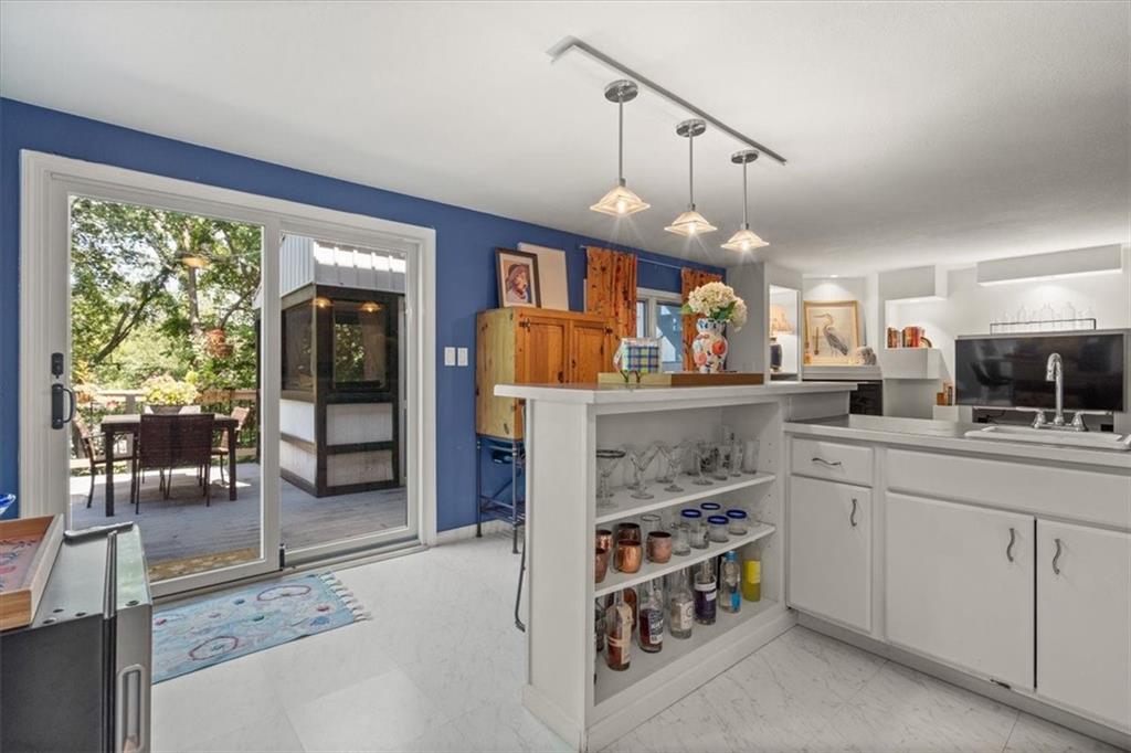 The versatile layout includes a guest suite complete with its own kitchen—ideal for extended stays, a private home office with exterior access, or multi-generational living. The primary suite features a spacious walk-in closet, convenient laundry, and spa-like comfort. A screened-in porch and multiple outdoor living areas provide the ultimate setting for relaxation or entertaining against a wooded backdrop.