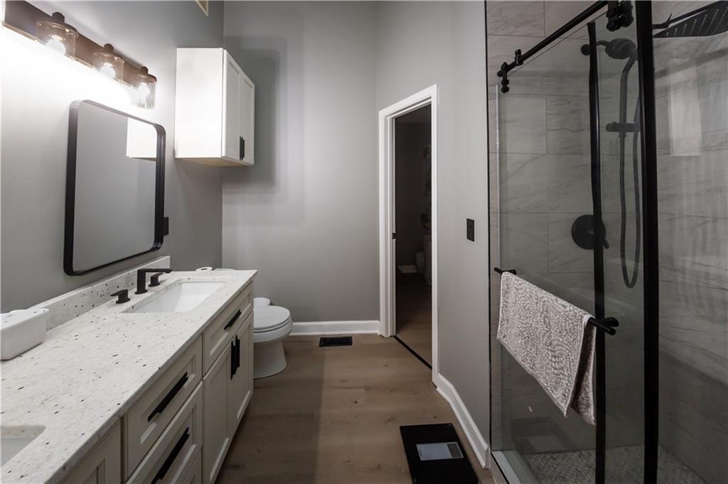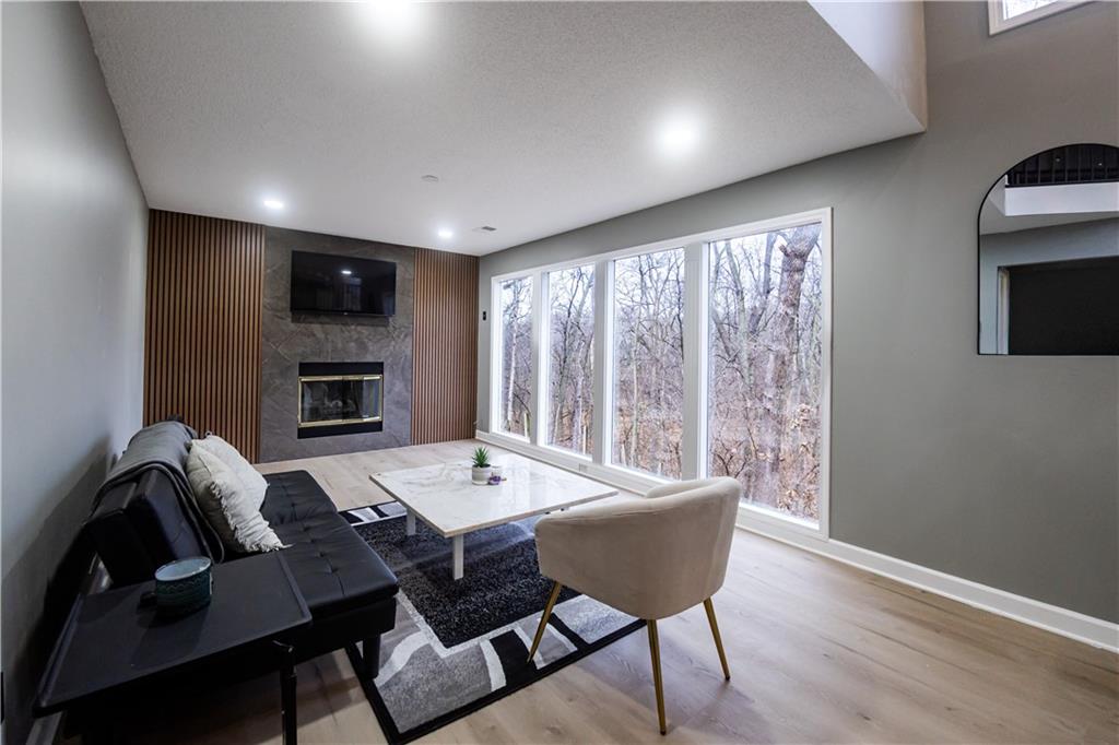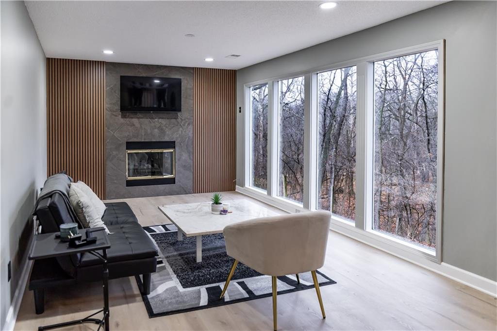 The main living area features a striking fireplace with contemporary tile surround and vertical wood accents, serving as a true focal point for the space. Wide-plank flooring flows seamlessly throughout the main level, complementing the home’s neutral and modern colors.