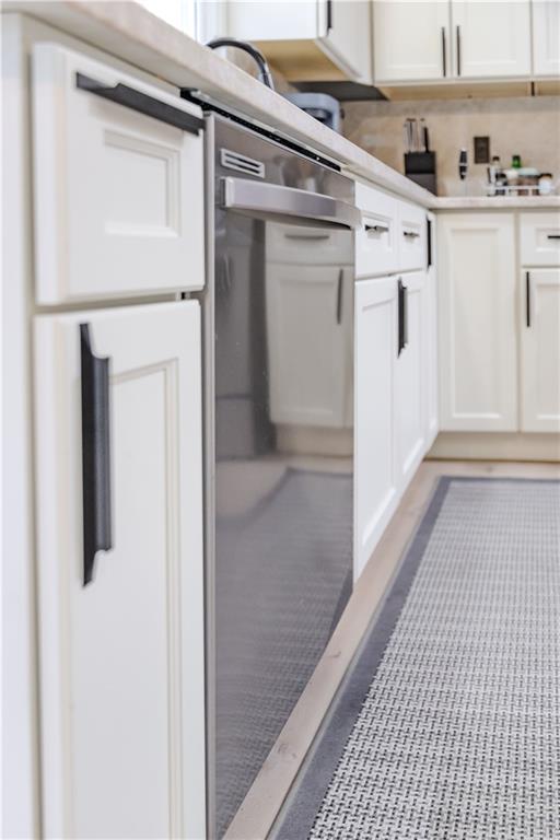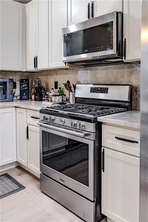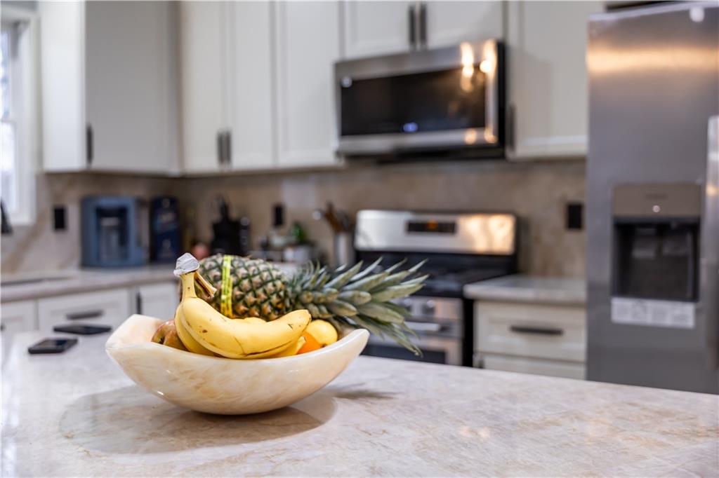 The fully updated kitchen is both stylish and functional, featuring crisp white cabinetry, new countertops, a large center island with seating, and brand-new appliances. Adjacent dining and living areas provide an open yet defined layout, ideal for entertaining or everyday living. Glass doors lead to a newly built deck overlooking mature trees and a creek, offering a private outdoor retreat for your morning coffee.
