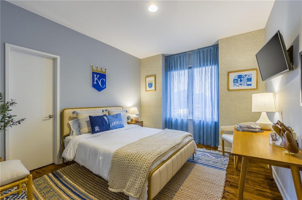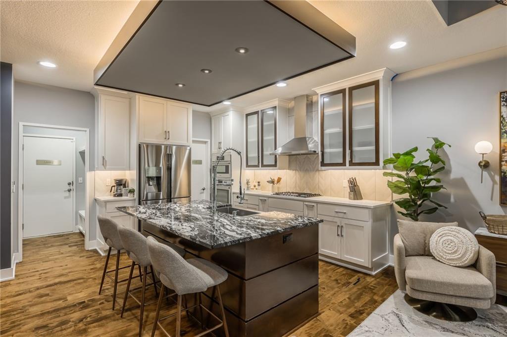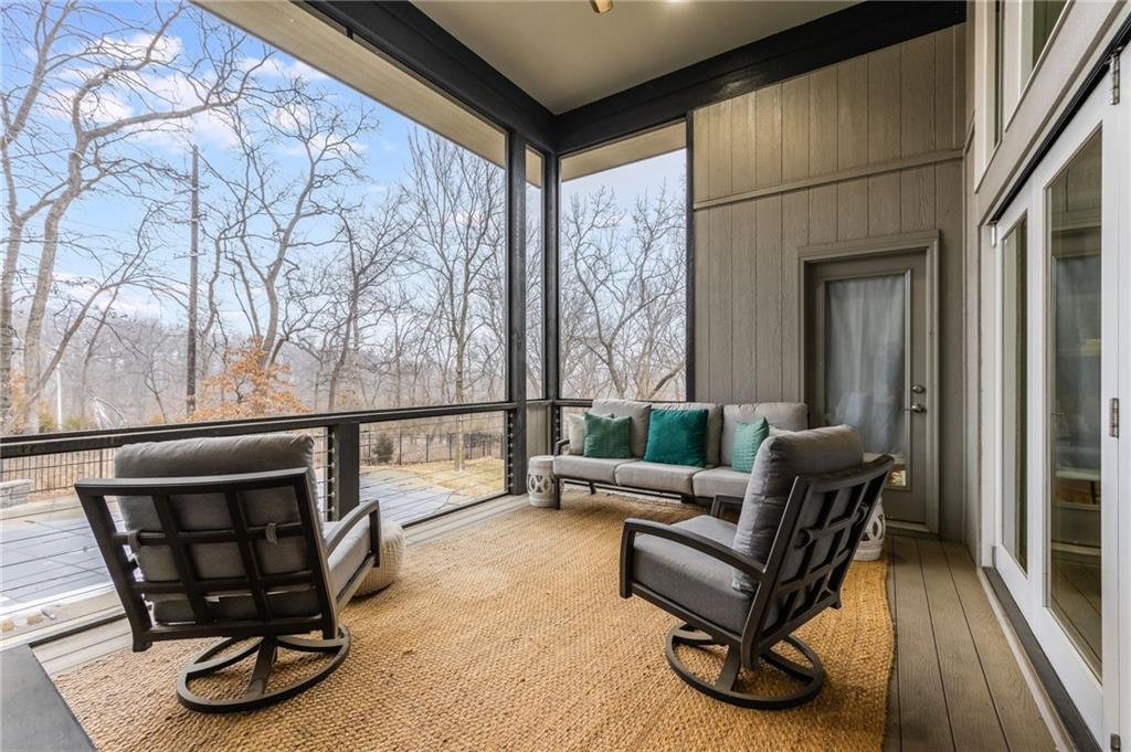 OUTSTANDING, Reverse 1.5 Story is nestled in Overland Ridge in Kansas City North. This fine home provides open living spaces with 4 bedrooms (2 on the main floor and 2 on the lower level) & 4 bathrooms, large kitchen meant to please the finest of cooks, custom cabinets, expansive granite breakfast island, deep stainless sink, Bosch range, oven, dishwasher and a walk-in pantry complete the kitchen. The dining area flows directly from the kitchen to the living room with 14 ft. ceilings, beautiful maple wood floors with a folding wall of windows opening to a screened in deck with fireplace with views of the in ground pool. The Owner’s bedroom offers a large window also overlooking the private pool and backyard. The Primary bedroom has it’s own access to the screened deck– the master ensuite holds a wet room with a combined sunken jetted tub and shower, double bachelor height vanities, large walk-in closet that connects to the laundry. Designed for comfort and entertaining, the lower level has a tv area, wet-bar with tiled backsplash. You can take a break from the day by walking out to the patio. Other Amenities include recessed lighting, chandeliers, granite counters, 3-car garage, 2 gas fireplaces and large storage area. Overland Ridge neighborhood is conveniently located near interstates, shopping venues, health care facilities, restaurants, gyms, schools, parks, evening entertainment and the KCI Airport.