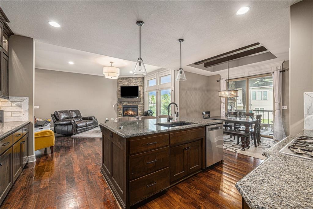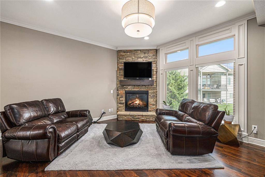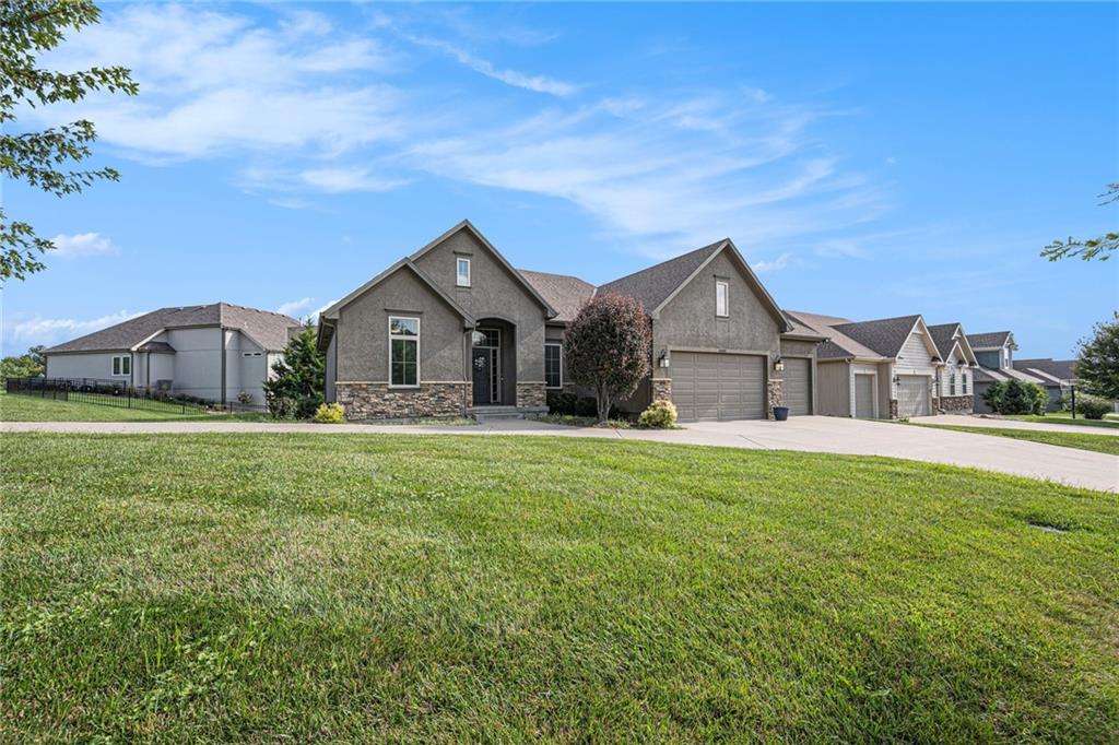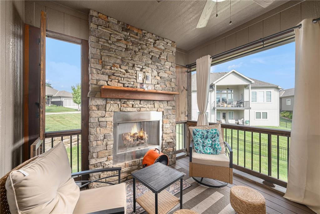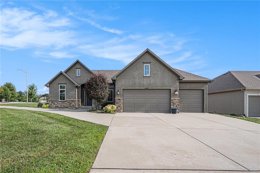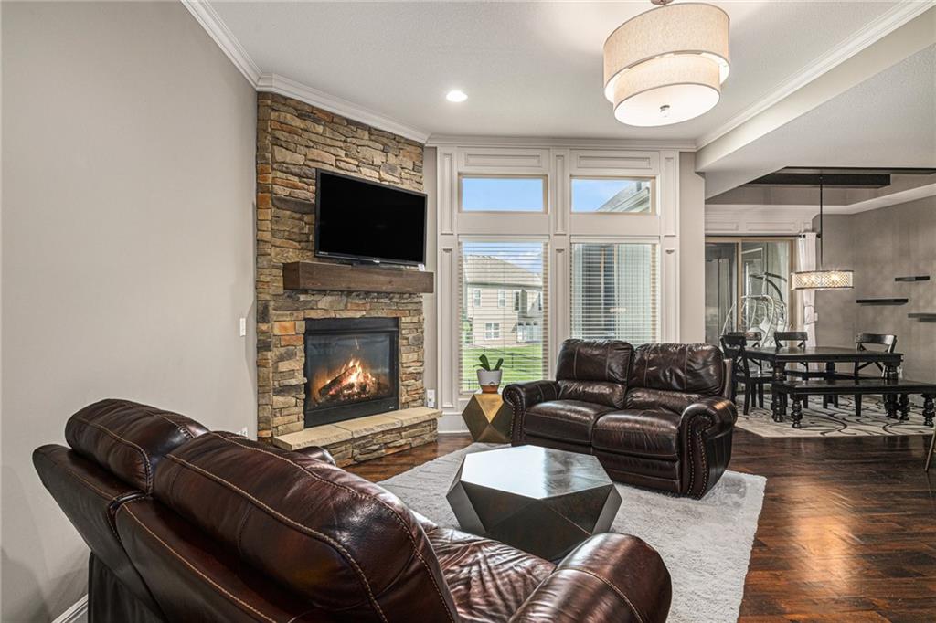 Remarkable reverse 1.5 story home offering 4 bedrooms and 3 baths, perfectly situated near interstates, shopping, restaurants, gyms, healthcare, schools, parks, entertainment and the KCI airport. Quality craftsmanship shines with crown molding throughout, heated bathroom floors, walnut hardwoods, and marble and granite countertops. The kitchen features ample cabinet space, stainless steel appliances, ample workspace, opening to a screened-in deck with a fireplace for year round indoor-outdoor living. The walk out basement provides generous entertaining space with a bar, kitchenette, and oversized patio, plus a workshop with double-door access. Enjoy the beautiful community pool and the convenience of a 3 car garage. Hurry fast before it’s gone! ***24 Hour notice required for all showings.***