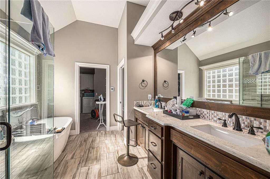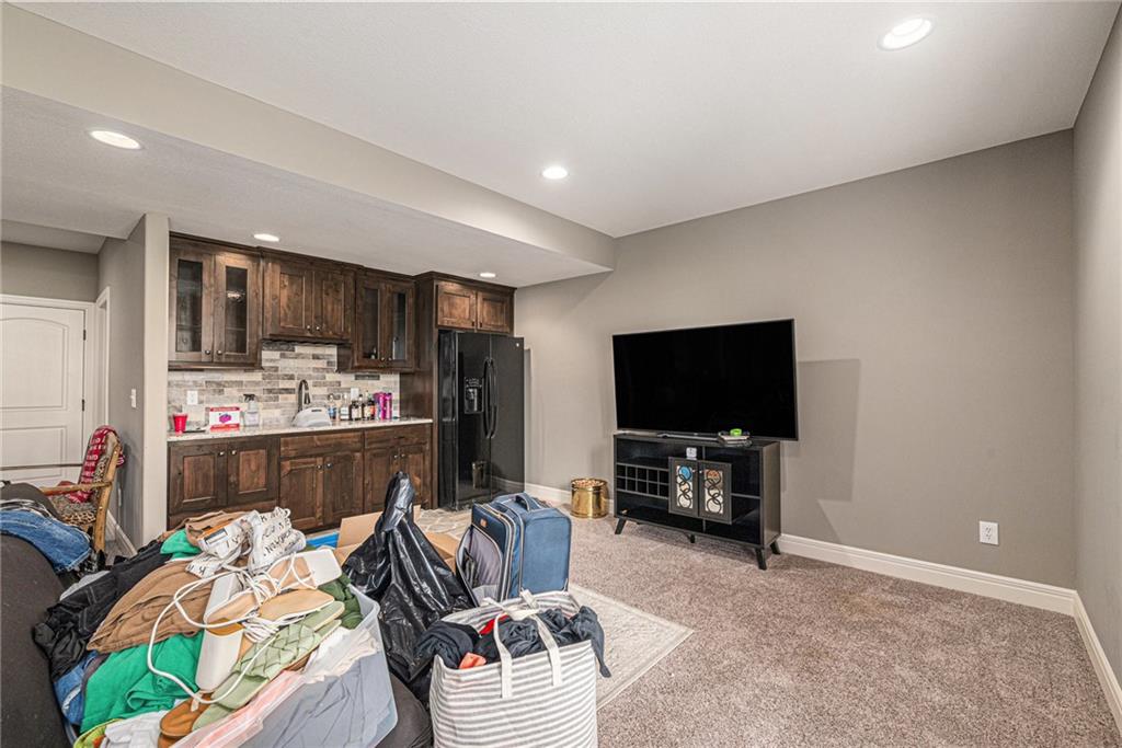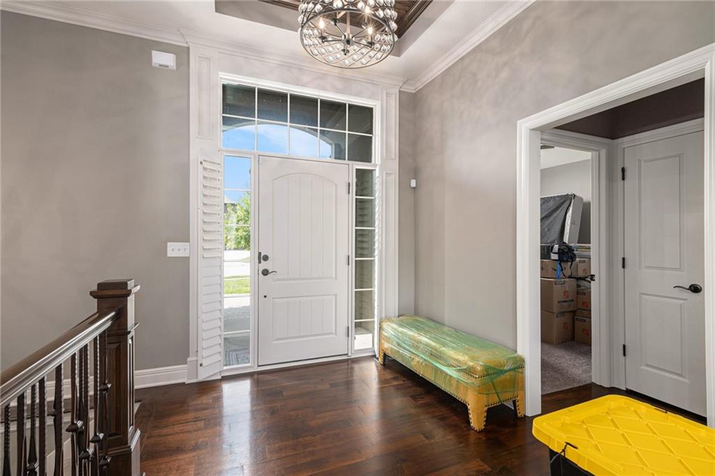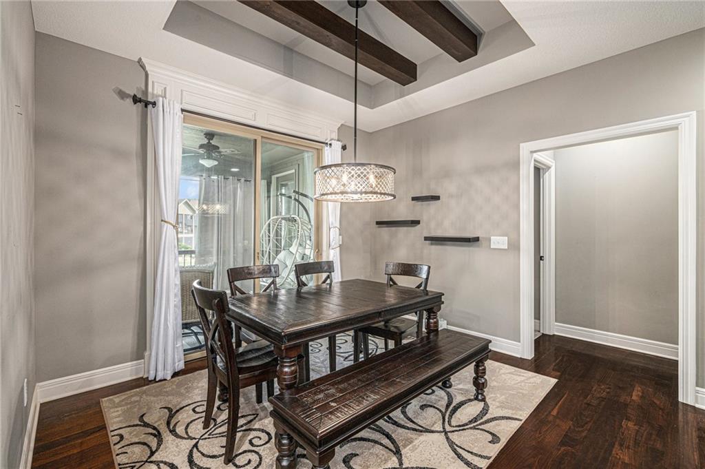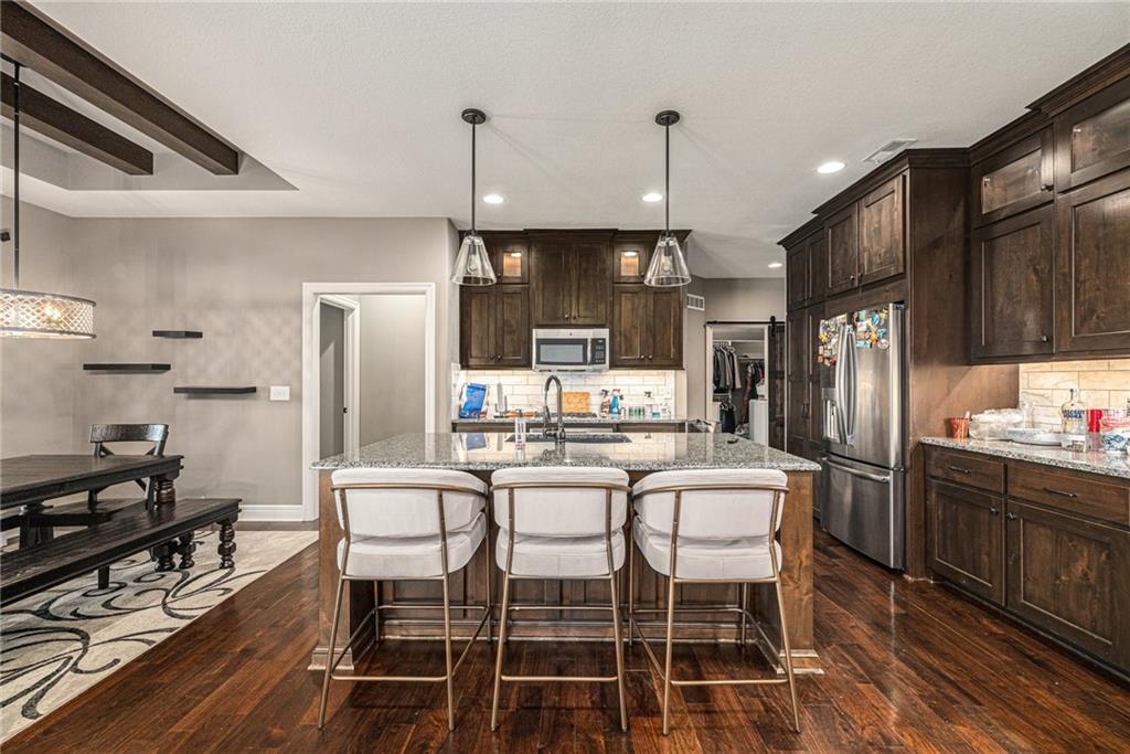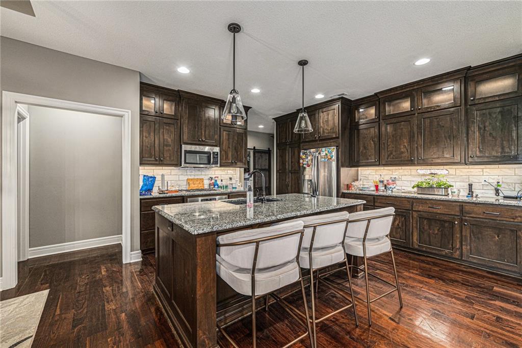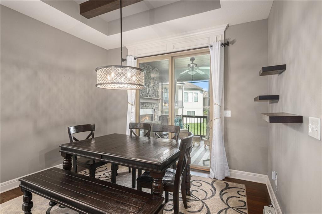 Remarkable reverse 1.5 story home offering 4 bedrooms and 3 baths, perfectly situated near interstates, shopping, restaurants, gyms, healthcare, schools, parks, entertainment and the KCI airport. Quality craftsmanship shines with crown molding throughout, heated bathroom floors, walnut hardwoods, and marble and granite countertops. The kitchen features ample cabinet space, stainless steel appliances, ample workspace, opening to a screened-in deck with a fireplace for year round indoor-outdoor living. The walk out basement provides generous entertaining space with a bar, kitchenette, and oversized patio, plus a workshop with double-door access. Enjoy the beautiful community pool and the convenience of a 3 car garage. Hurry fast before it’s gone! ***24 Hour notice required for all showings.***