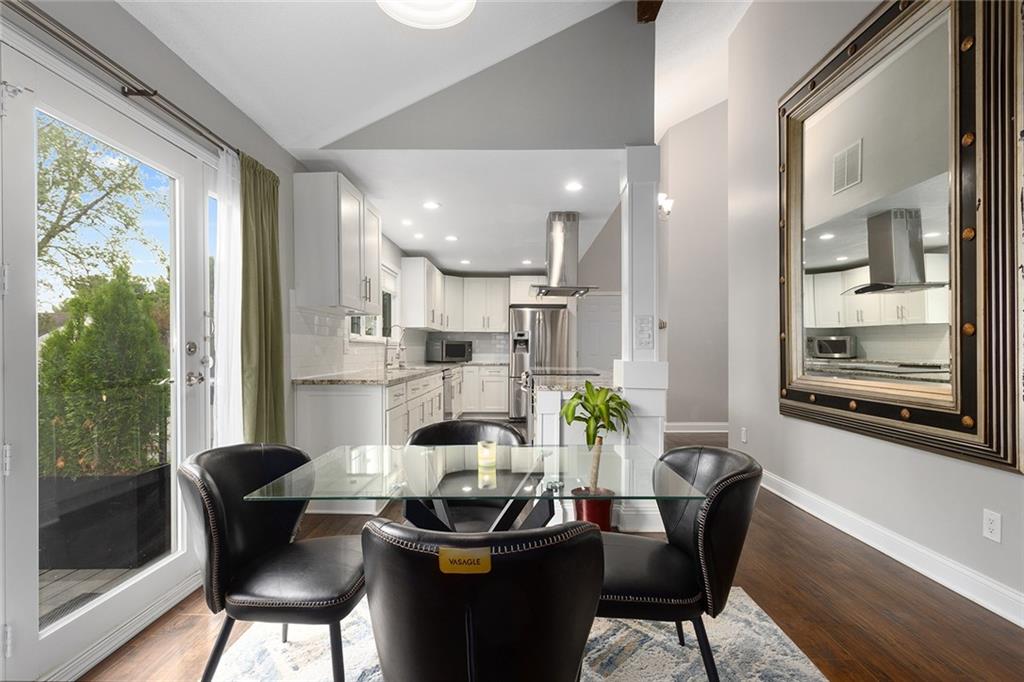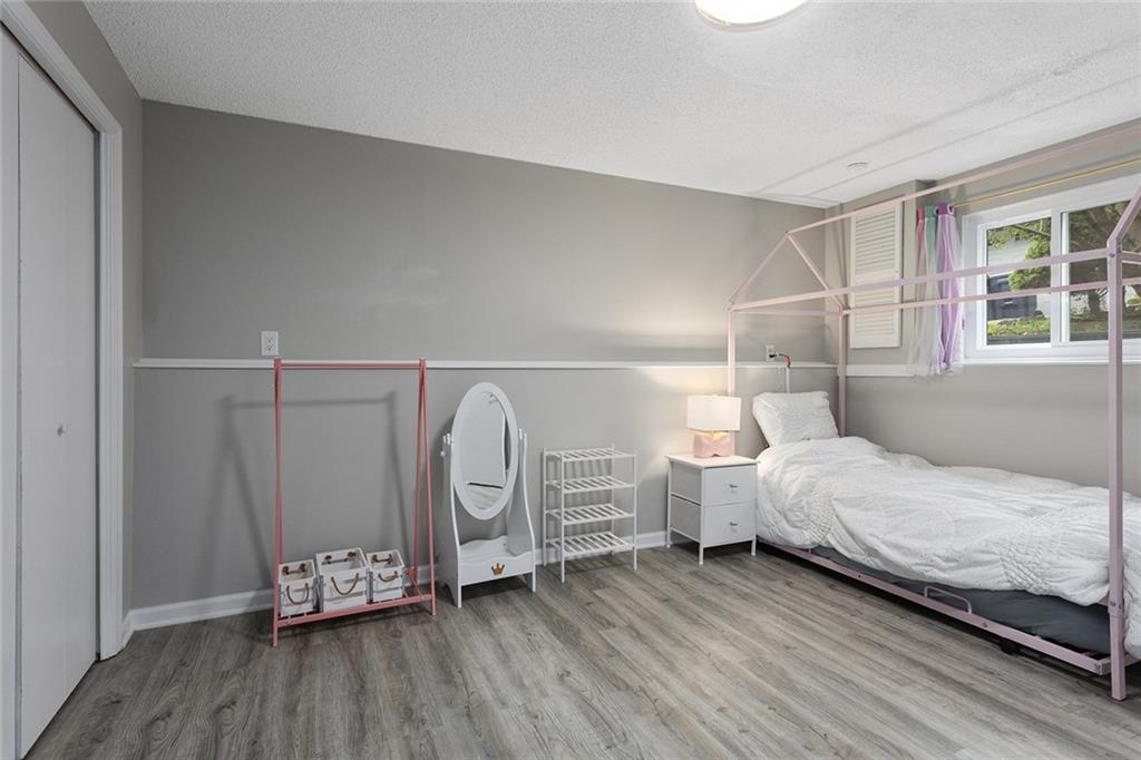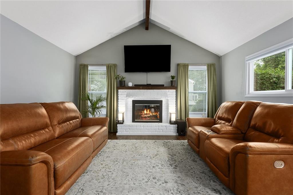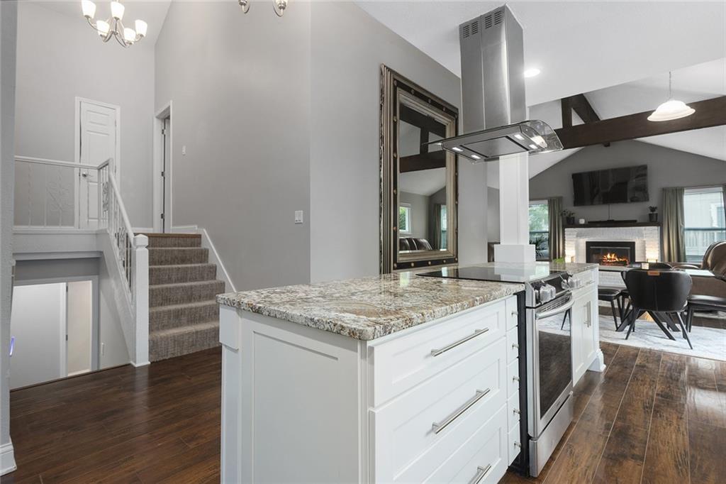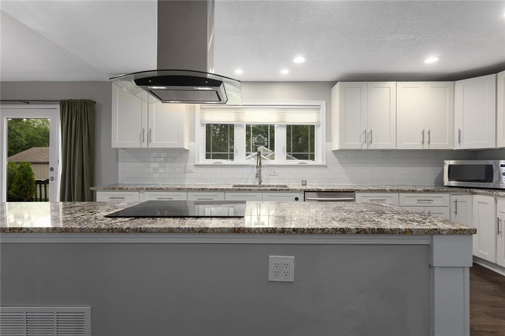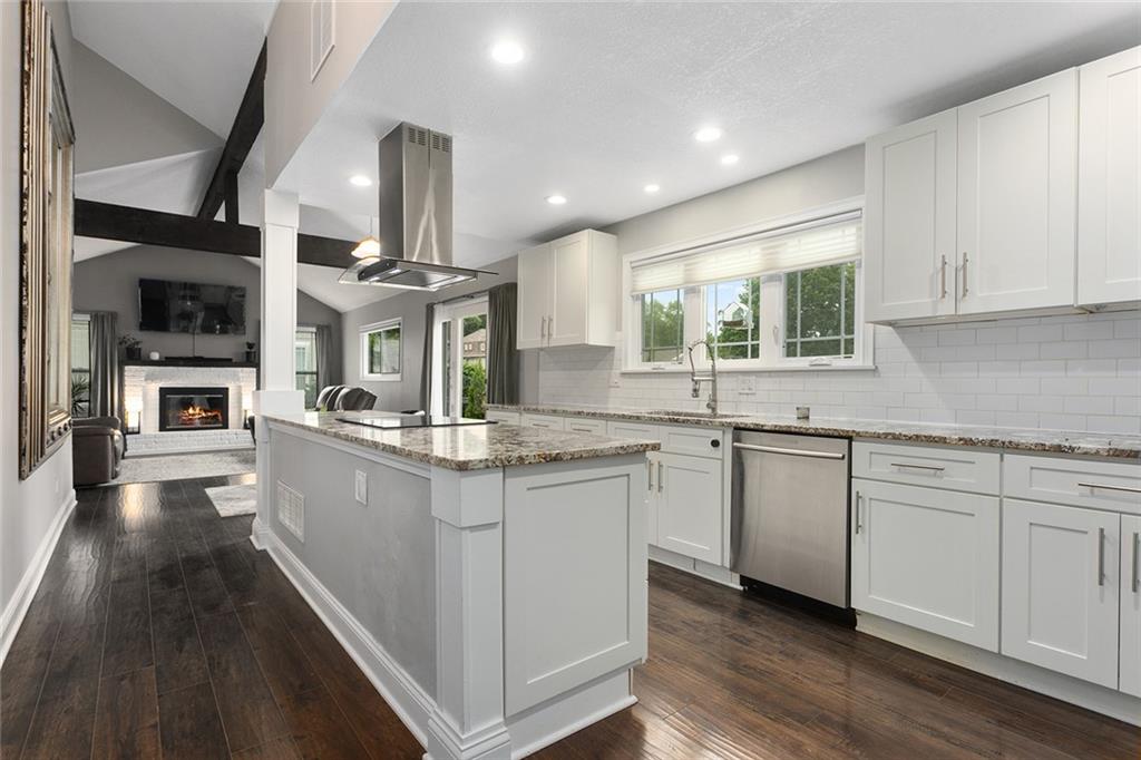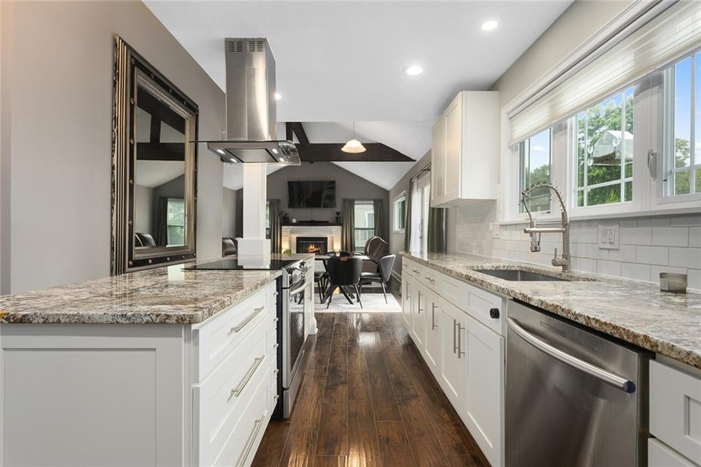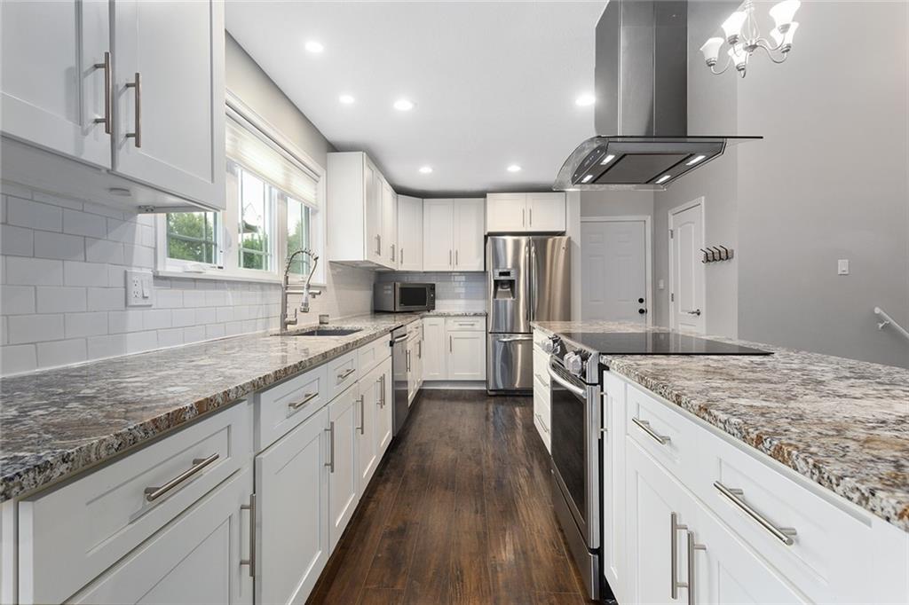The large kitchen boasts white cabinetry, granite countertops, stainless steel appliances, a generous island, and abundant cabinets with pull-outs for maximum storage. The finished walk-out basement provides two additional bedrooms, a full bath, and access to a flexible rec room with fireplace and laundry.