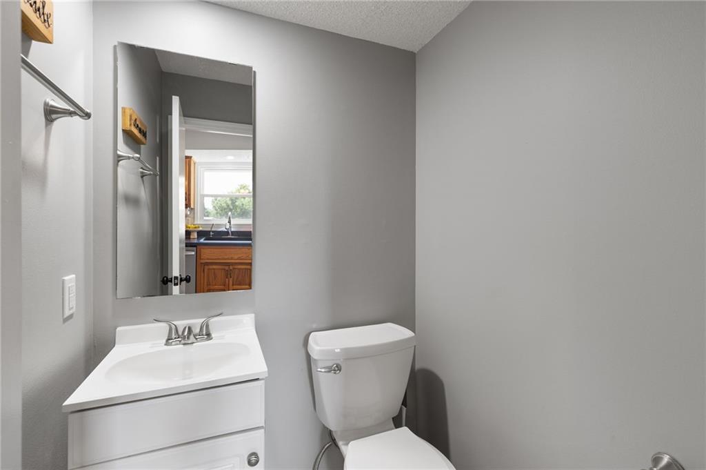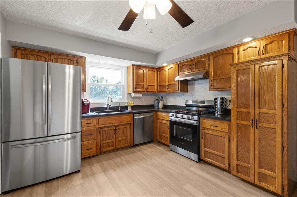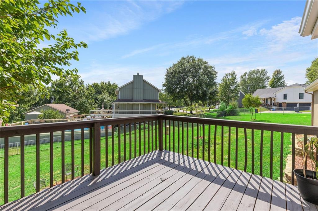 Inside, enjoy abundant natural light through Pella thermal-pane windows, a modern color palette, and updated flooring and lighting throughout. The kitchen is perfectly equipped for both daily life and entertaining with a gas range, matching appliances (refrigerator stays), and a roomy pantry. The main level flows beautifully with a comfortable family room, formal dining with deck access, and a convenient half bath for guests.