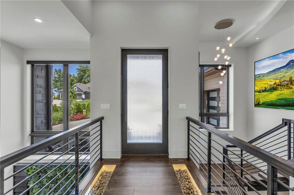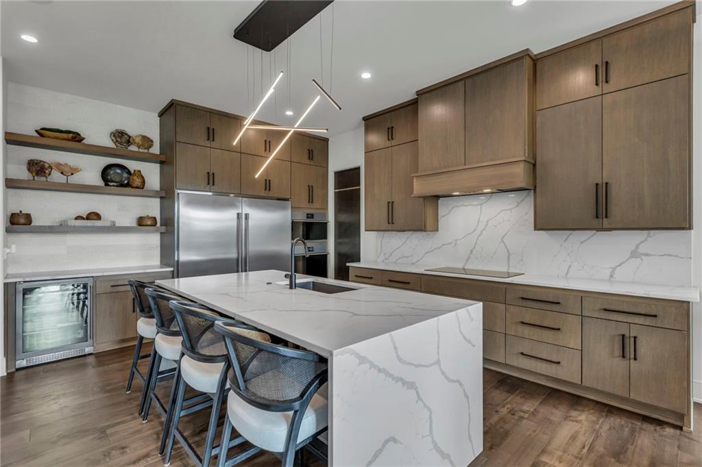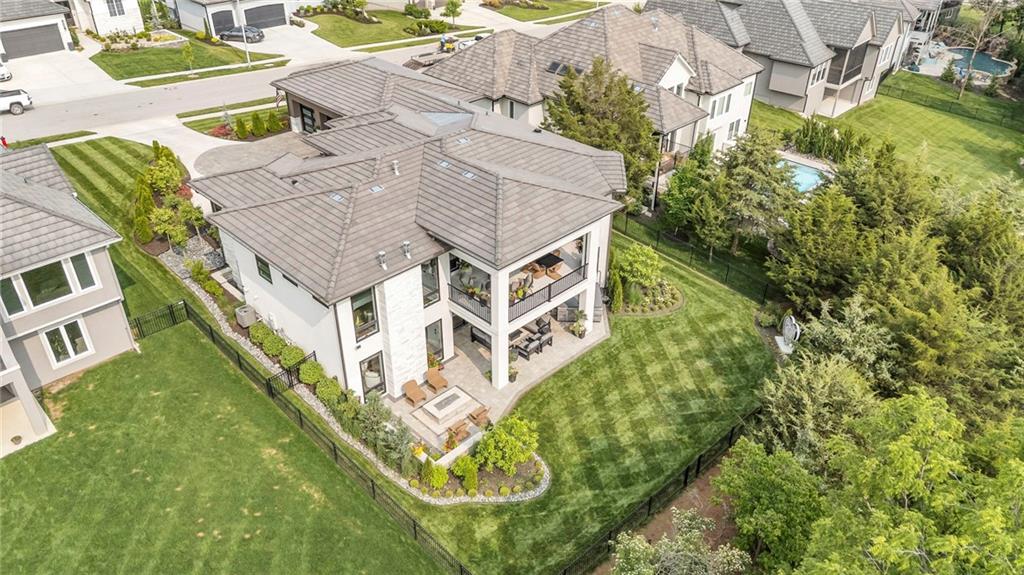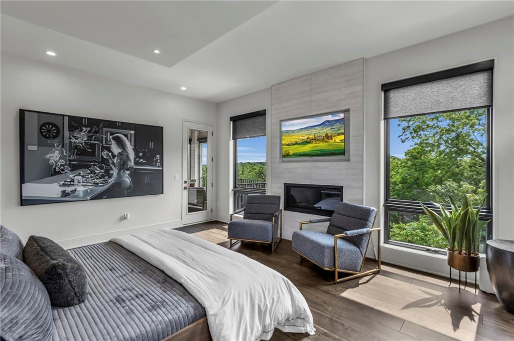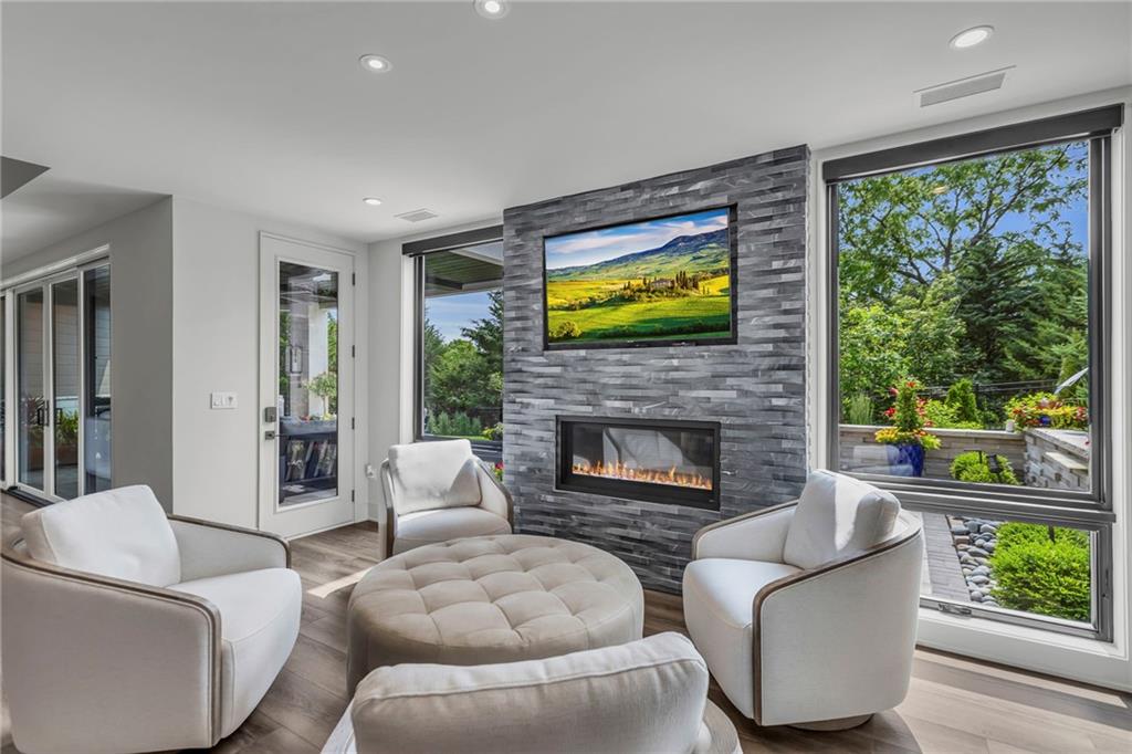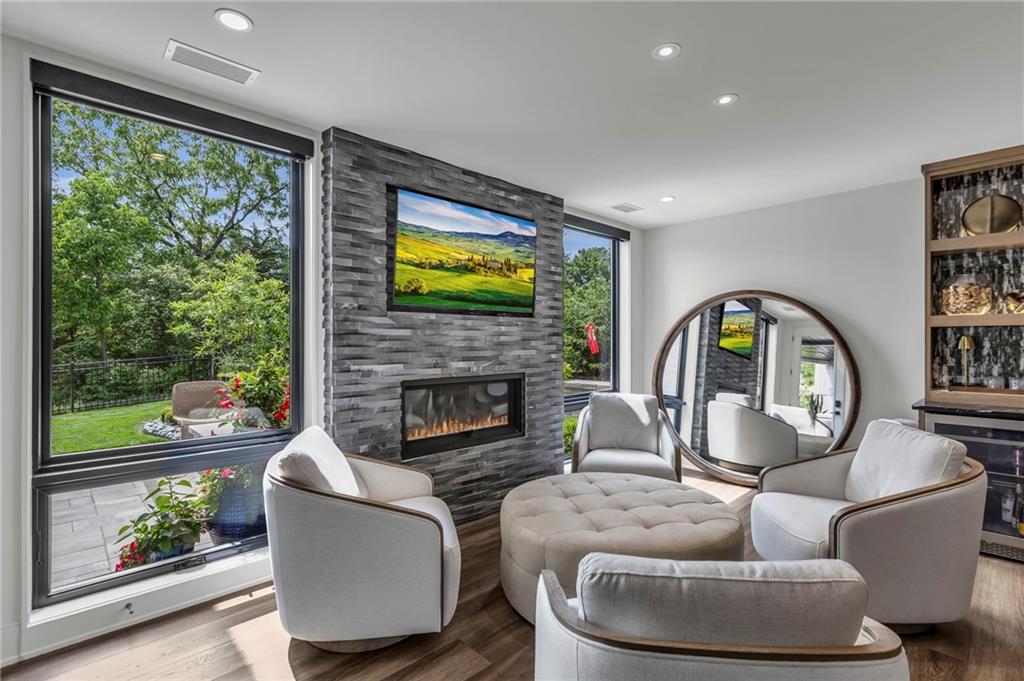 CONTEMPORARY AND LUXURY describes this Artisan designed home built by Casa Bella! A true masterpiece bringing in amazing architecture while touching all your senses! The 2 story water fall greets you at the entry along w/ dramatic ceiling, lighted walkway, leading to the great room w/ marble fireplace surround, back lit quartzite, floor to ceiling windows. The treed back drop is inviting & covered deck has new automatic screens. The Gourmet Kitchen has Carrera Marble island w/ waterfall edge, Frigidaire Refrigerator / Freezer, Cafe Induction Stove Top, Bosch Dishwasher, Cafe oven, Advantium microwace along w/ 2nd oven in the back pantry. Grill deck is a bonus feature right off the pantry. Perfectly positioned study w/ glass panels to bring in the light but nice and quiet for privacy. The Spa-like primary bath has marble floors, double headed shower w/ glass surround, soaking tub, large double vanity w/ plenty of cabinets. Primary bedroom includes built in headboard, king bed & side tables AND a beautiful view to the covered deck & backyard w/ fireplace for those chilly evenings. As you walk down the floating steel staircase w/ solid wood stairs, prepare to be WOW’d as the lower level is an Entertainer’s Dream. Back wet bar w/ beverage frig & refrigerator drawer & ice/freezer drawer. The quartzite counter lit island is in perfect position for wine tastings next to the wine feature wall. The 3rd fireplace is the perfect conversation area while the media space is ample and comfortable. You can walk right out to the covered patio & enjoy the fire pit, lush fenced backyard and privacy. 3 bedrooms w/ 2 1/2 baths on the LL. The home gym is amazing space with storage tucked away. Pet Lovers will enjoy the “Dog House”. 8′ deep chocolate modern interior solid wood doors w/ metal inlays, paved stone driveway, Fire & Water feature front and back, epoxy’d garage floor, remote blinds on front entry & sliding back door!