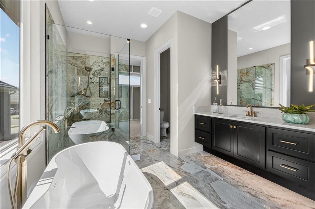 Don Julian masterpiece plan!! Ready to move in! The Sterling Reverse 1.5 story is sure to impress with its unique twist on the reverse floor plan. 5 bedrooms, 4 baths with 3 car garage- 4271 sq feet of luxury living! Soaring ceilings, wide open plan & walls of windows! Kitchen includes incredible quartzite countertops, custom cabinetry and walk thru pantry. Primary suite on main- incredible ceiling/wall details and spa like bath with dreamy finishes/plumbing fixtures and huge walk in closet. 2nd bedroom/office on opposite side of house for the ultimate in privacy. Enjoy the huge covered patio overlooking large private yard. Lower level has 3 large bedrooms, 2 full baths, family room with gorgeous walk up bar, ample storage and large sliders leading to paved patio. Not a detail missed in this incredible home- SO many upgrades and special moments through out- Do not miss your chance to live in this exclusive neighborhood- only a few homes left! Call today for a tour!