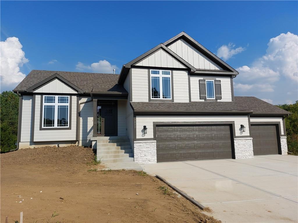 Ready for paint touch-up and final clean! This same floor plan is on Lot 137. Nestled on a private cul-de-sac and backing to serene trees and green space, this home offers both privacy and natural beauty. Located in the county—**no KCMO “E” tax**—you’ll enjoy added savings while still being close to everything. The 12×12 covered deck includes stairs leading down to a spacious patio, perfect for outdoor entertaining. Inside, the open-concept layout features solid hardwood flooring throughout the main level, and stunning granite and quartz countertops in all kitchens and baths. The finished walk-out lower level includes a spacious family room that opens to the patio. The primary suite boasts a box-vault ceiling with gorgeous stained beams and a large walk-in closet. Additional highlights include a walk-in pantry, rounded drywall corners, and an ultra-quiet dishwasher.