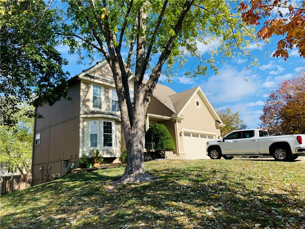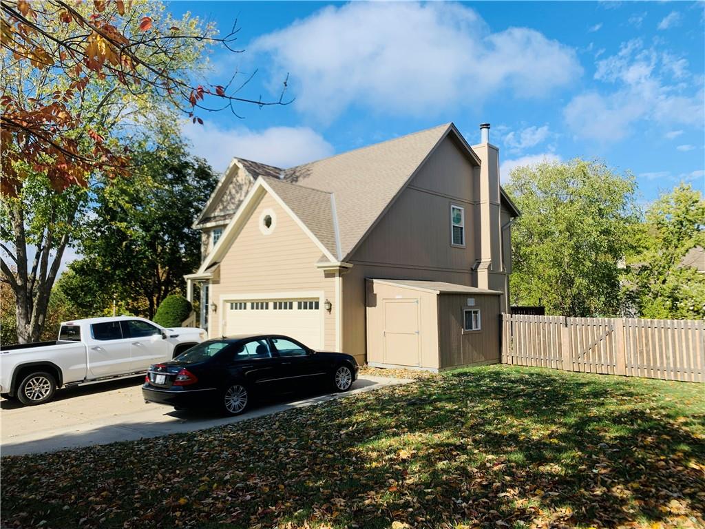 This beautifully maintained 4-bedroom, 3 1/2-bathroom home is situated on a spacious corner lot with a 2-car garage and additional driveway pad for extra parking. The updated kitchen features modern cabinetry, quartz countertops, a stylish tile backsplash, and stainless steel appliances, making it perfect for both everyday meals and entertaining. The kitchen opens into the inviting family room, which includes a gas fireplace and built-in shelving. The main floor also offers a versatile bonus room that can serve as a home office, den, or playroom. Upstairs, the generous primary suite boasts an updated en-suite bath with double vanities, vinyl plank flooring, and a walk-in closet. Conveniently located on the bedroom level, the laundry room makes chores a breeze, and the bonus attic storage adds extra space for your belongings. The finished lower level offers additional living space, featuring new carpet, a wet bar, and a second family room. There’s also room for a 5th non-conforming bedroom with a full bathroom in place, offering great potential for guests or multi-generational living. Step out from the lower level to a patio and enjoy the large, fenced backyard—perfect for pets and children. Other highlights include fresh interior and exterior paint, upgraded siding, newer HVAC and hot water heater, and a bonus shed that blends with the home for extra storage. Located near Zona Rosa, excellent schools, and with easy highway access, this home offers great convenience for shopping, dining, and commuting. Move-in ready and priced to sell—schedule your showing today!