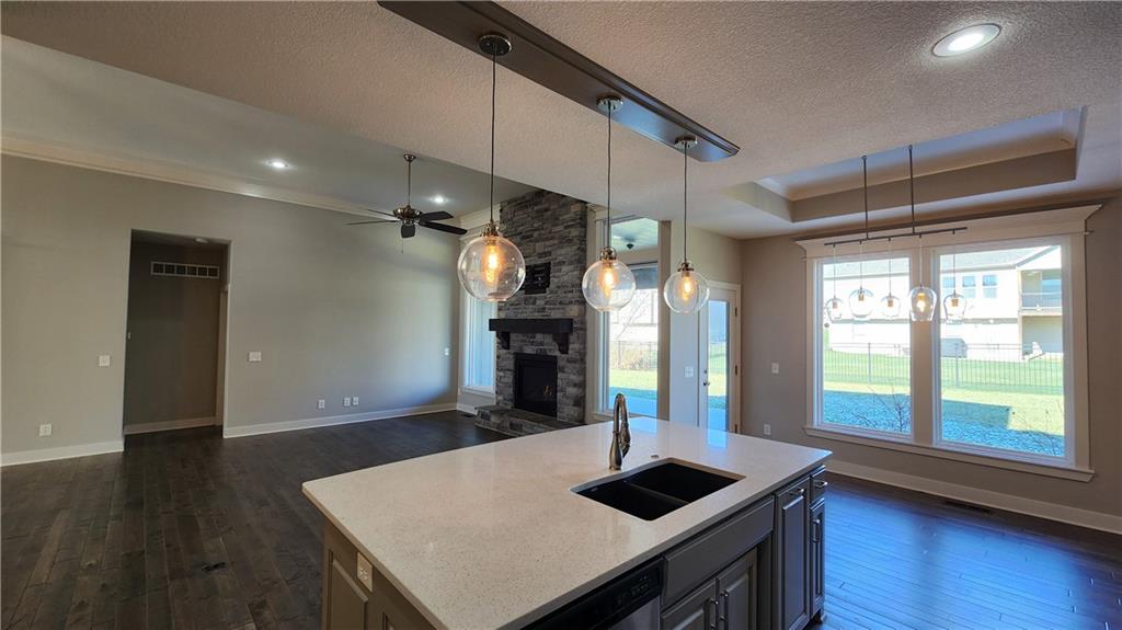 This is the Franklin Plan. You are going to love this warm and inviting home with the open floor plan and high ceilings on the main level of this beautiful 4 bedroom home! The location of this house is absolutely perfect. You will be close to the airport and Zona Rosa, and close to major highways. This like new home includes 2 bedrooms on the main level, and 2 bedrooms in the basement, each with walk in closets and egress windows. Also in the basement is a large great room with a wet-bar complete with a refrigerator and ample cabinets. The gourmet kitchen includes stainless appliances with a built in oven and microwave, along with a 6 burner gas cooktop. The fenced back yard includes a covered patio right off the dining area. As you enter the kitchen from the garage, there is a good size pantry. The laundry is located right off the primary bedroom. Seller had the AC recently replaced. Washer/Dryer and large stainless refrigerator all stay. Seller is providing a one year Cinch Home Warranty for your protection.