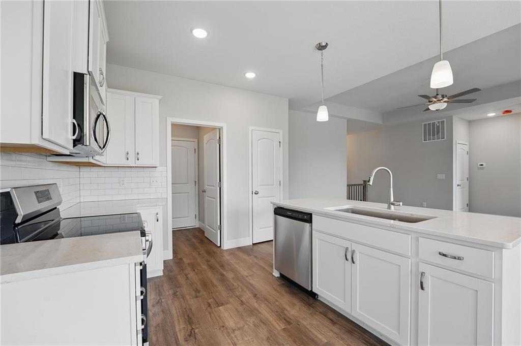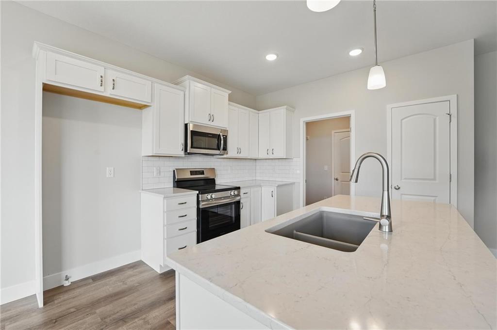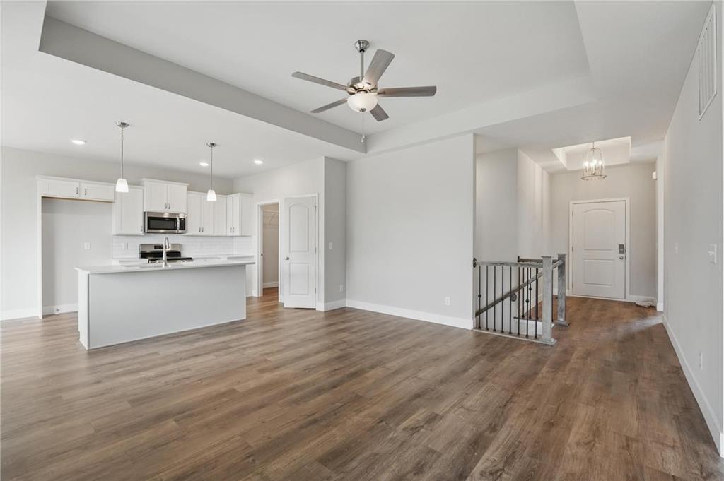 At the heart of the home is an inviting open-concept layout connecting the kitchen, living, and dining areas—ideal for everyday living and entertaining. The kitchen features sleek quartz countertops, stainless steel appliances, and a large island, blending modern design with everyday functionality.