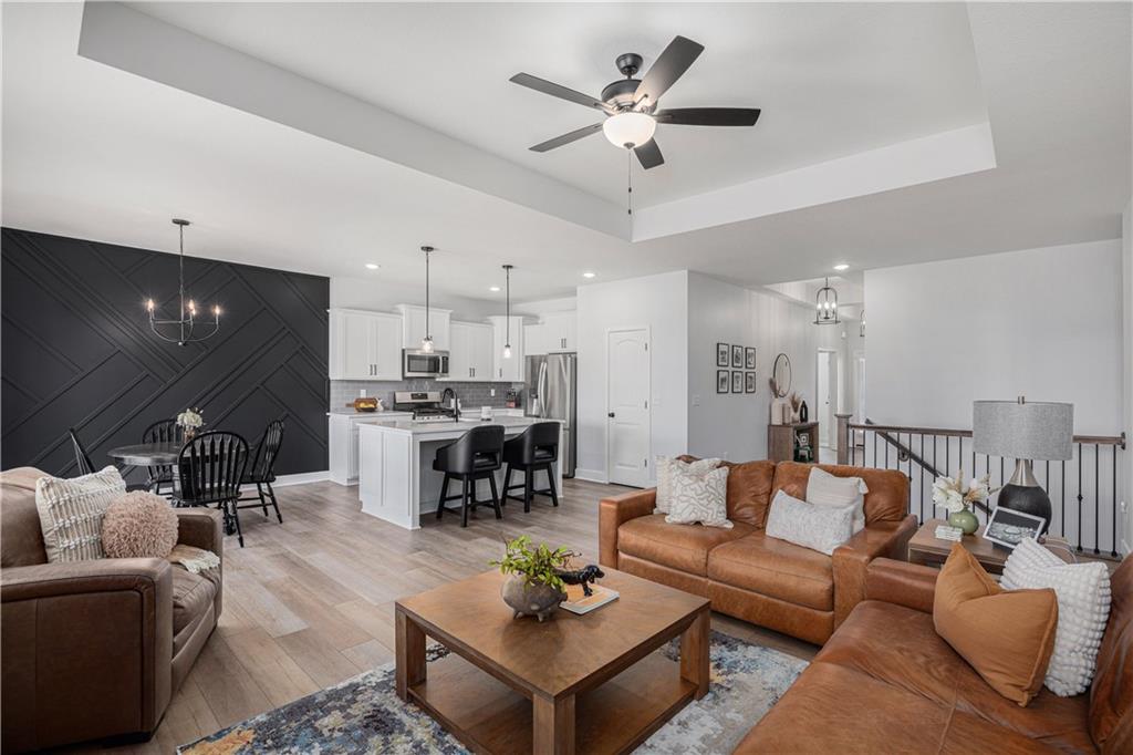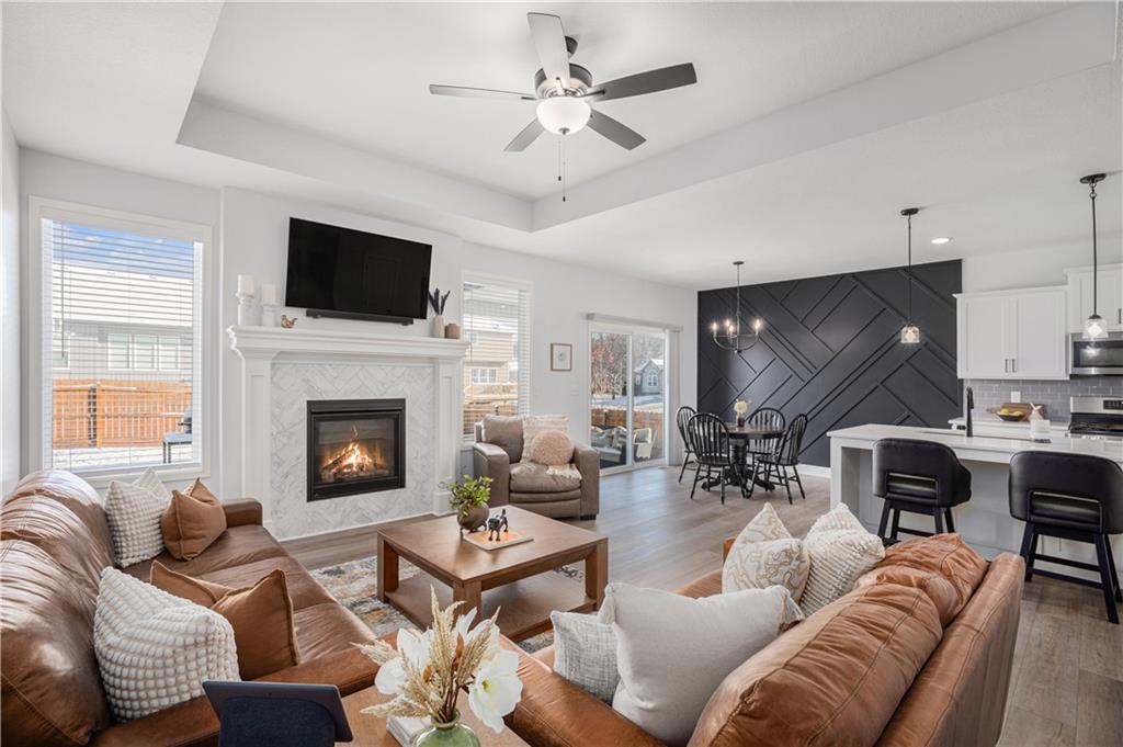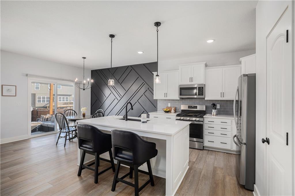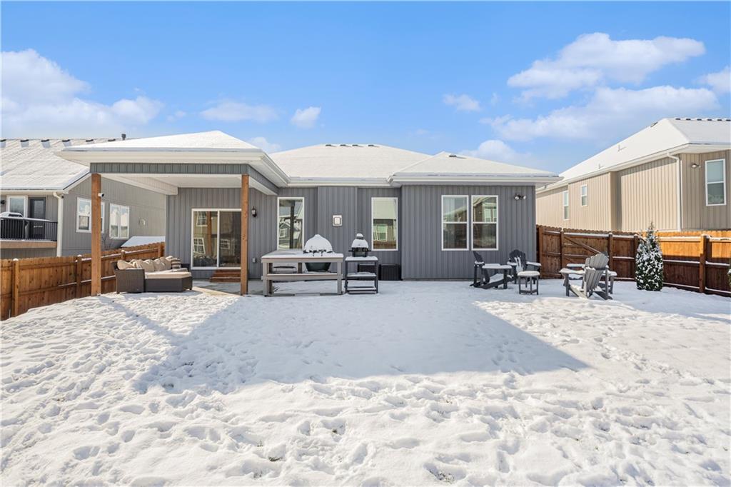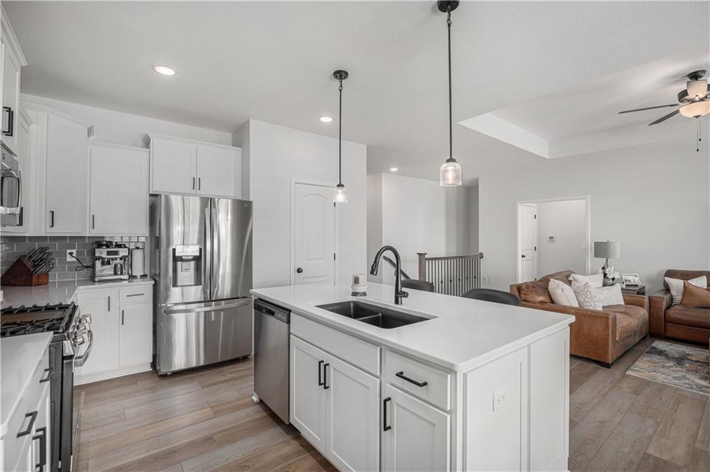 Why settle for new when you can embrace the elegance of this beautifully upgraded home, built in 2022. Step inside to discover a light, bright, and airy ambiance that creates an irresistible invitation to unwind and relax. This stunning residence features 4 spacious bedrooms and 3 full baths, complemented by an attached two-car garage and a fully fenced, beautifully landscaped yard that offers both privacy and curb appeal. As you enter through the front door, you’ll be greeted by soaring high ceilings, gleaming wood floors, and an open floor plan that seamlessly flows throughout. The heart of the home is the expansive white kitchen, showcasing luxurious quartz countertops and a chic grey tile backsplash. The oversized island provides additional seating, while a walk-in pantry, gas stove, and stainless steel appliances complete this chef’s paradise. The kitchen elegantly opens to a sunlit living room adorned with a tiled fireplace, floor-to-ceiling windows, and a charming dining area featuring an accent wall that adds character and warmth. Your primary suite is conveniently located on the main level, offering a generously sized bath with a double vanity, a spacious shower, and a walk-in closet that dreams are made of. Two additional bedrooms and a full bath are also located on the main floor, ensuring comfort and convenience. Don’t forget the thoughtfully designed laundry and mudroom, situated off the primary suite. Venture downstairs to the amazing newly finished lower level, where a cozy family room awaits, complete with a newly installed wet bar, a full bedroom, and an additional bathroom. There’s even an unfinished storage space for all your organizing needs! Step outside to an extended patio surrounded by a privacy fence, making this yard a perfect 10 out of 10. Nestled in the highly sought-after Platte County School District, this home is part of a vibrant community that offers a pool, playground, and scenic trails.