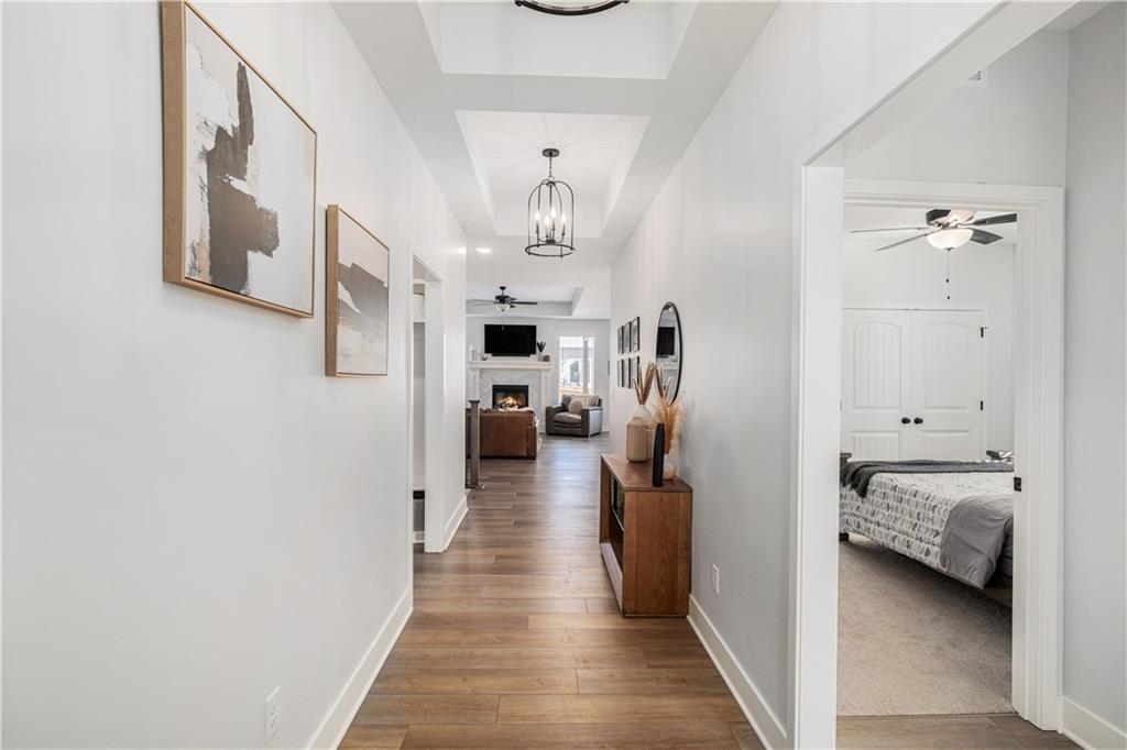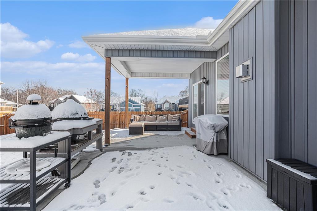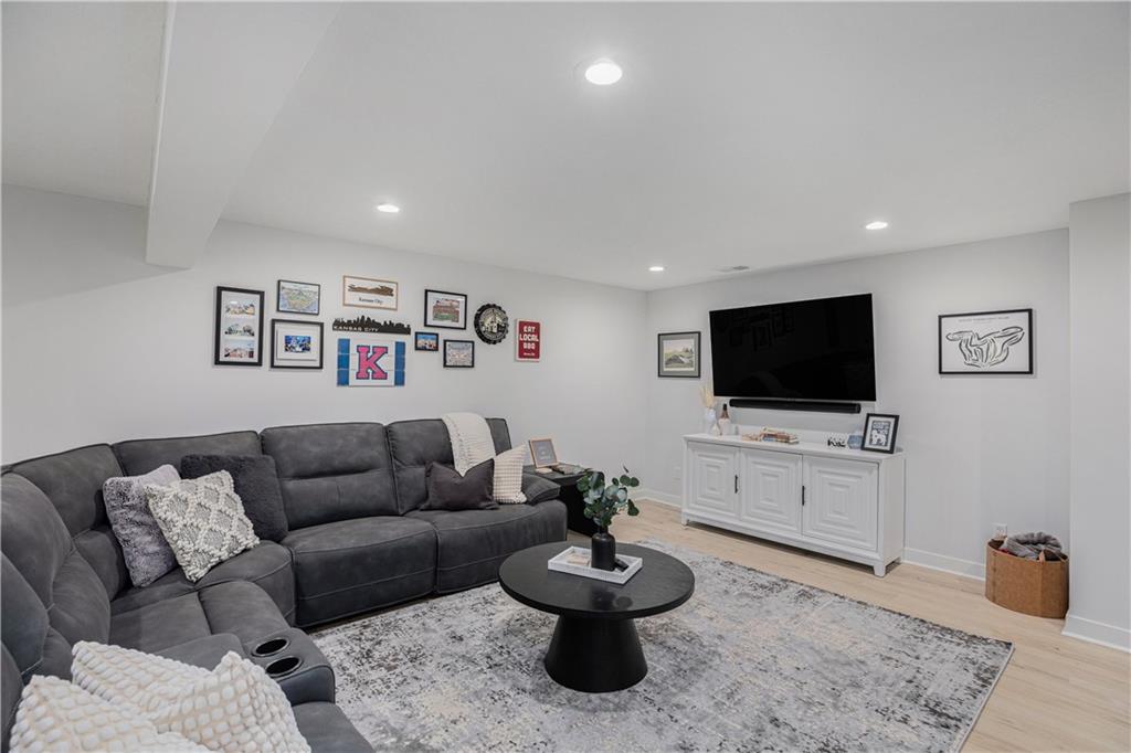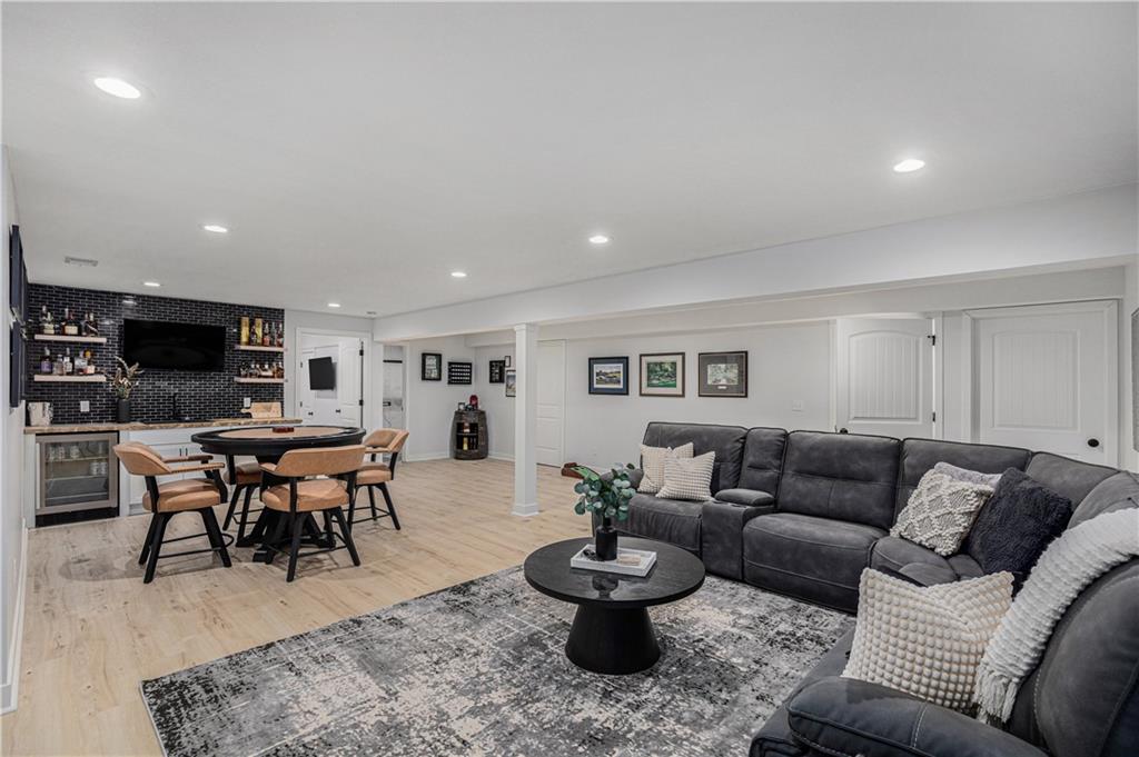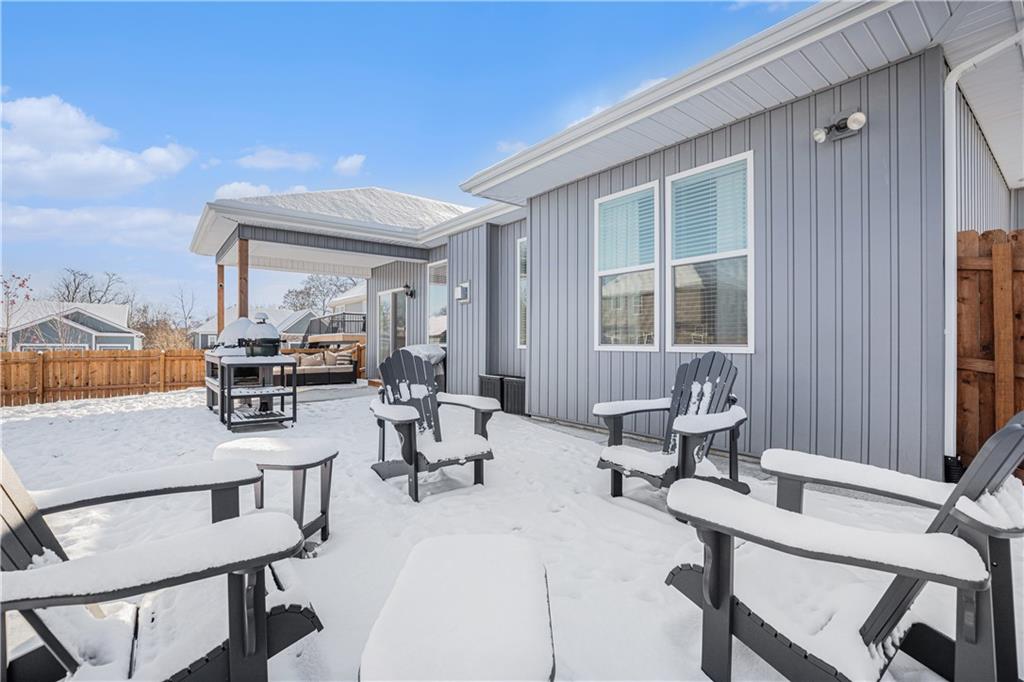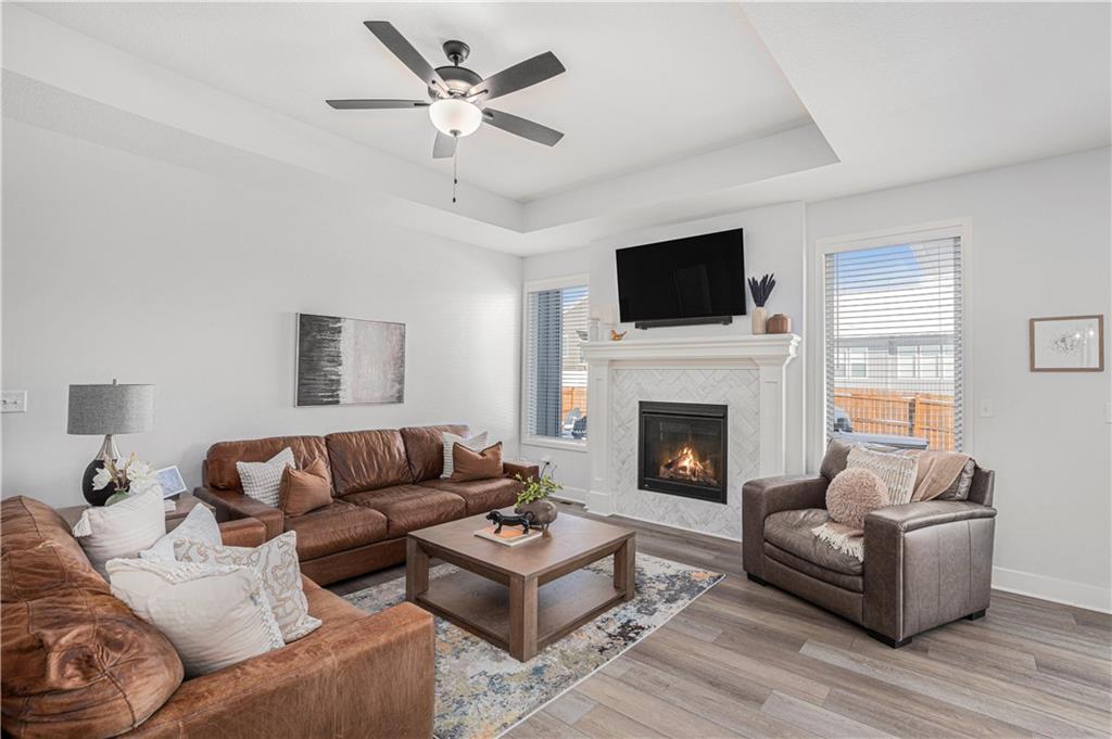 Why settle for new when you can embrace the elegance of this beautifully upgraded home, built in 2022. Step inside to discover a light, bright, and airy ambiance that creates an irresistible invitation to unwind and relax. This stunning residence features 4 spacious bedrooms and 3 full baths, complemented by an attached two-car garage and a fully fenced, beautifully landscaped yard that offers both privacy and curb appeal. As you enter through the front door, you’ll be greeted by soaring high ceilings, gleaming wood floors, and an open floor plan that seamlessly flows throughout. The heart of the home is the expansive white kitchen, showcasing luxurious quartz countertops and a chic grey tile backsplash. The oversized island provides additional seating, while a walk-in pantry, gas stove, and stainless steel appliances complete this chef’s paradise. The kitchen elegantly opens to a sunlit living room adorned with a tiled fireplace, floor-to-ceiling windows, and a charming dining area featuring an accent wall that adds character and warmth. Your primary suite is conveniently located on the main level, offering a generously sized bath with a double vanity, a spacious shower, and a walk-in closet that dreams are made of. Two additional bedrooms and a full bath are also located on the main floor, ensuring comfort and convenience. Don’t forget the thoughtfully designed laundry and mudroom, situated off the primary suite. Venture downstairs to the amazing newly finished lower level, where a cozy family room awaits, complete with a newly installed wet bar, a full bedroom, and an additional bathroom. There’s even an unfinished storage space for all your organizing needs! Step outside to an extended patio surrounded by a privacy fence, making this yard a perfect 10 out of 10. Nestled in the highly sought-after Platte County School District, this home is part of a vibrant community that offers a pool, playground, and scenic trails.