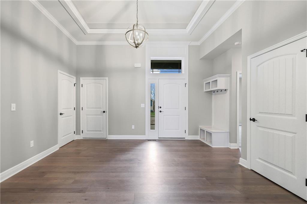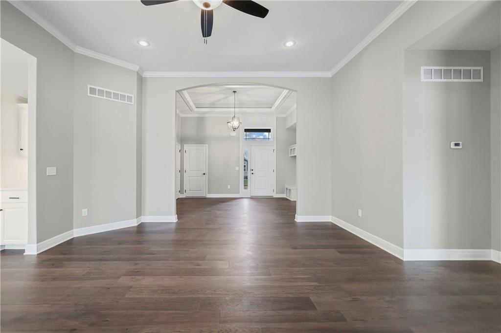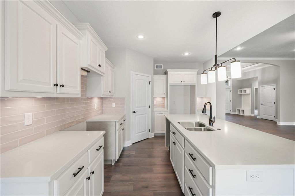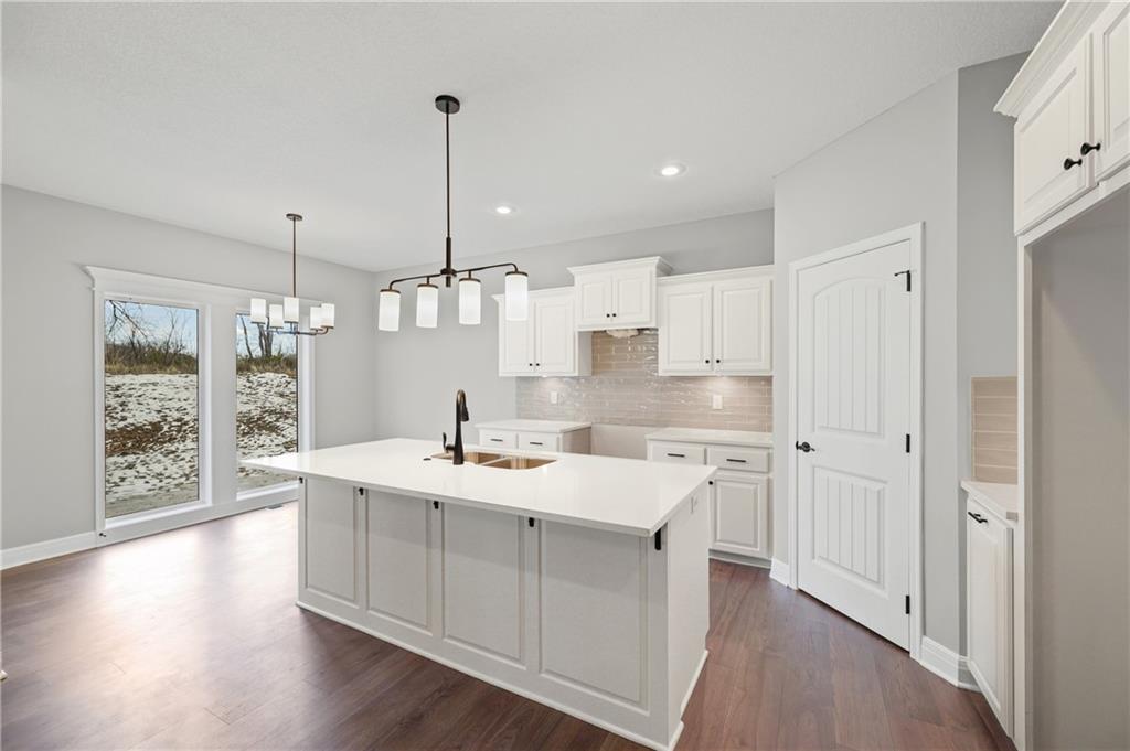 The Richmond by Hoffmann Custom Homes — a true ranch where stylish design meets effortless living. This home is ready and photos are of the actual home. The floor plan features a striking entryway, a spacious great room with soaring ceilings, and an open-concept kitchen with dark engineered hardwood floors, creamy white enameled cabinets, fresh modern lighting, and a large island topped with light quartz. A covered deck sits just off the dining area for convenient outdoor access. Built with 2×6 exterior wall construction, this home is engineered for durability and energy efficiency. It comes pre-wired for easy solar panel installation and includes an EV charger receptacle, and additional energy-efficient upgrades. A 10-year structural warranty provides added peace of mind. The lower level is stubbed for a future bathroom, offering flexibility for later expansion. Located within the top-rated Platte County School District.