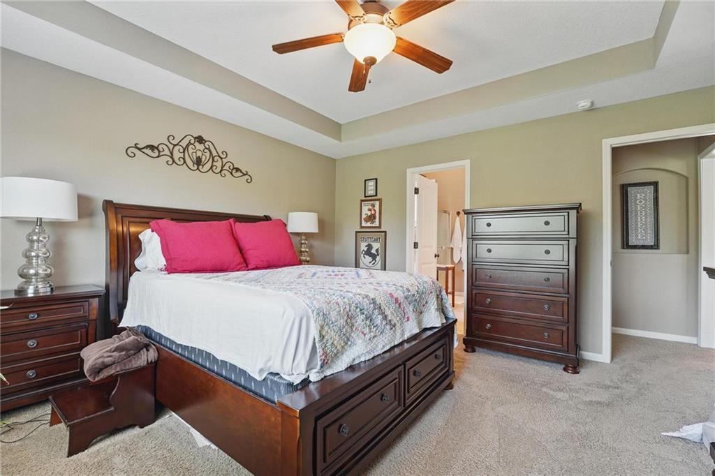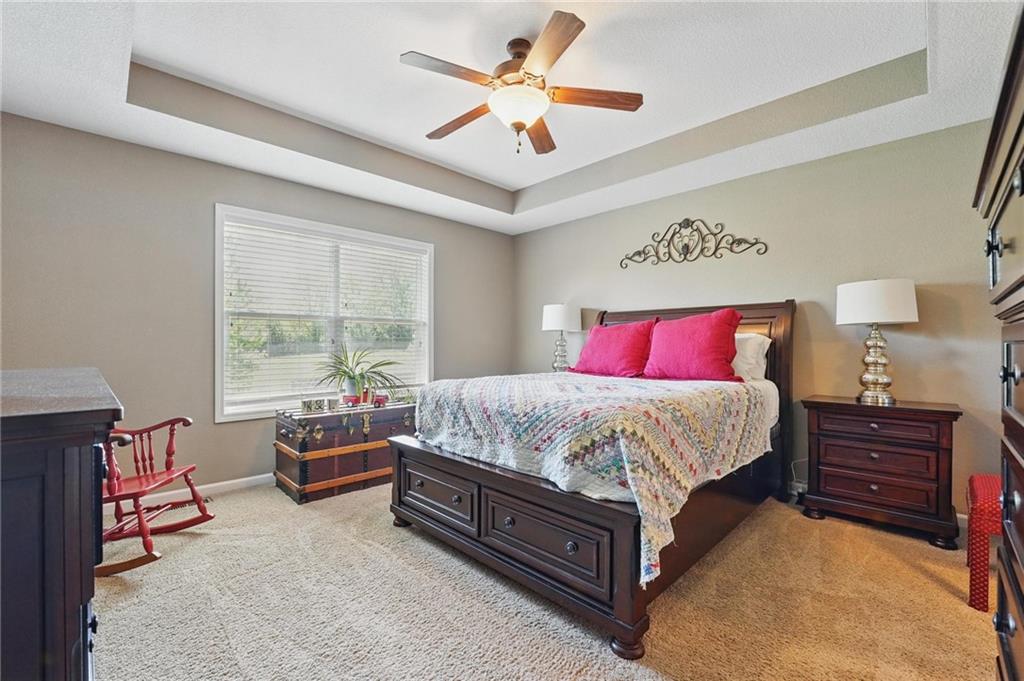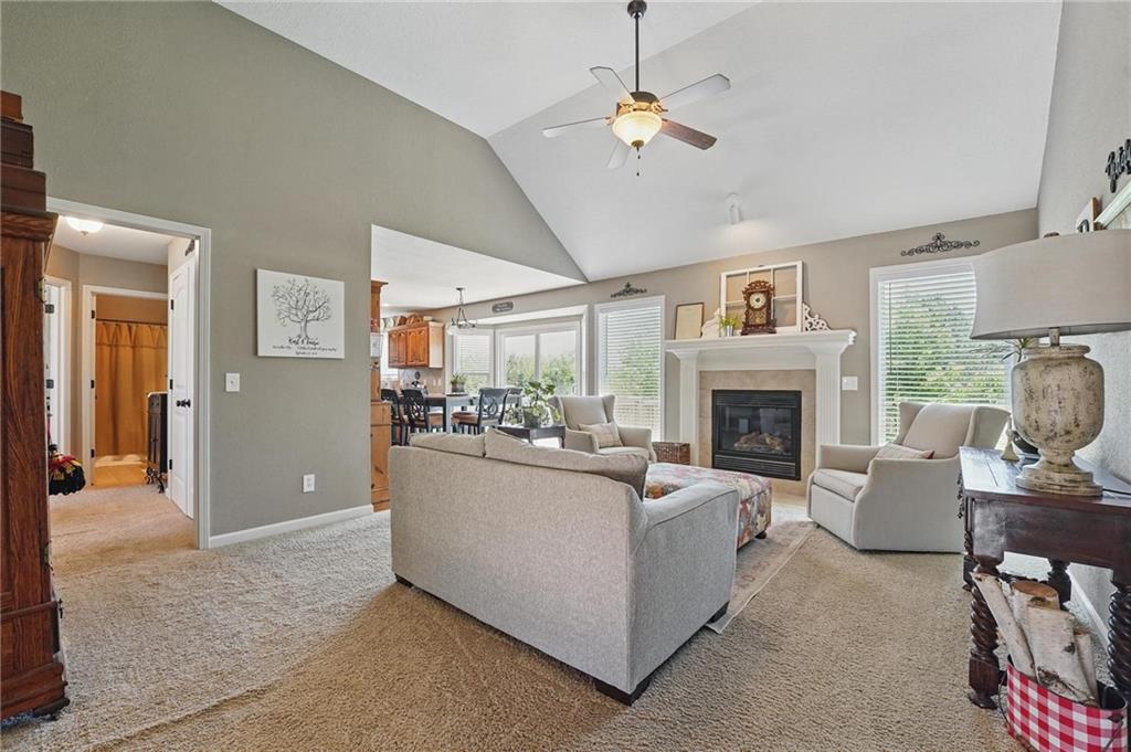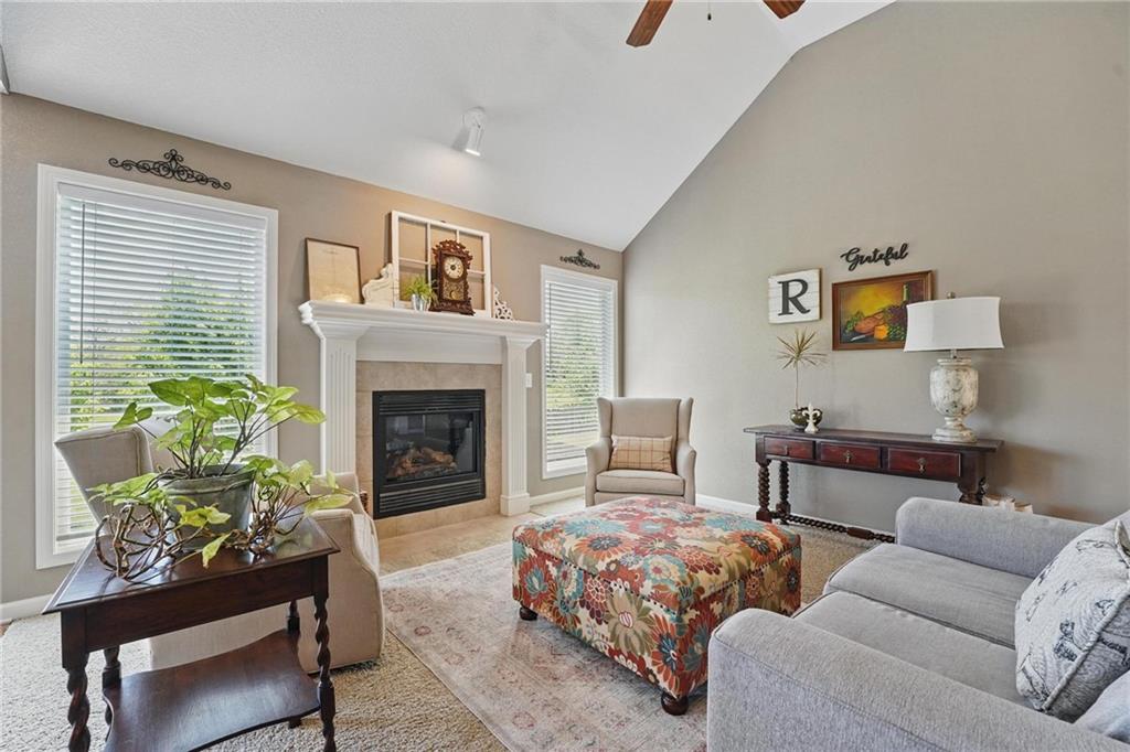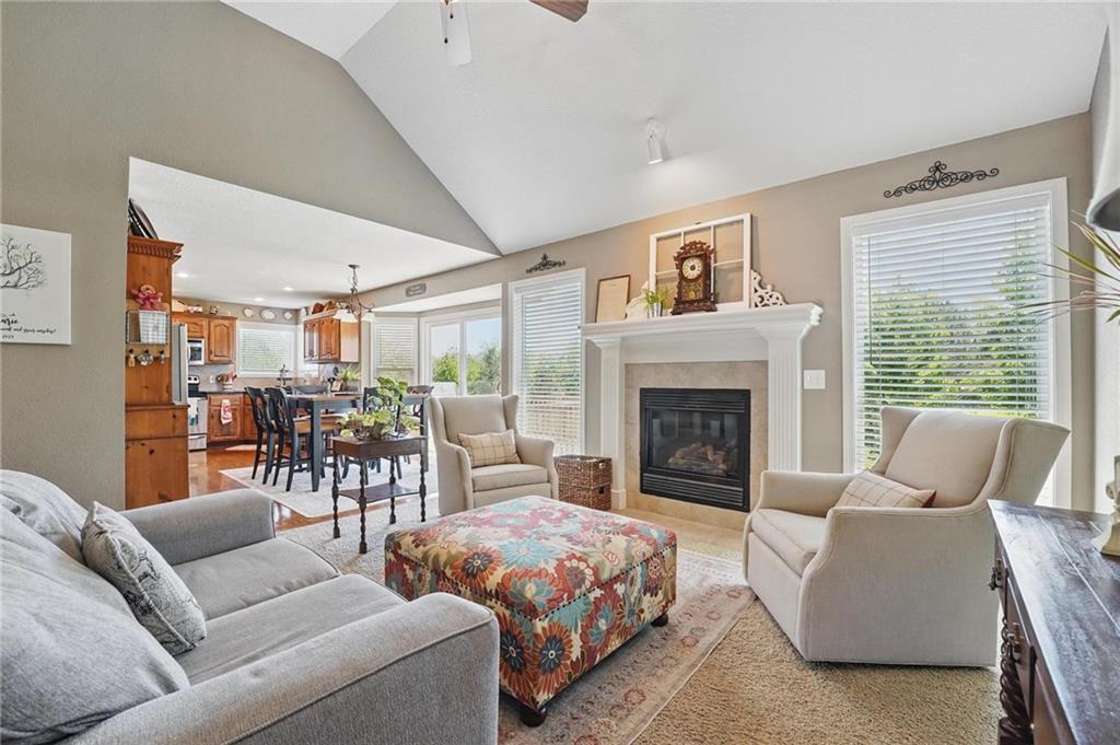 At the heart of the home is a gorgeous kitchen boasting granite countertops, stainless steel appliances, a closet pantry, and gleaming hardwood floors. The vaulted great room is filled with natural light and offers scenic views of green space, mature trees, and nearby walking trails. A gas fireplace adds a warm, welcoming focal point.