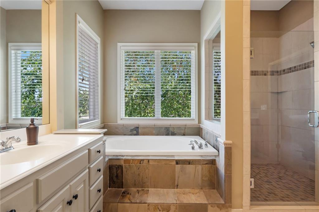 The chef’s kitchen features premium appliances, granite counters, and rich cabinetry, flowing seamlessly into the dining and great room. The main-level primary suite offers a spa-inspired retreat with dual vanities, soaking tub, walk-in shower, and custom closet. A secondary suite on the main floor provides flexibility for guests or office use.