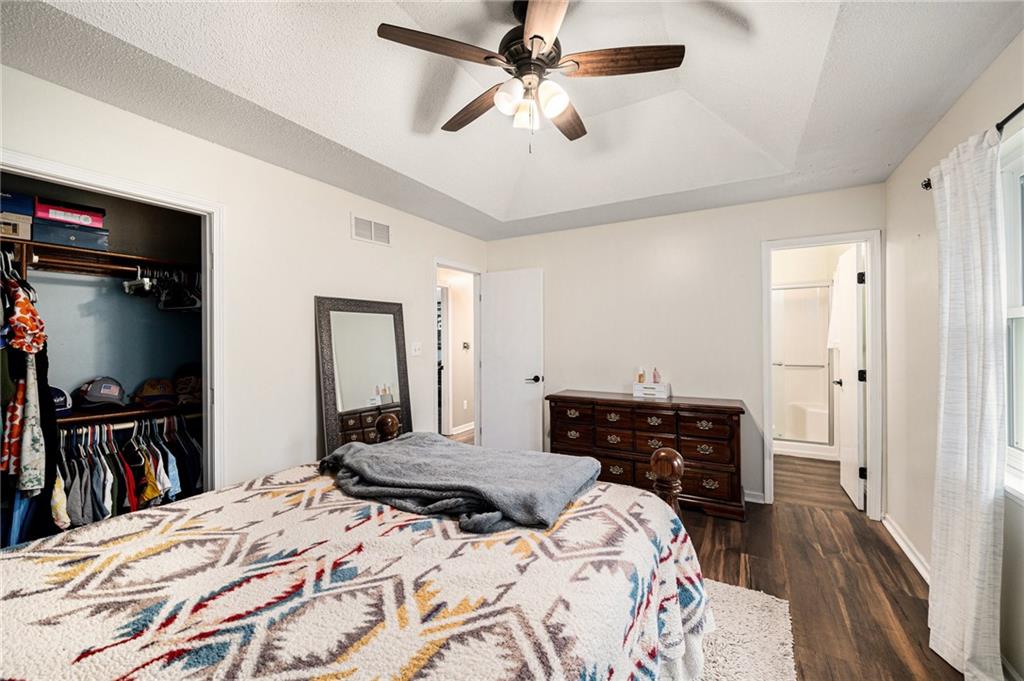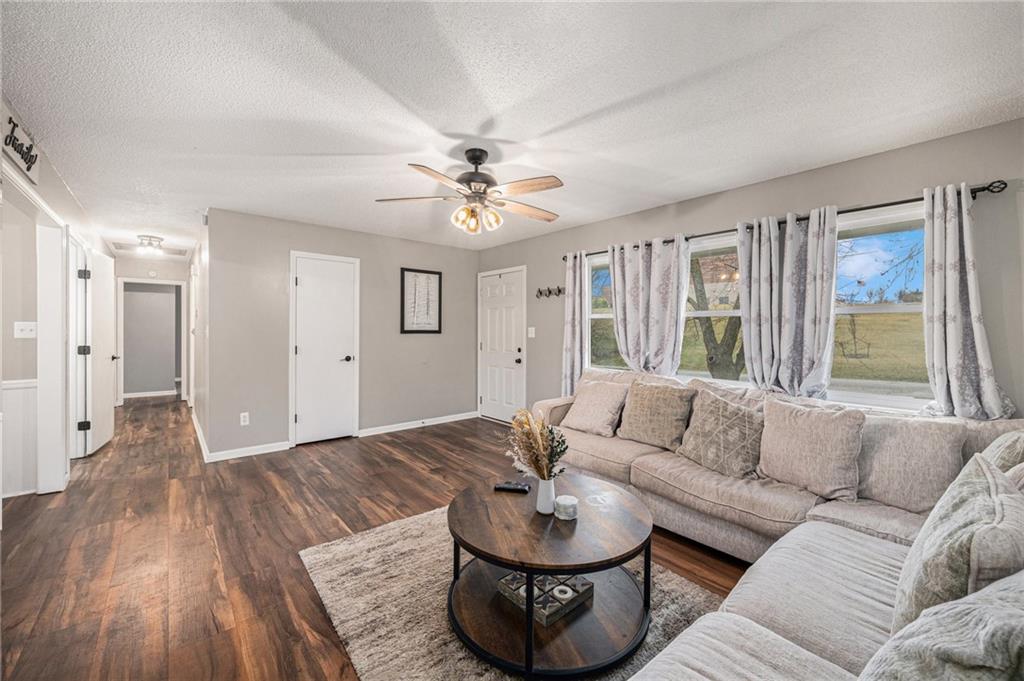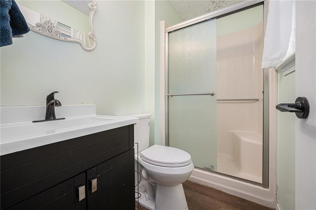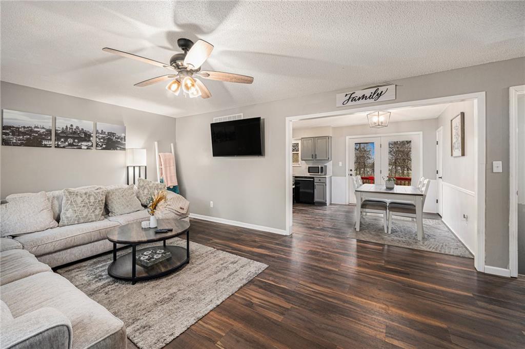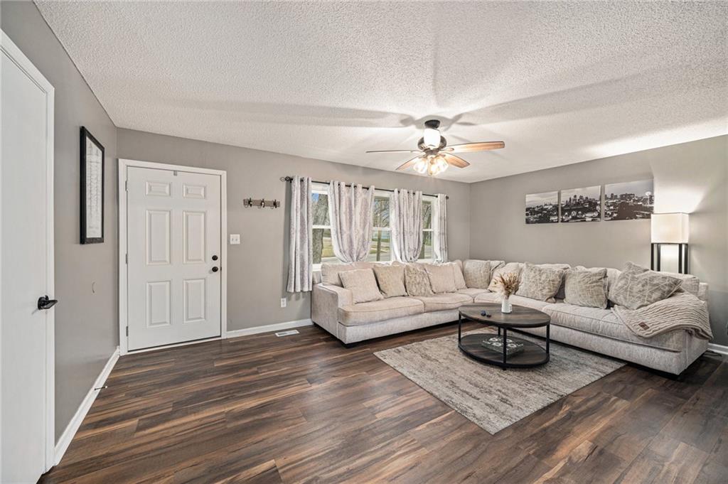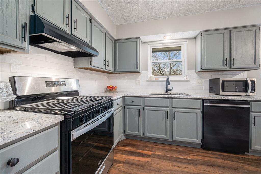 A fresh exterior paint job and mature trees give this home great curb appeal, while the large backyard features a storage shed for all your gardening and lawn tools. Inside, the spacious living room boasts modern vinyl plank flooring and neutral tones, making it easy to decorate to your style. The updated kitchen includes painted cabinets, a subway tile backsplash, granite countertops, stainless steel appliances—including a gas stove—a pantry, and a dining area with direct access to the back deck, perfect for outdoor entertaining.