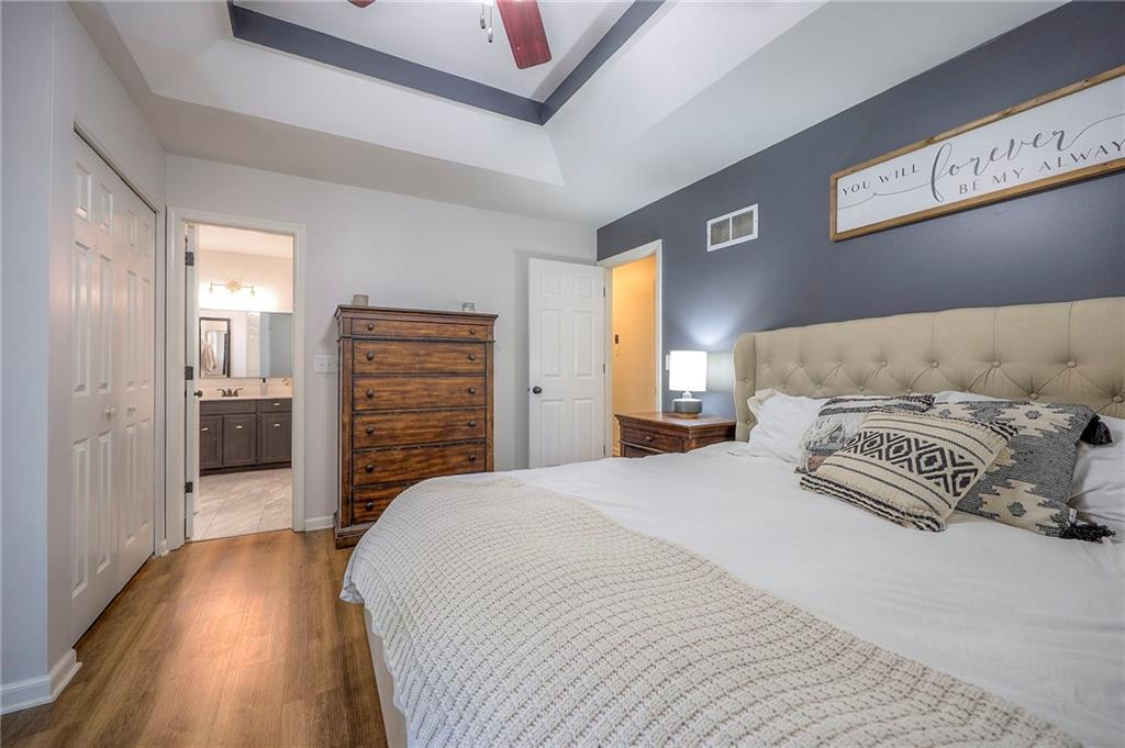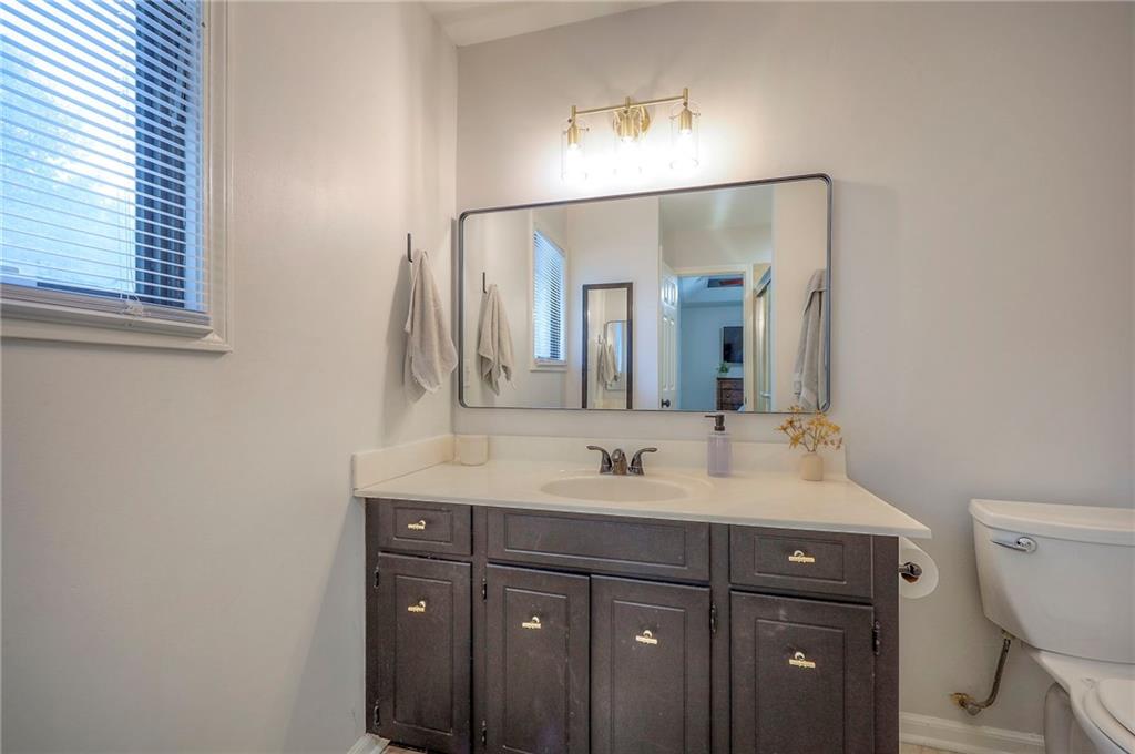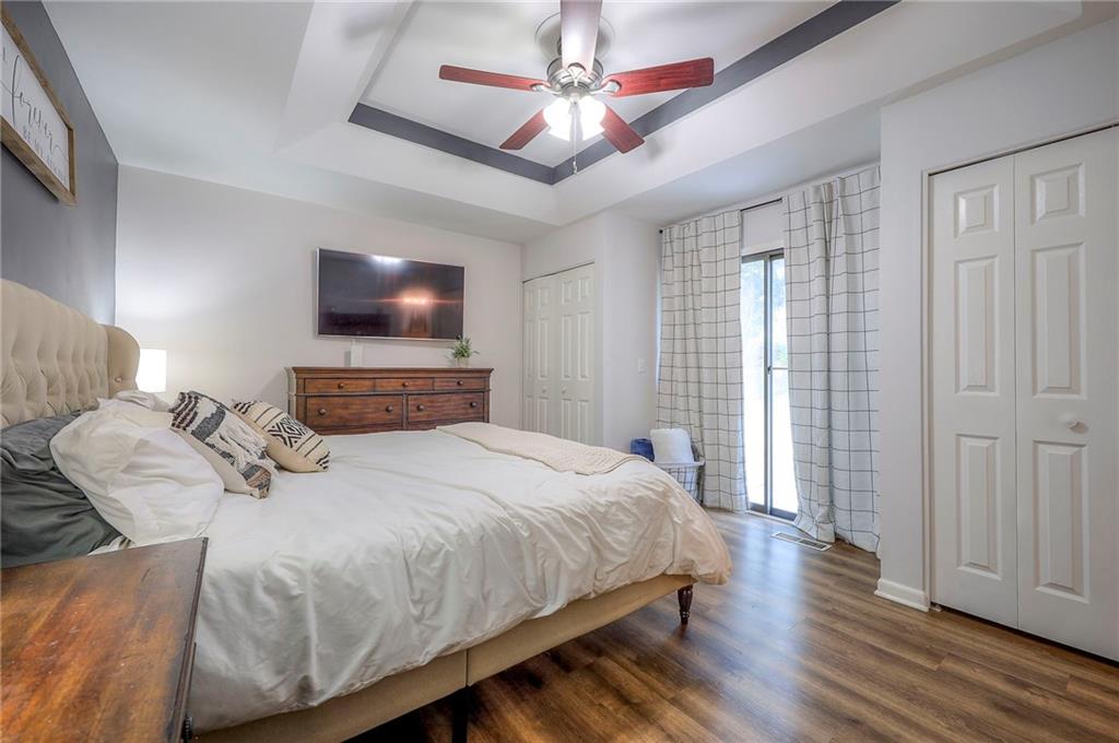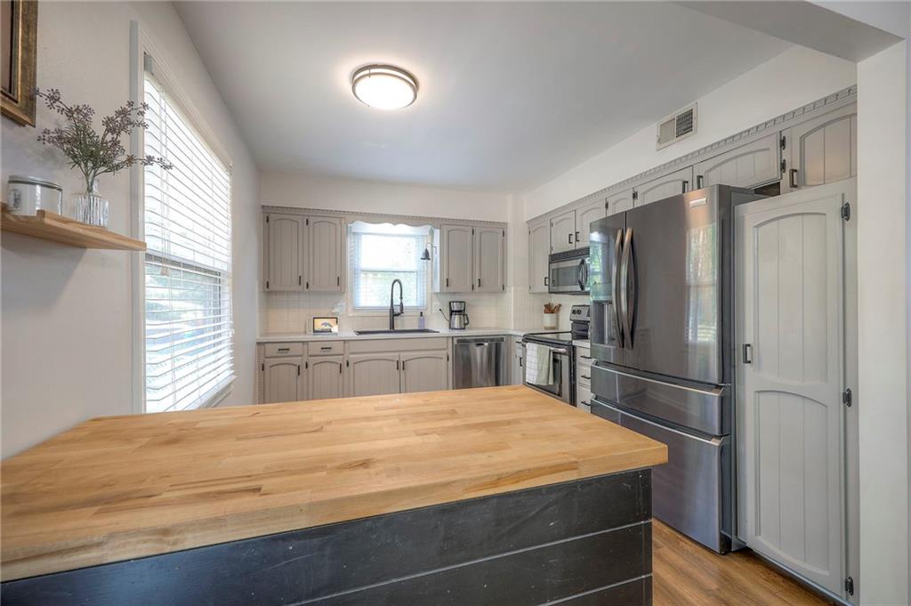 The main level features a private primary suite with direct access to a new patio, a well-appointed primary bath, and two additional large bedrooms served by a full hall bath. The kitchen showcases new countertops, stainless steel appliances, and ample space for dining.