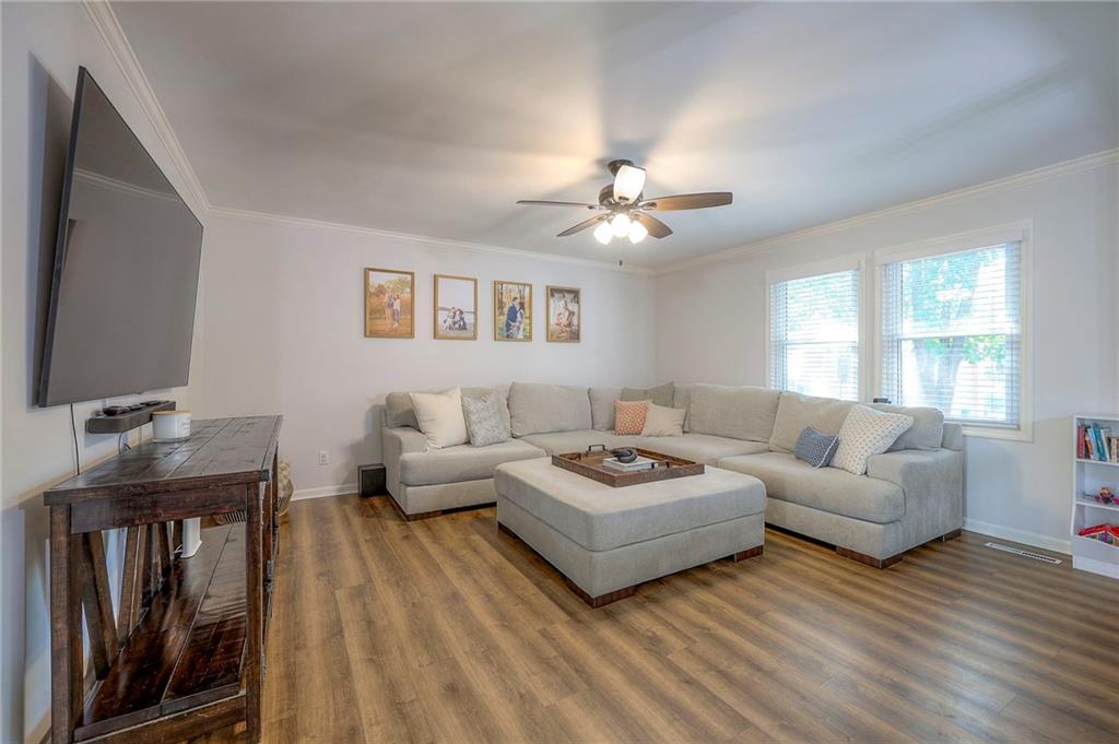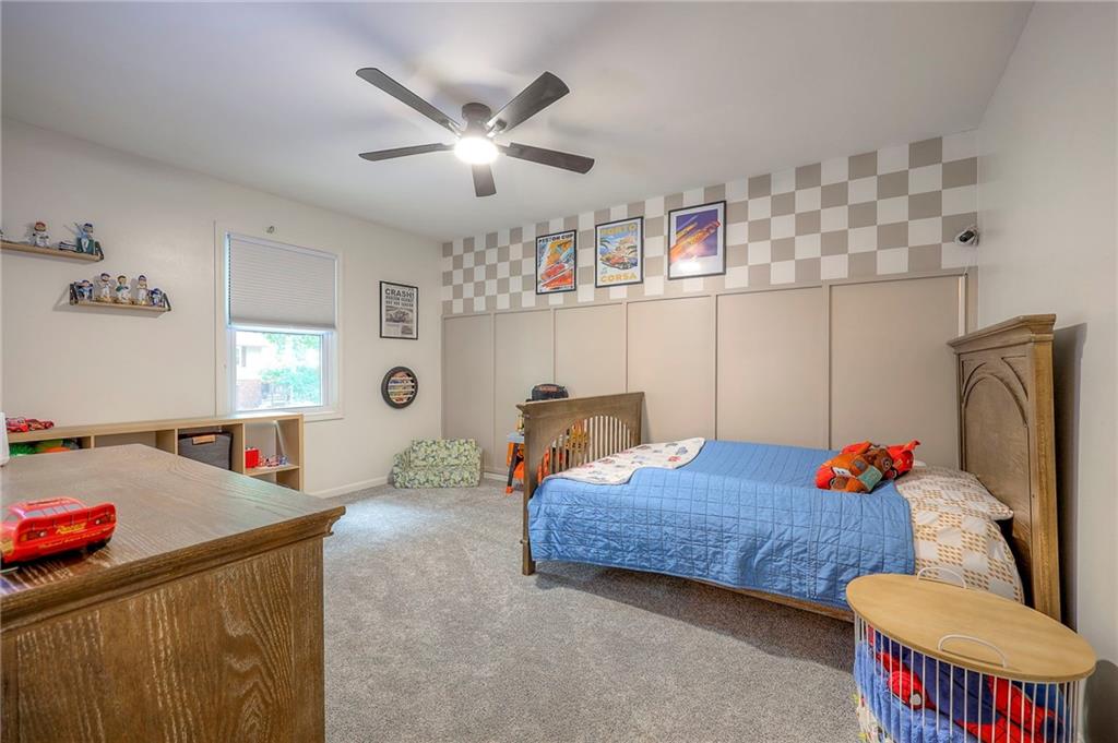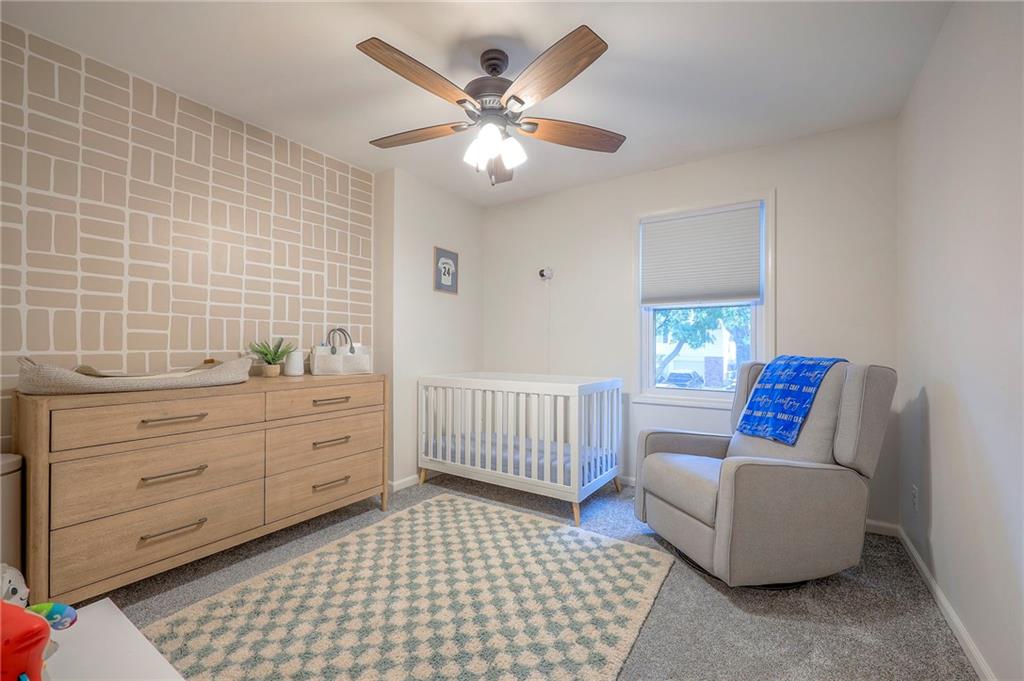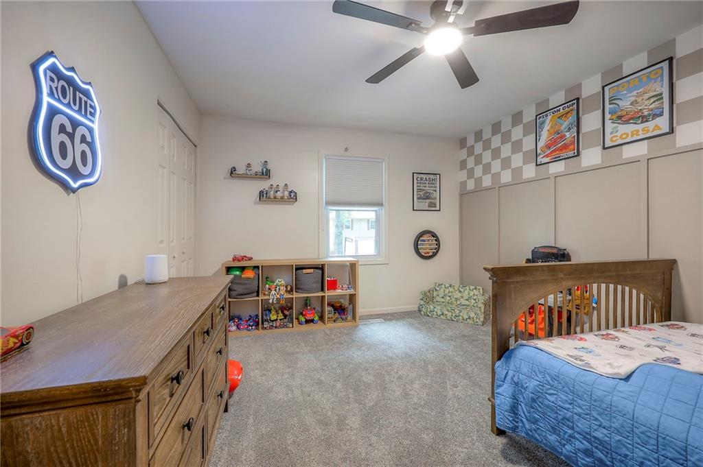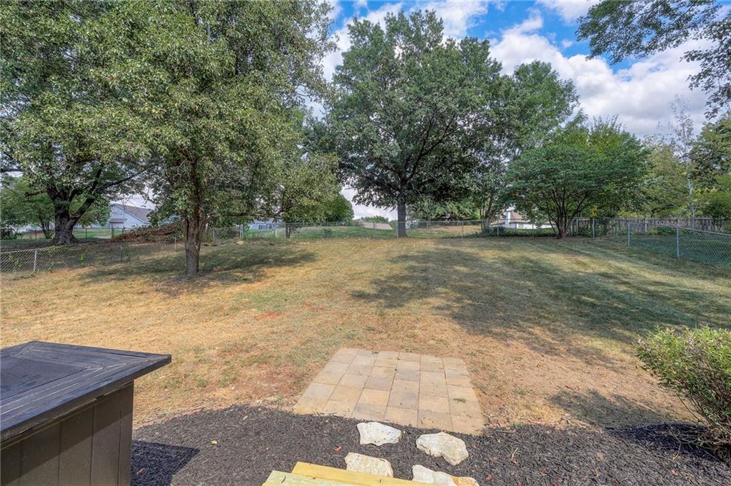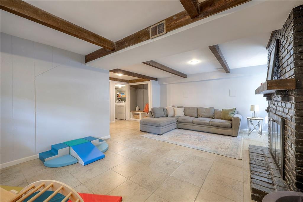 The finished lower level is highlighted by a classic brick fireplace with gas logs, a dedicated laundry area, and abundant storage. Additional highlights include a fenced backyard with mature trees, a Nest thermostat, an attic fan with timer, and a quiet tree-lined street. The home is also located within the desirable Staley High School attendance area, with convenient access to shopping, dining, and entertainment.