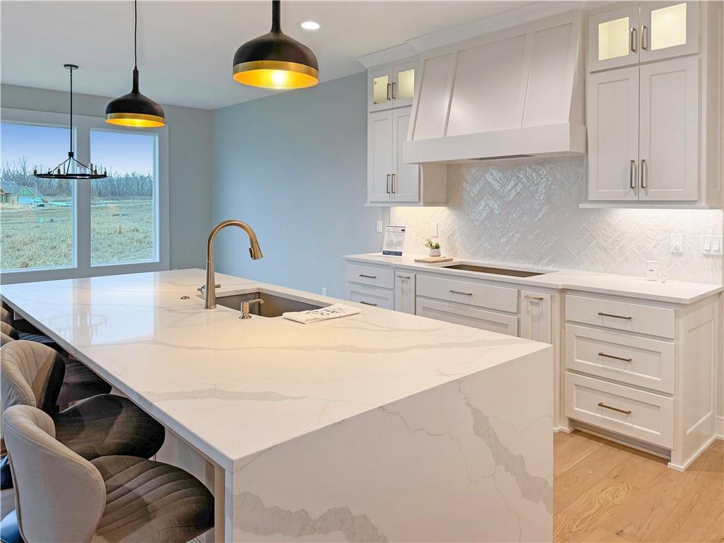 The main floor is designed to impress, featuring an open kitchen that is a chef’s delight. Complete with a built-in custom wine bar, this kitchen is as stylish as it is practical, offering a seamless flow for both everyday living and hosting gatherings. Complete with a large island and a waterfall quartz countertop.