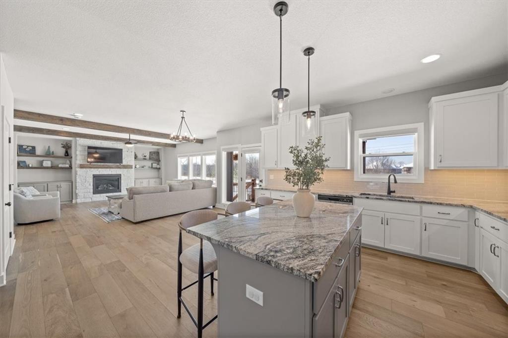 Step inside to discover an open yet defined layout, perfect for both everyday living and entertaining. Gorgeous ceiling beams accent the expansive great room, while the flexible front room, complete with wainscoting, offers space for a formal dining area, home office, or playroom. The kitchen is a showstopper, featuring a convenient coffee bar, stone countertops, and generous storage. Upgrades that truly set this home apart: Designer light fixtures throughout: modern, stylish, and energy-efficient. Beautifully landscaped yard for instant curb appeal and outdoor enjoyment. Newly installed iron rod fencing in backyard. An extended concrete patio ideal for gatherings, grilling, or relaxing.