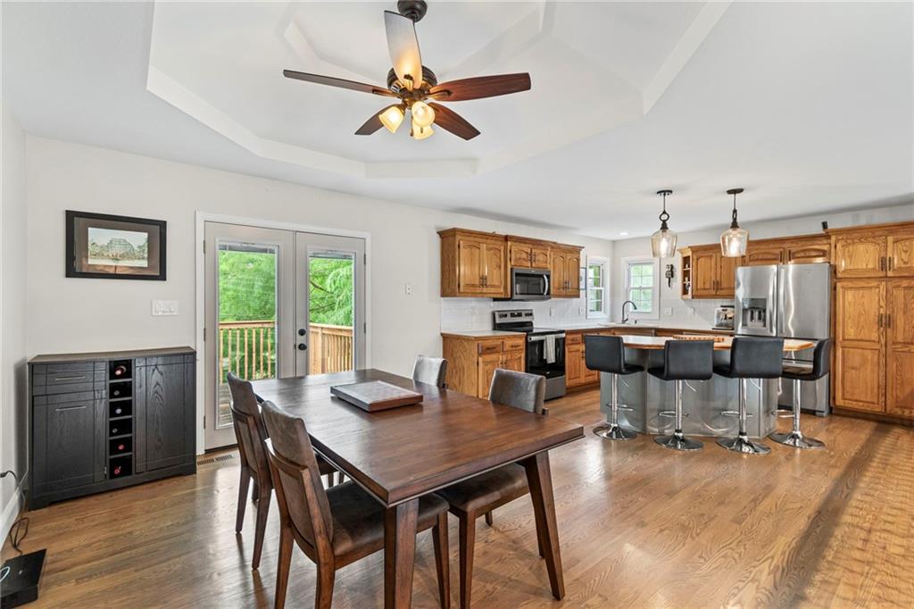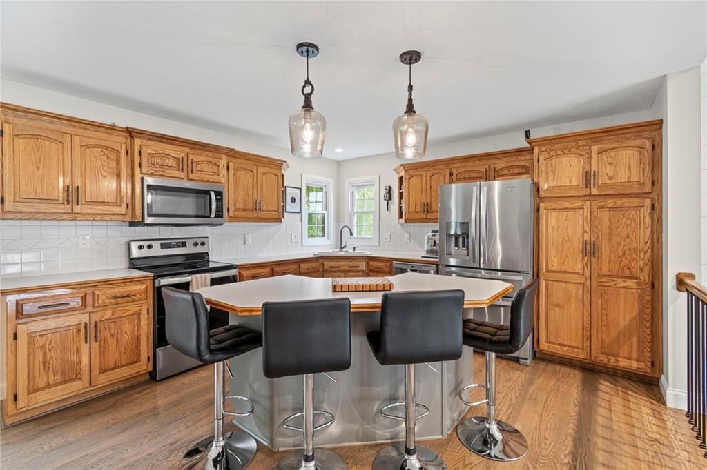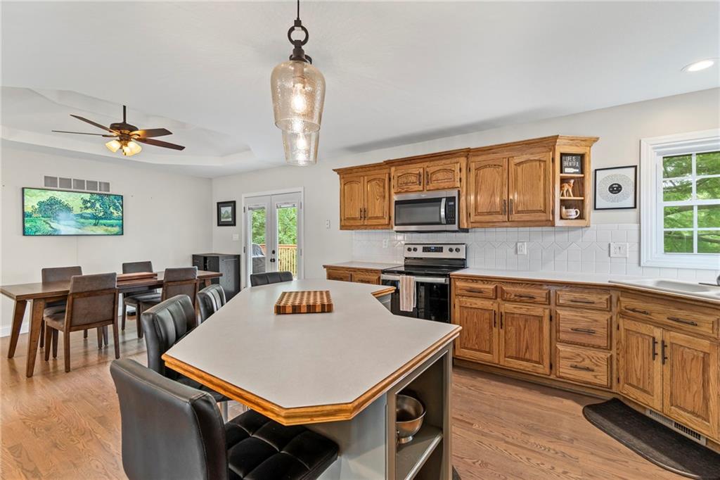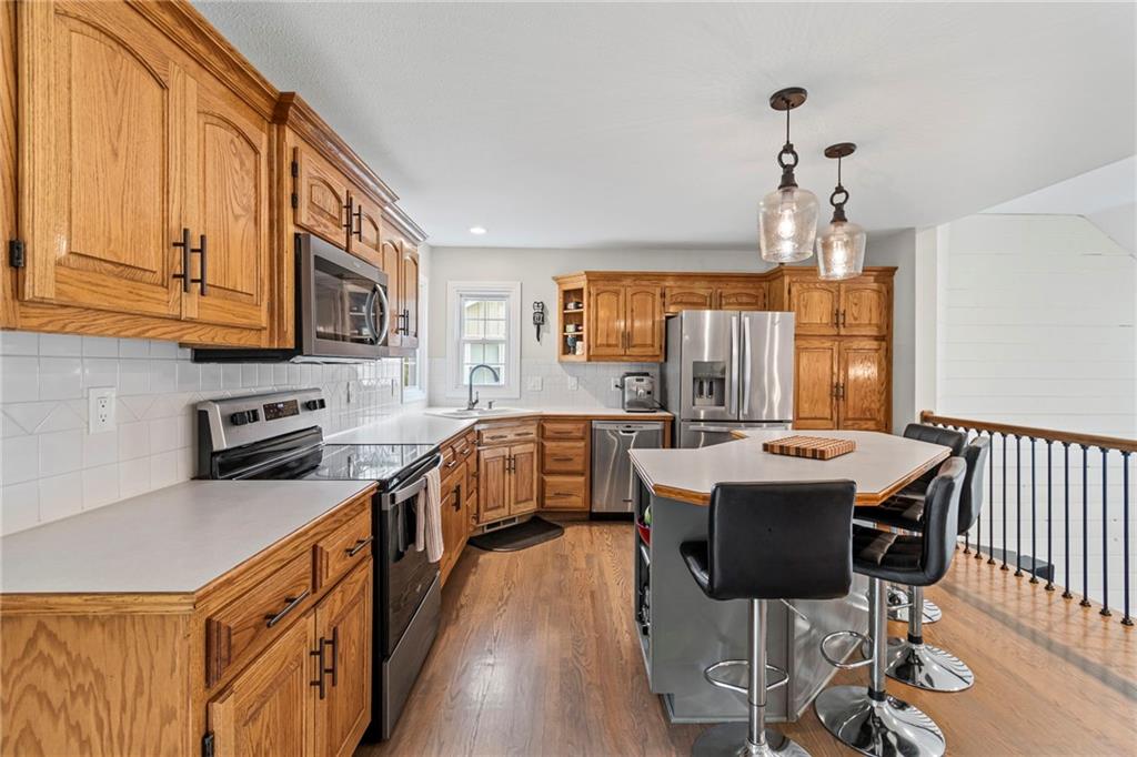 ambiance. The kitchen features solid oak cabinetry, stainless steel appliances, and updated light fixtures making it as