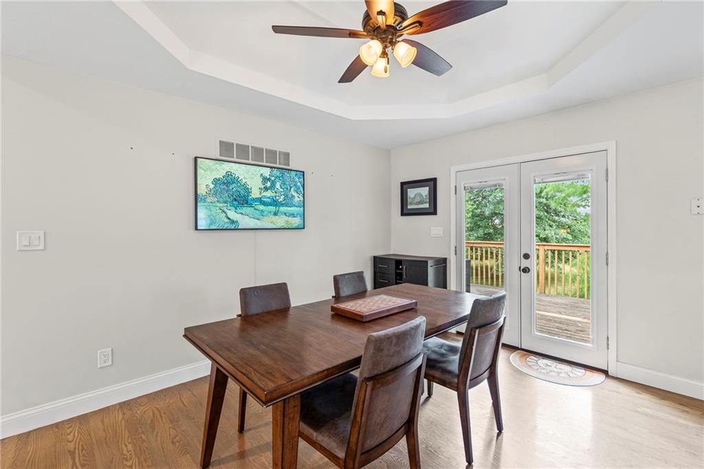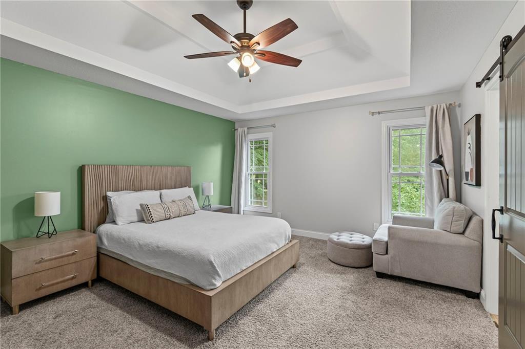 conveniently located between the kitchen and bedrooms. The master features an intricate coffered ceiling w/ an updated
