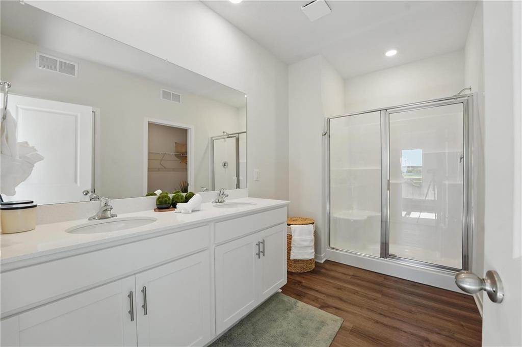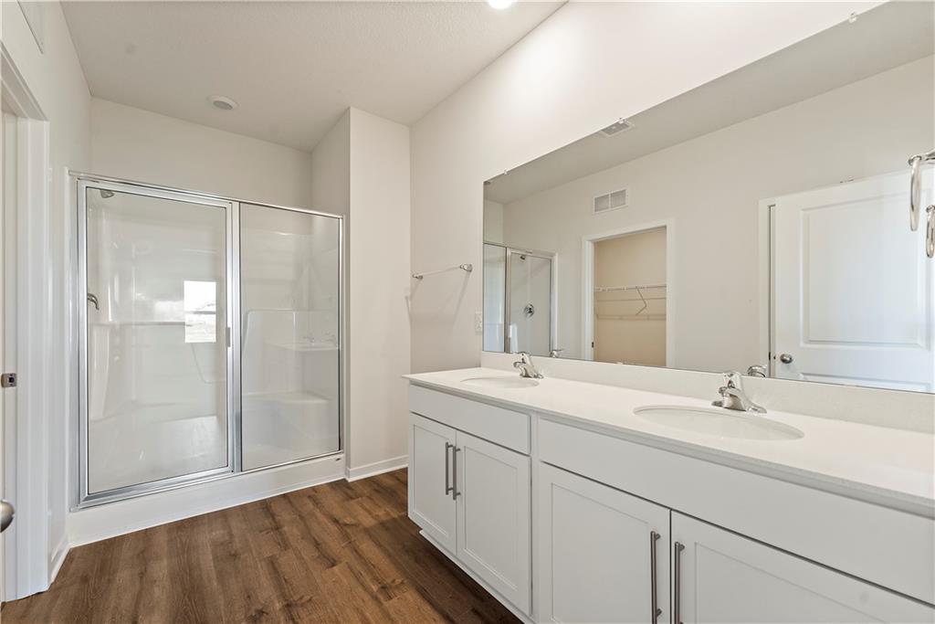 The primary bath boasts a walk-in shower with a framed glass enclosure. Outside of the home is Hardie siding, and the yard comes with an irrigation system.