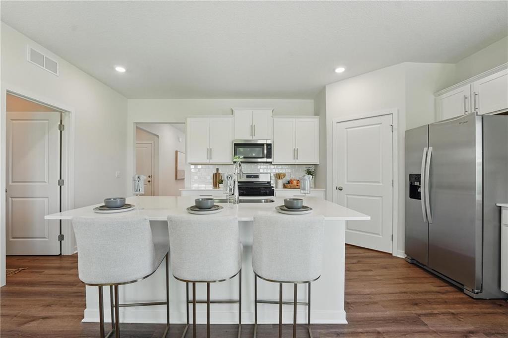 Step inside directly to 9 ft ceilings and an abundance of natural light. The heart of this home is undoubtedly the Chefs Kitchen, featuring gorgeous 36-inch painted maple cabinets, beautiful white quartz countertops, and top-of-the-line Whirlpool® stainless steel appliances.