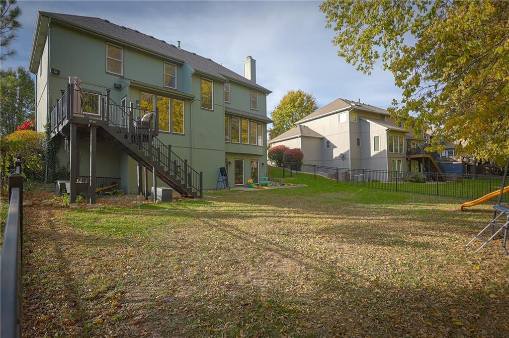Enjoy the attractive metal fencing around the backyard and deck, with plenty of room for family gatherings and outdoor fun. The yard backs to green space and connects to scenic neighborhood trails. Inside, large east-facing windows fill the great room, stairway, and lower-level recreation room with natural light. The traditional kitchen features hardwood flooring, an island, and updated thermal windows overlooking the backyard. Laundry and a powder room are conveniently located off the kitchen.
