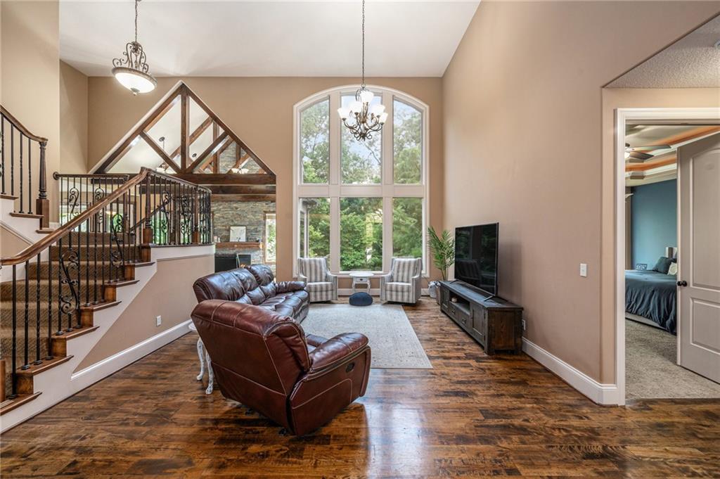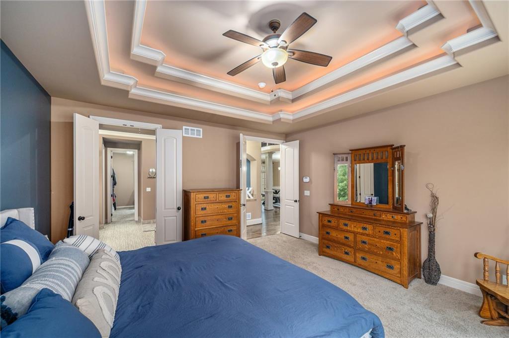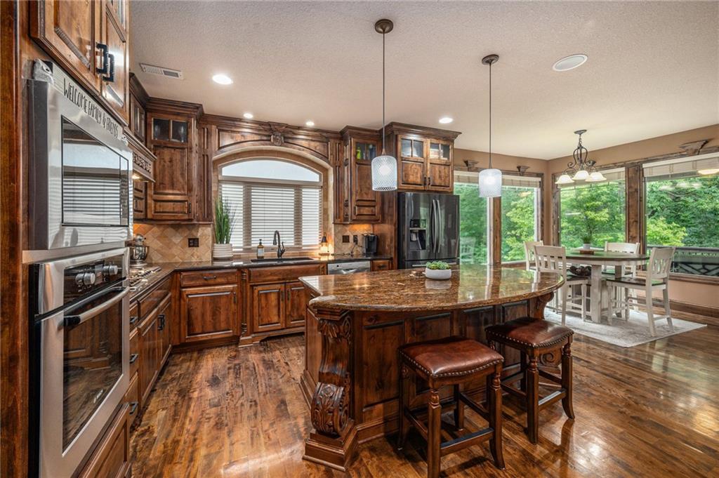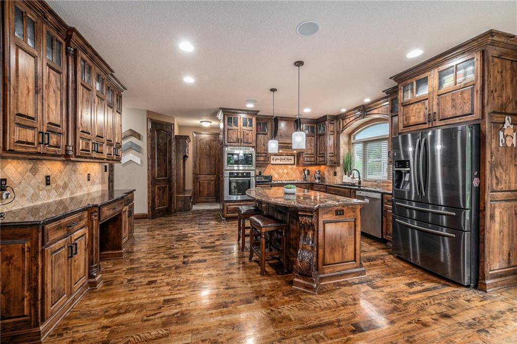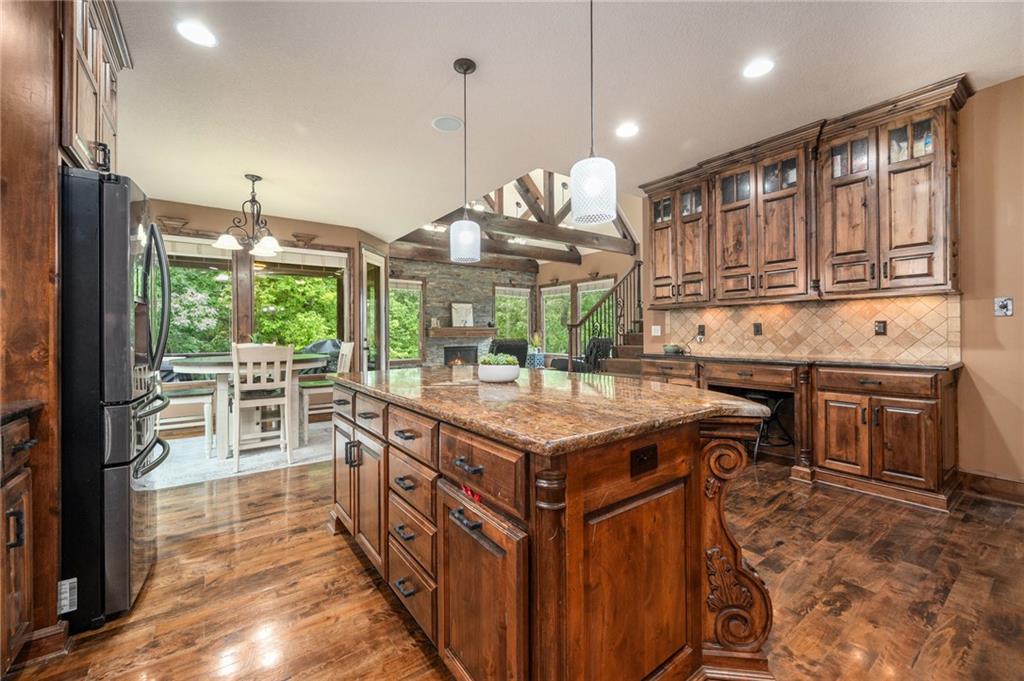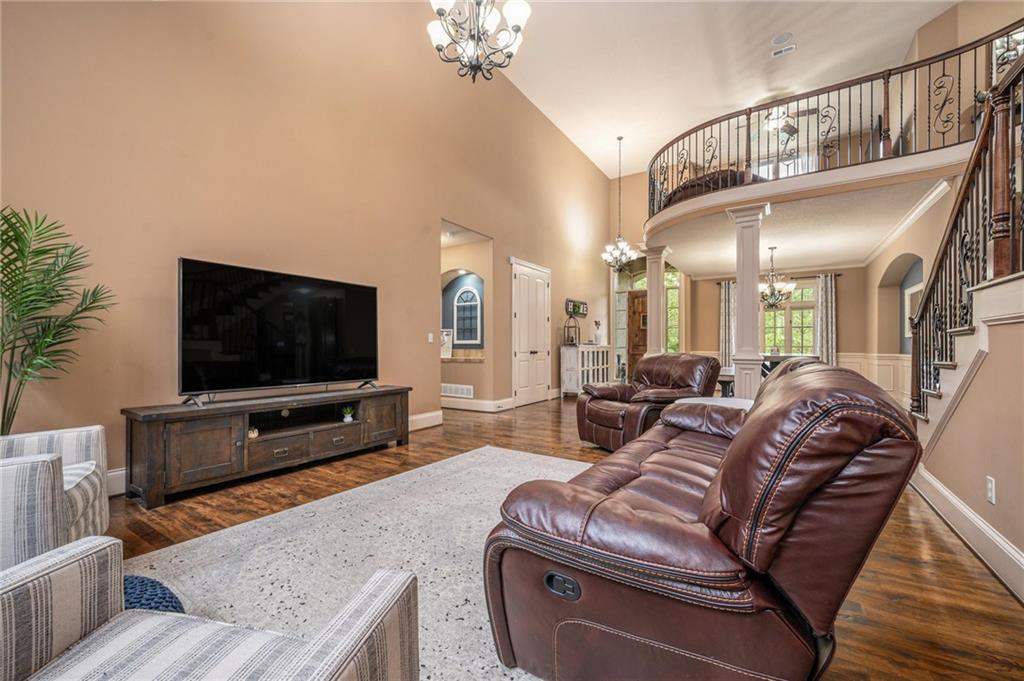 Custom built 1.5 story home built by MBW Construction. Greeted into a large entry with an open living room and formal dining space. Spacious kitchen with custom cabinetry w/ serving buffet, large kitchen island, walk-in pantry, 5 burner gas range, & all stainless-steel appliances. Off the kitchen is a second dining space, a hearth room w/ custom rock wall & beams, and a walk-out to a covered deck. Main level primary suite with over-sized walk-in closet, dual sinks, walk-in dual headed shower, and whirlpool tub. The second level hosts three additional bedrooms, 2 full bathrooms, and an open loft space. Finished lower level features a bar area, media room space, rec room, 5th bedroom, & 4th full bath. Large storage room space. Private backyard backing to trees and community walking trails. Liberty School District.