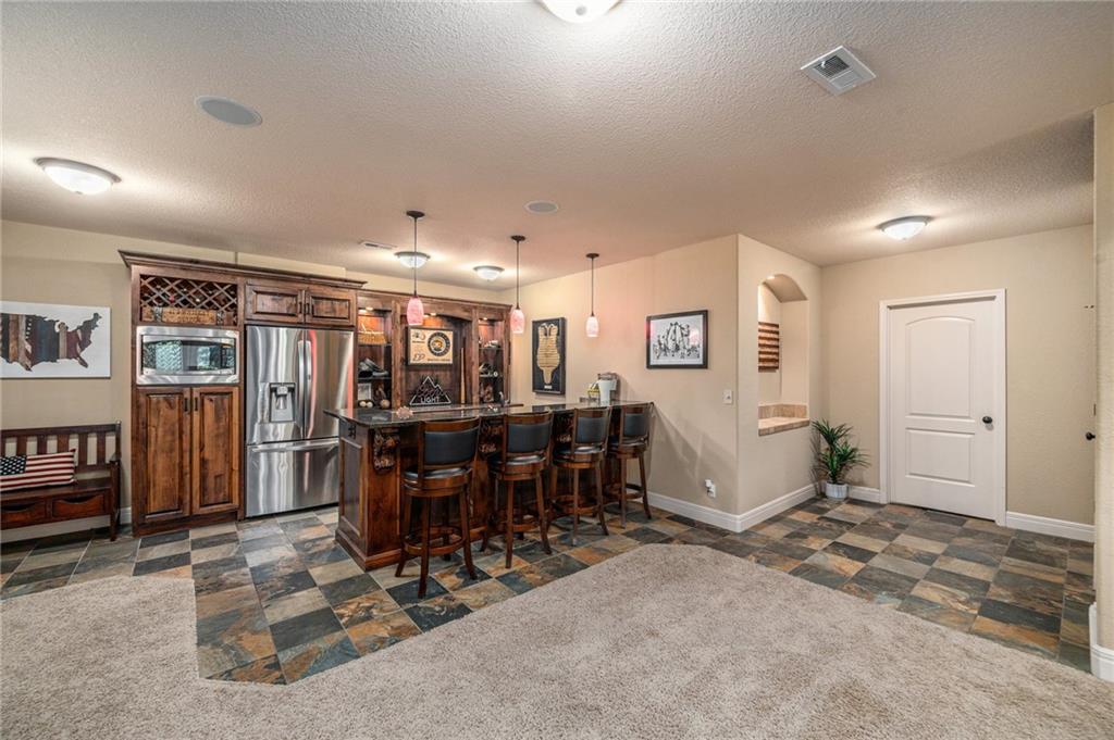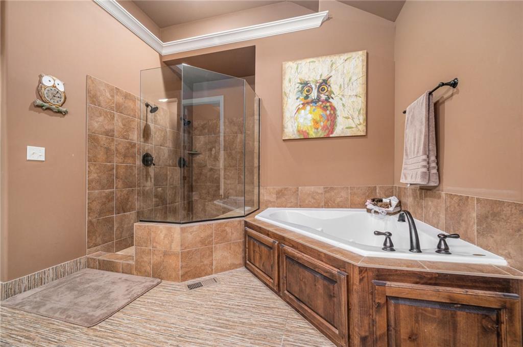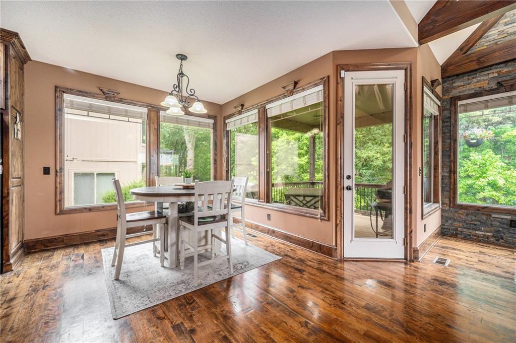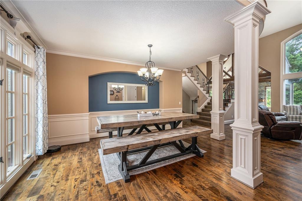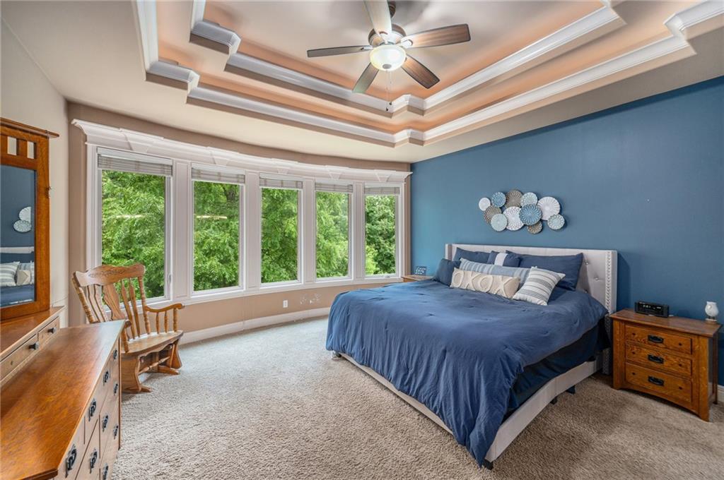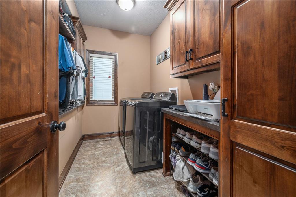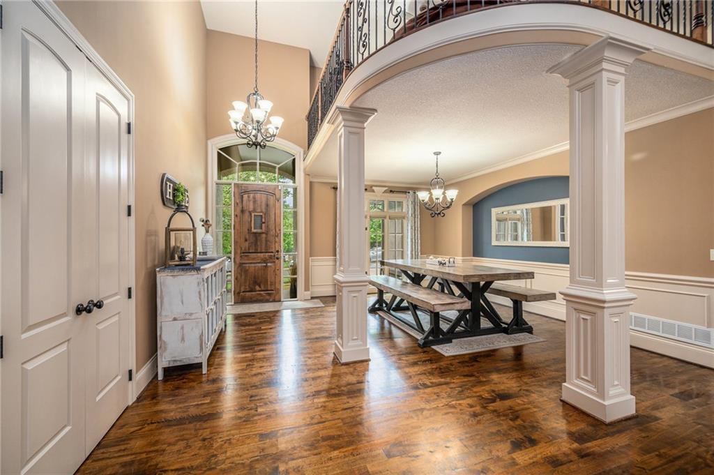 Custom built 1.5 story home built by MBW Construction. Greeted into a large entry with an open living room and formal dining space. Spacious kitchen with custom cabinetry w/ serving buffet, large kitchen island, walk-in pantry, 5 burner gas range, & all stainless-steel appliances. Off the kitchen is a second dining space, a hearth room w/ custom rock wall & beams, and a walk-out to a covered deck. Main level primary suite with over-sized walk-in closet, dual sinks, walk-in dual headed shower, and whirlpool tub. The second level hosts three additional bedrooms, 2 full bathrooms, and an open loft space. Finished lower level features a bar area, media room space, rec room, 5th bedroom, & 4th full bath. Large storage room space. Private backyard backing to trees and community walking trails. Liberty School District.
