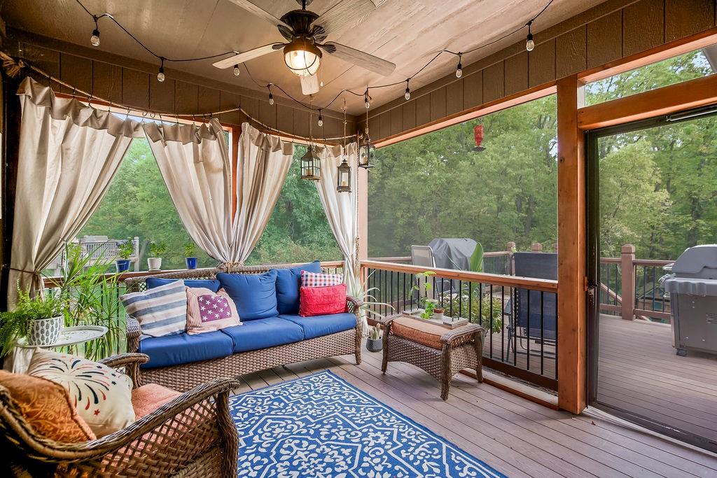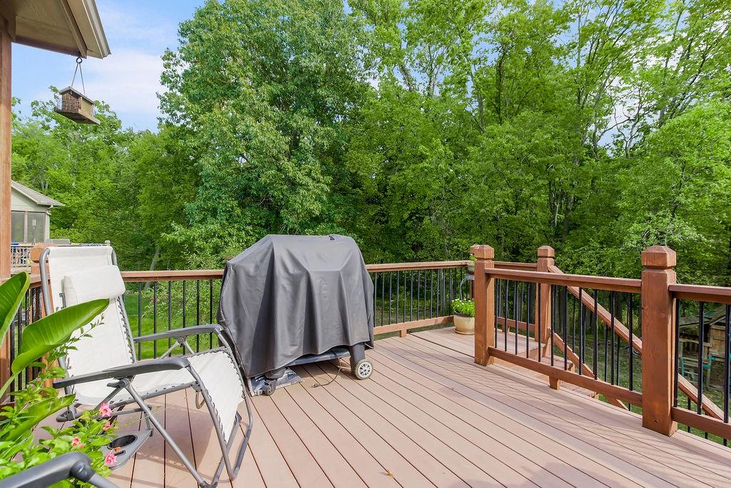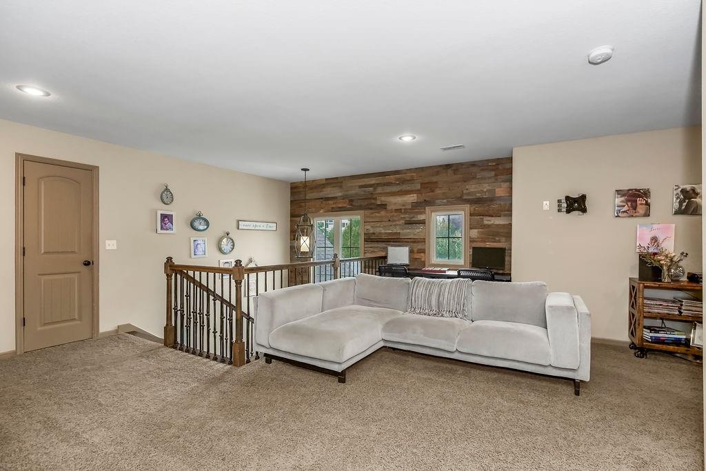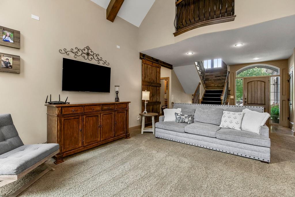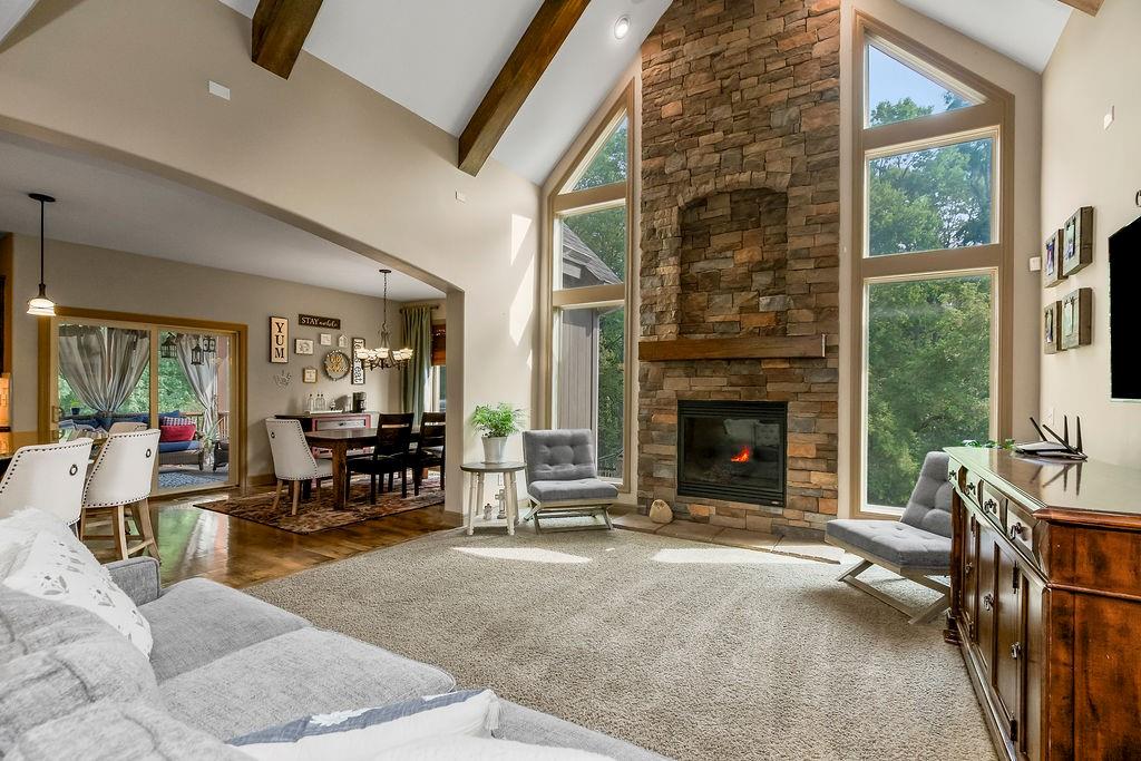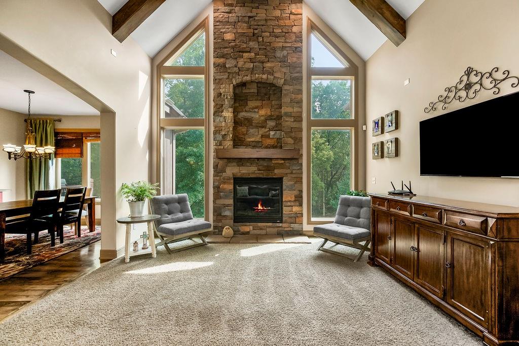 Welcome to this stunning 1.5-story home in Copperleaf offering 4 bedrooms and 3.1 bathrooms. Step inside to soaring cathedral ceilings accented with wood beams and expansive windows that fill the living room with natural light, centered around a striking stone gas fireplace. The chef’s kitchen features a large island with a breakfast bar, stainless steel appliances, a built-in oven and cooktop, a walk-in pantry, and an adjoining dining room. From here, enjoy seamless indoor-outdoor living with access to the screened-in covered deck and extended deck overlooking private greenspace. The main-level primary suite boasts a tray ceiling, a spa-like en-suite with a double vanity, a soaker tub, and a large walk-in closet that conveniently connects to the laundry room. A beautiful sliding barn door adds style and privacy to the space. An office off the kitchen with walkout access completes the first floor. Upstairs, a spacious family room provides the perfect playroom or lounge. Bedroom 2 offers a charming play nook and shares a Jack-and-Jill bath with a double vanity with bedroom 3. Bedroom 4 features vaulted ceilings, an en-suite bath, and a versatile bonus room ideal for an office or playroom. The unfinished walkout basement is ready for your personal touch. Located in a sought-after neighborhood with excellent highway access and close to shopping, Copperleaf also offers wonderful amenities including a pool, clubhouse, trails, and playground.