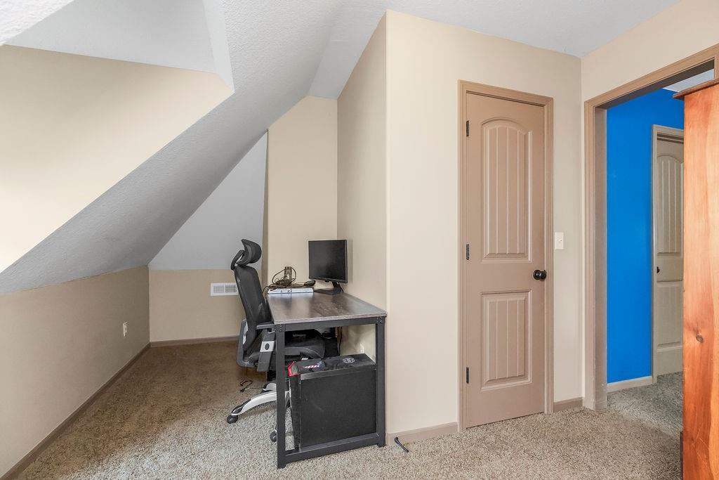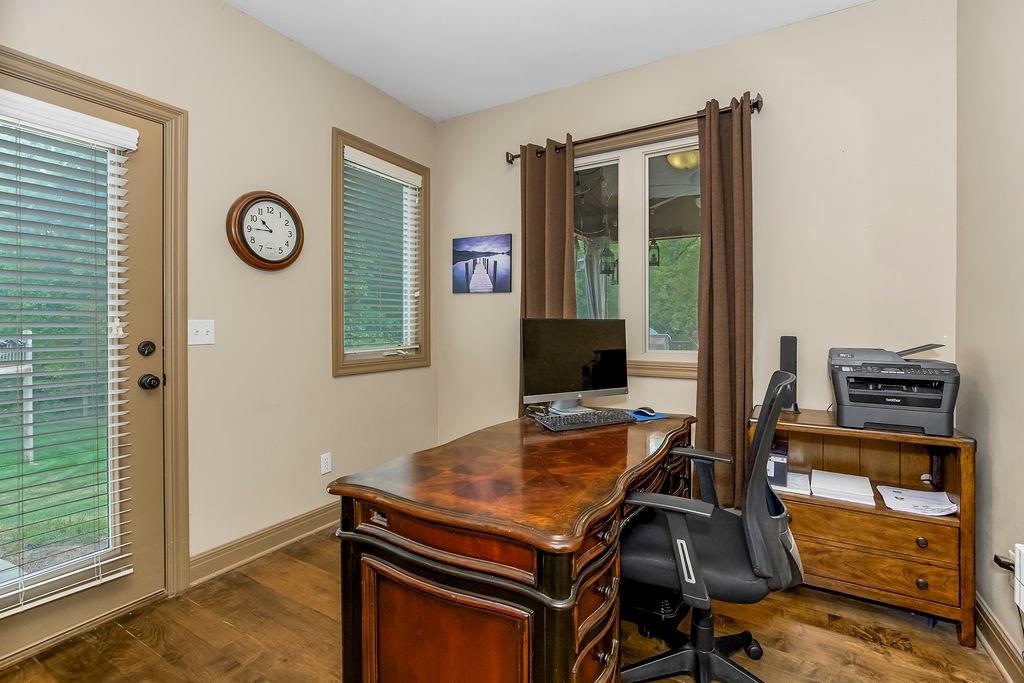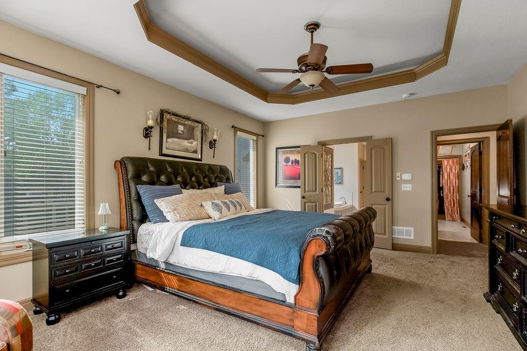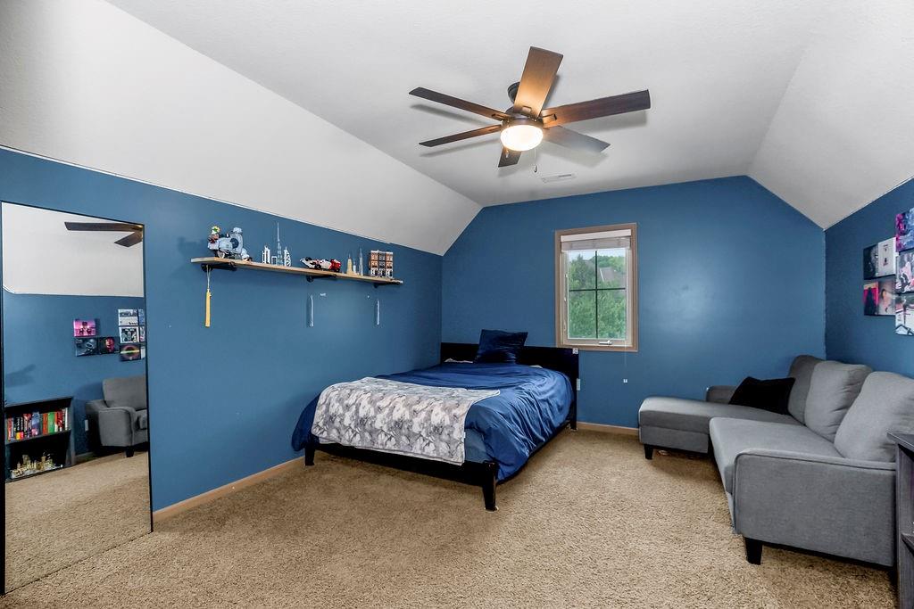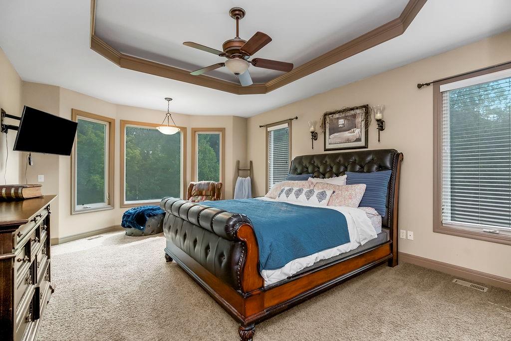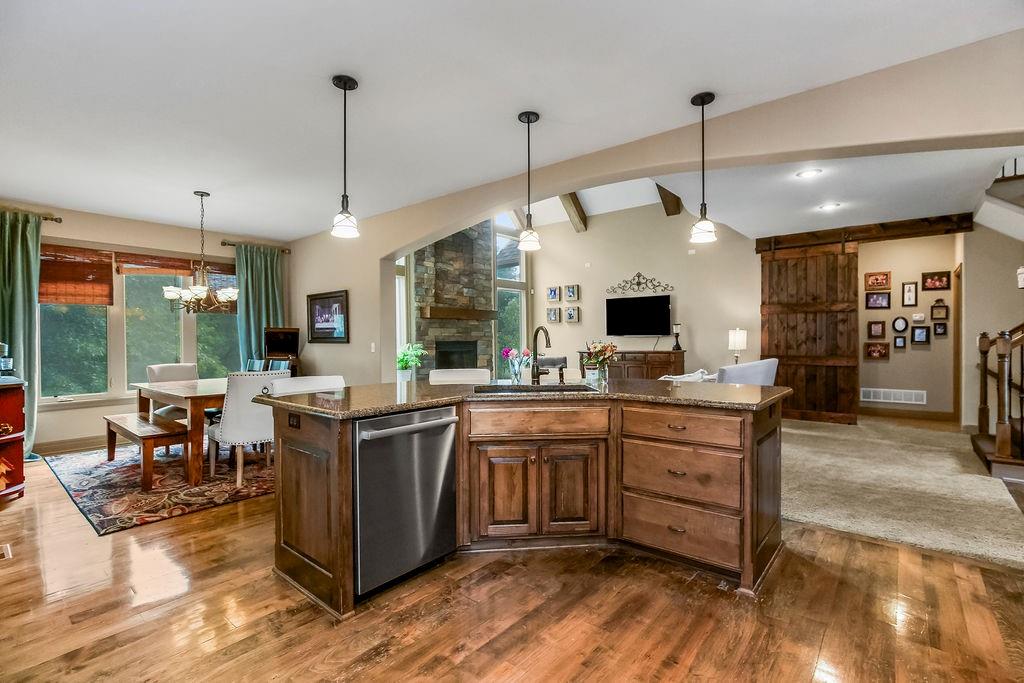 Welcome to this stunning 1.5-story home in Copperleaf offering 4 bedrooms and 3.1 bathrooms. Step inside to soaring cathedral ceilings accented with wood beams and expansive windows that fill the living room with natural light, centered around a striking stone gas fireplace. The chef’s kitchen features a large island with a breakfast bar, stainless steel appliances, a built-in oven and cooktop, a walk-in pantry, and an adjoining dining room. From here, enjoy seamless indoor-outdoor living with access to the screened-in covered deck and extended deck overlooking private greenspace. The main-level primary suite boasts a tray ceiling, a spa-like en-suite with a double vanity, a soaker tub, and a large walk-in closet that conveniently connects to the laundry room. A beautiful sliding barn door adds style and privacy to the space. An office off the kitchen with walkout access completes the first floor. Upstairs, a spacious family room provides the perfect playroom or lounge. Bedroom 2 offers a charming play nook and shares a Jack-and-Jill bath with a double vanity with bedroom 3. Bedroom 4 features vaulted ceilings, an en-suite bath, and a versatile bonus room ideal for an office or playroom. The unfinished walkout basement is ready for your personal touch. Located in a sought-after neighborhood with excellent highway access and close to shopping, Copperleaf also offers wonderful amenities including a pool, clubhouse, trails, and playground.