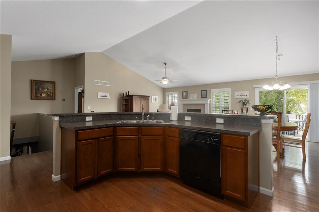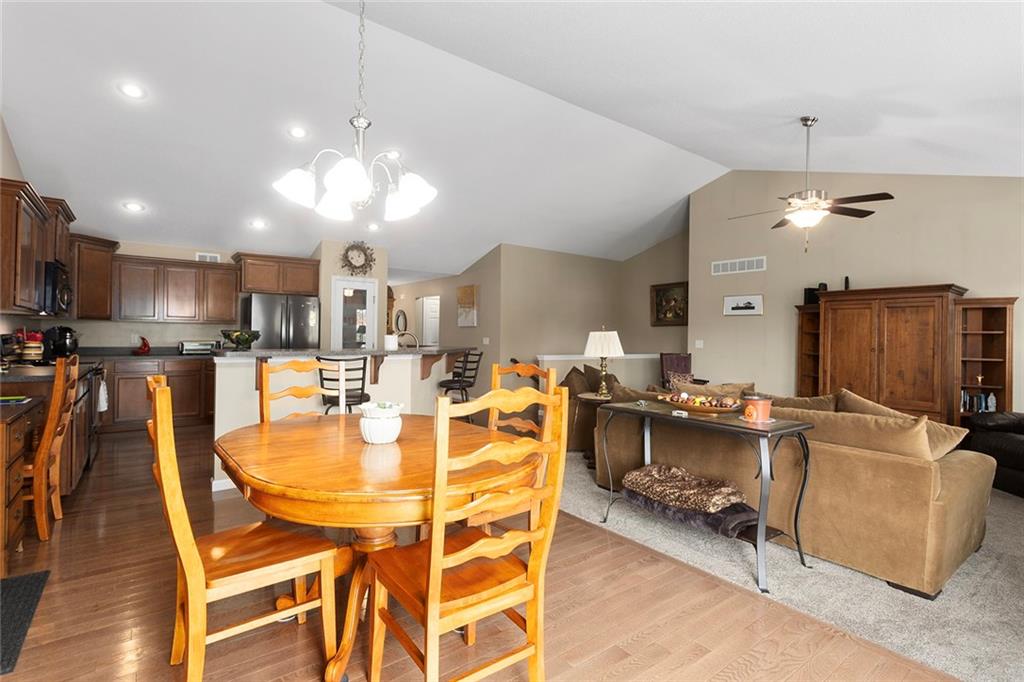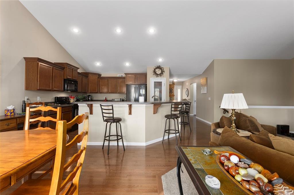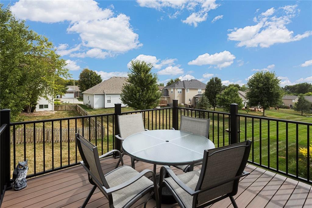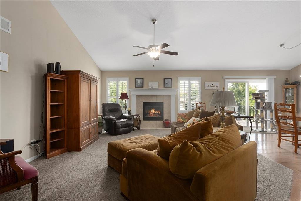 The inviting open floor plan includes a spacious living room with a cozy fireplace, creating a warm gathering space, while large windows fill the home with natural light. The kitchen is well-appointed with a pantry, abundant storage, and a cheerful breakfast area that opens to the deck, making it a perfect spot for morning coffee or casual meals.