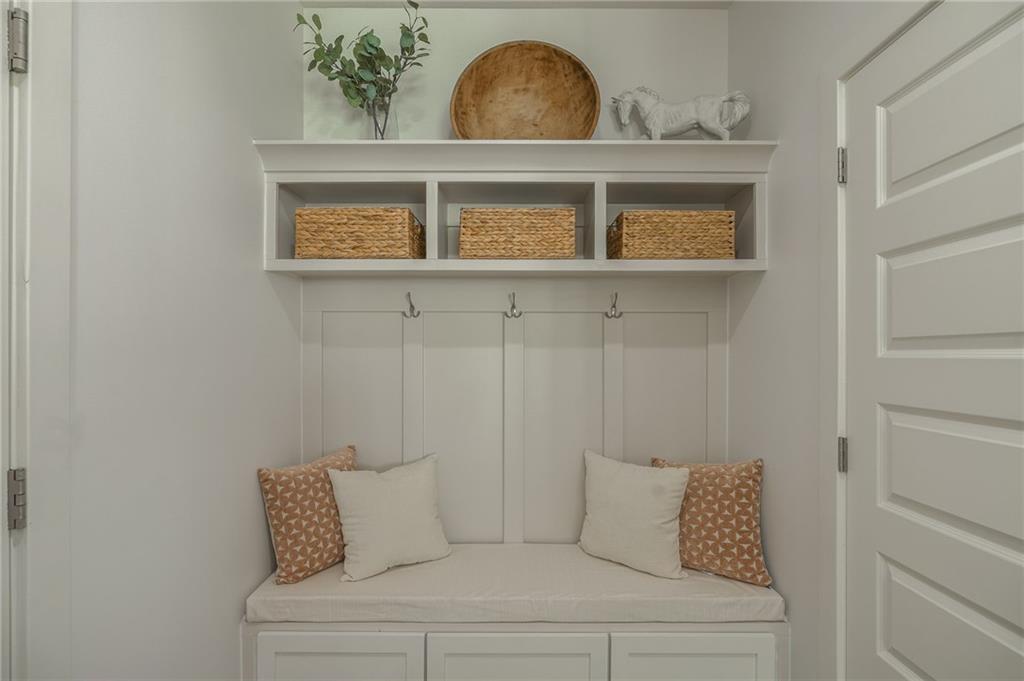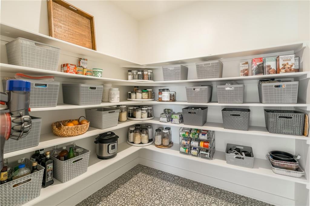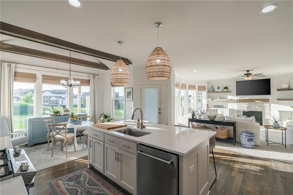 Open floor plan with wood beams, vaulted ceiling, and abundant natural light. The gourmet kitchen features a large island, quartz countertops, and an impressive walk-in pantry. Spacious living area with fireplace, built-ins, and floating shelves.