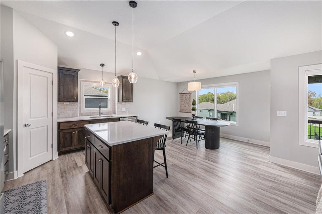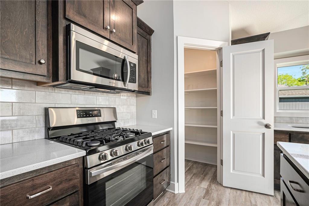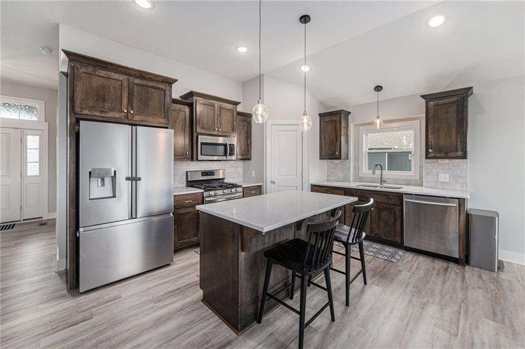 This beautiful 4 bedroom, 3 bath reverse 1.5 story home, offers over 2,900 sq ft of finished living space in a desirable Woodland Creek neighborhood with a community pool. The open concept main level features a spacious living room with a gas fireplace and plenty of natural light. The modern kitchen includes quartz counters, custom cabinets, a large island, walk-in pantry, gas stove, and stainless steel appliances. Adjacent to the kitchen is an eat-in area with access to a covered back deck that is perfect for relaxing or entertaining.