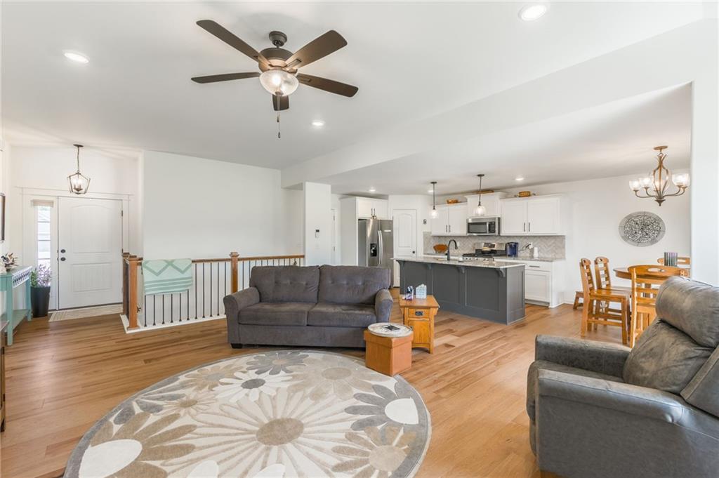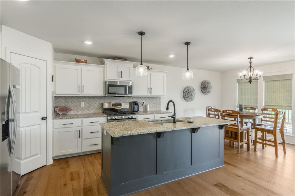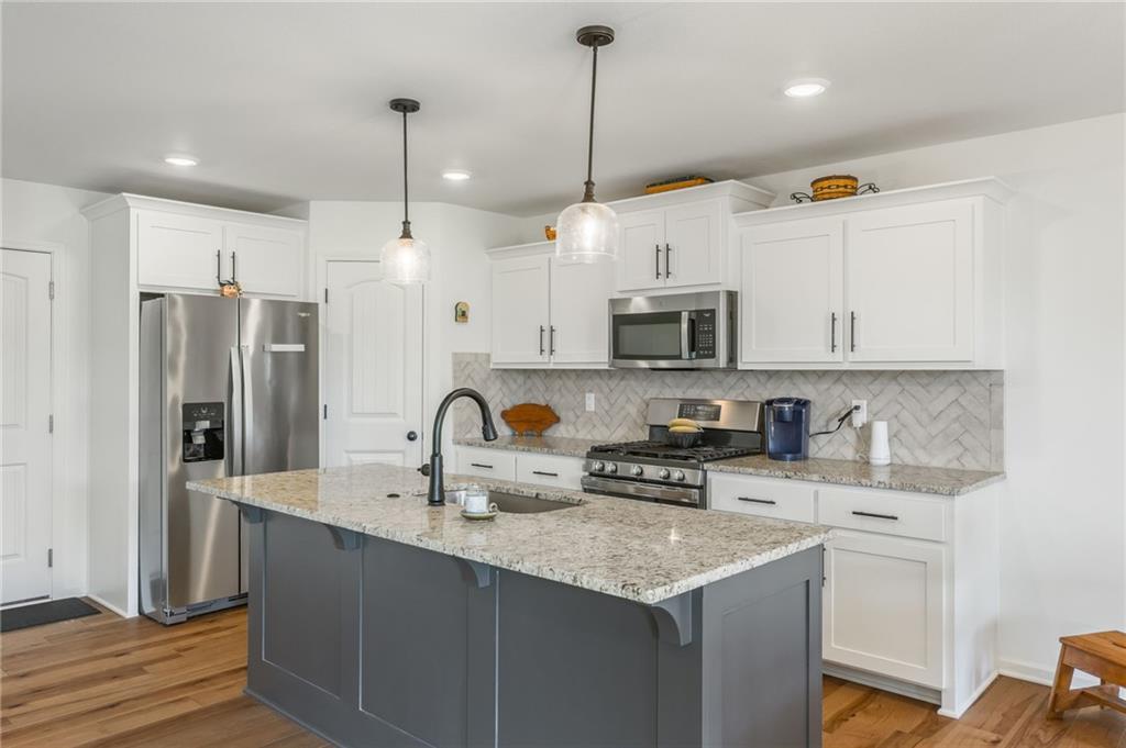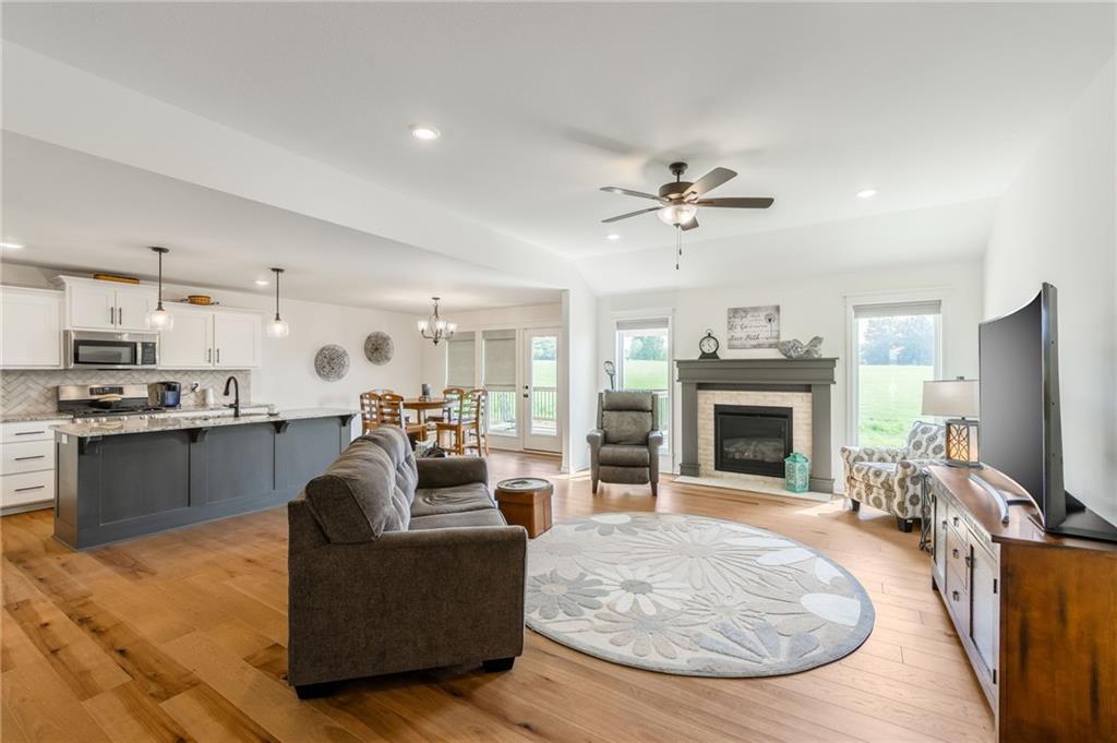 This stunning 3-bedroom, 2-bath ranch is just 3 years old and perfectly situated on a quiet cul-de-sac in Kearney. Step inside to an open-concept floor plan filled with natural light and modern finishes throughout. The spacious living room features a cozy fireplace, creating a warm and inviting space to relax. The kitchen is a chef’s dream, offering stainless steel appliances, a large center island with seating, ample cabinet space, and a dining area that flows seamlessly to the covered deck—perfect for entertaining guests or enjoying your morning coffee.