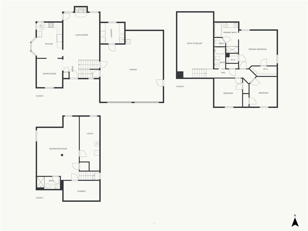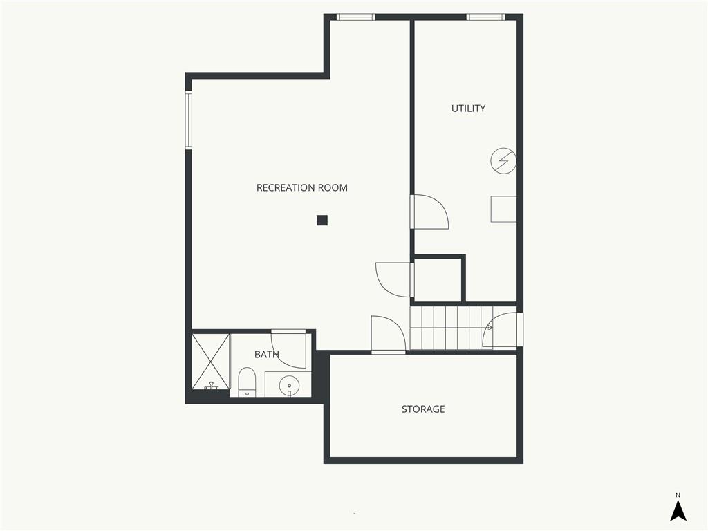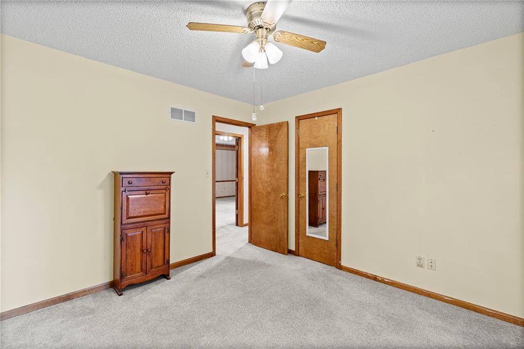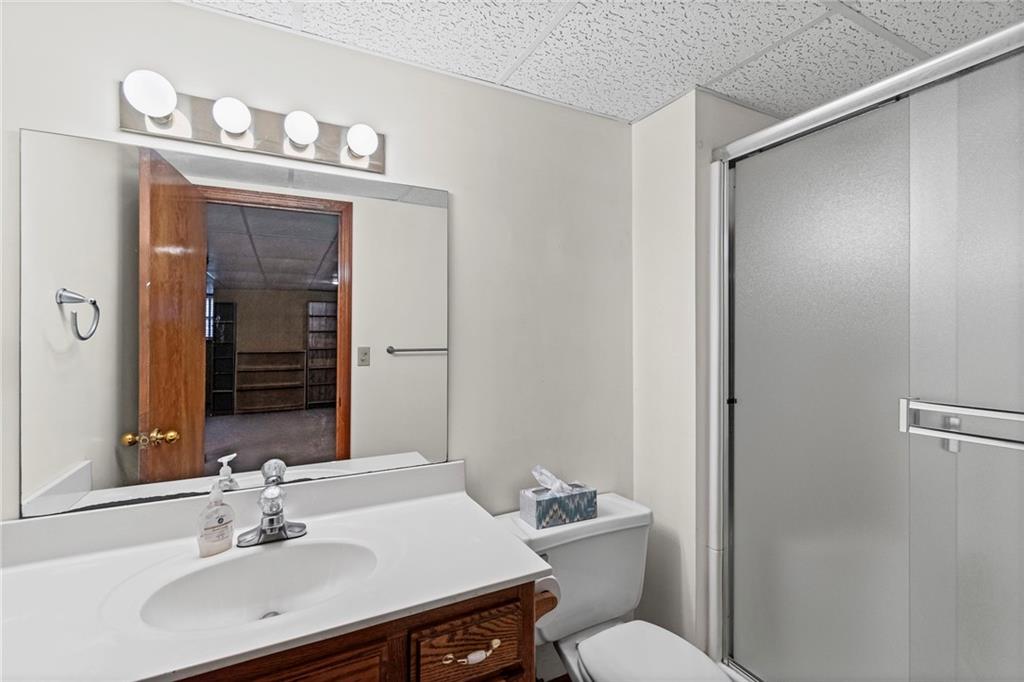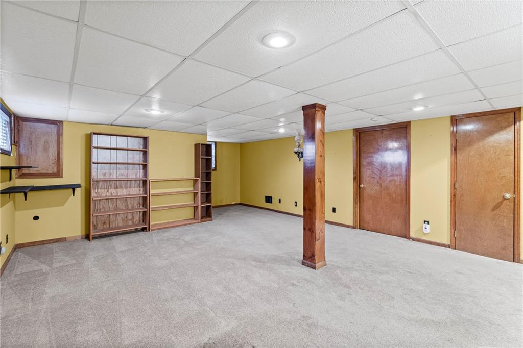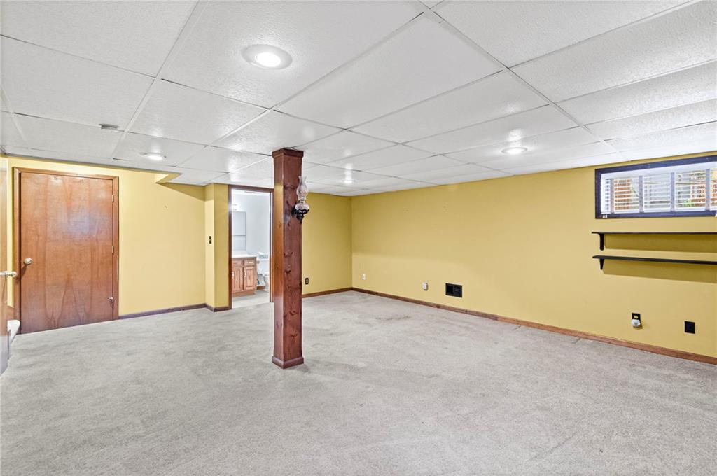The finished lower level includes a spacious recreation room and a third full bathroom, along with two unfinished areas for storage—one of which is enclosed with concrete and doubles as a storm shelter.