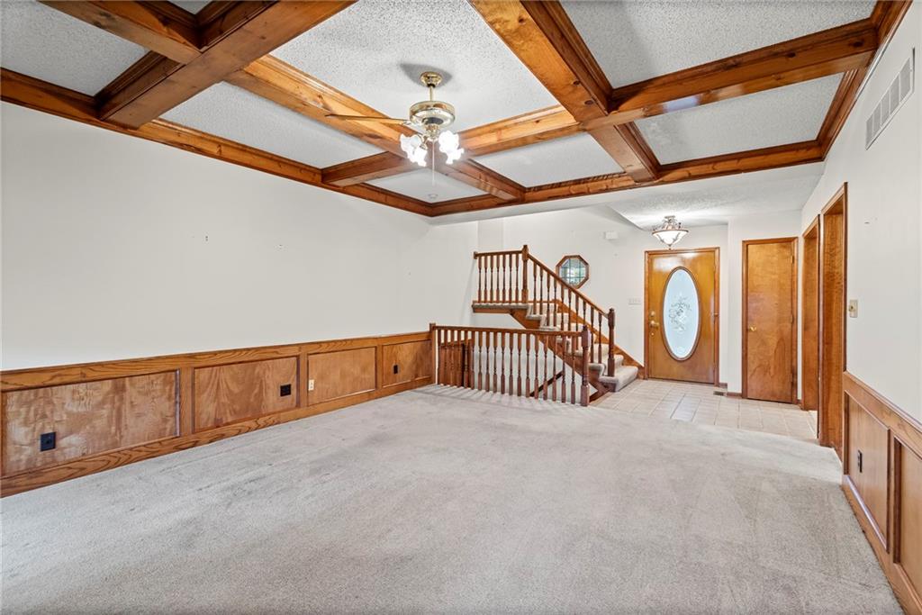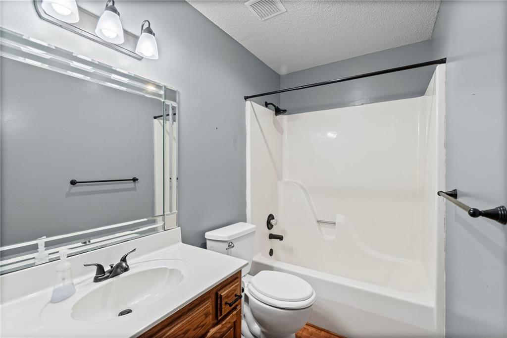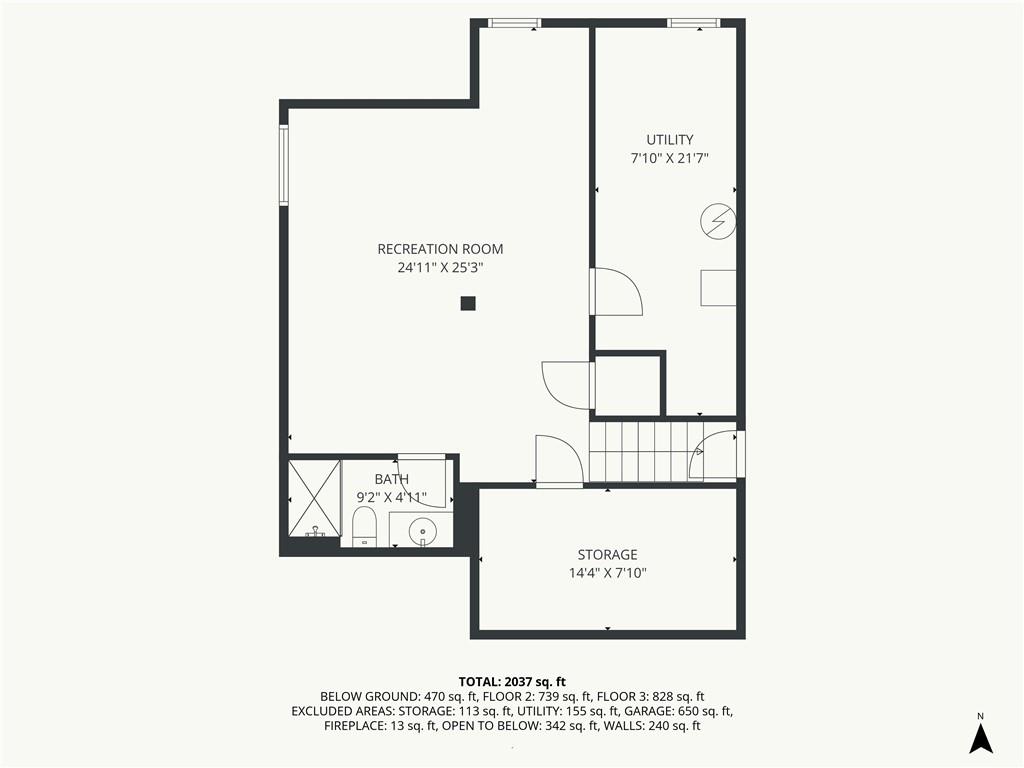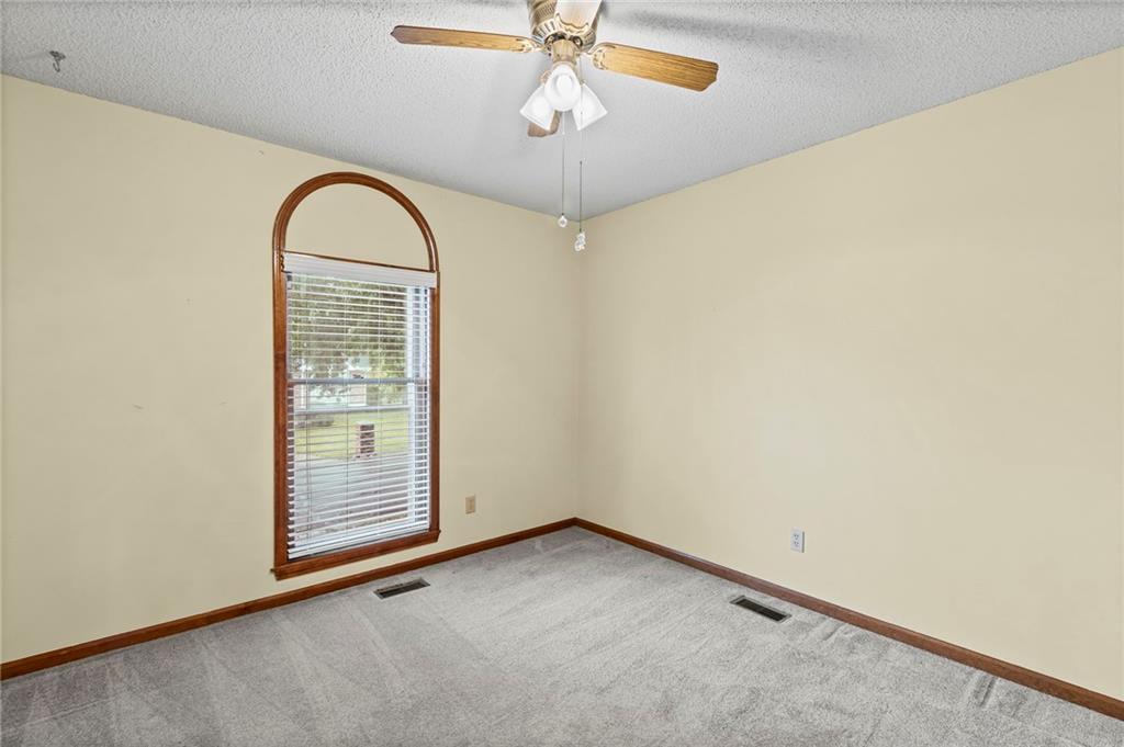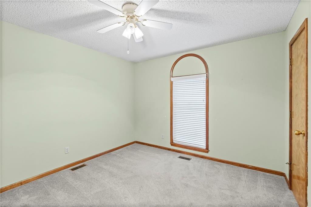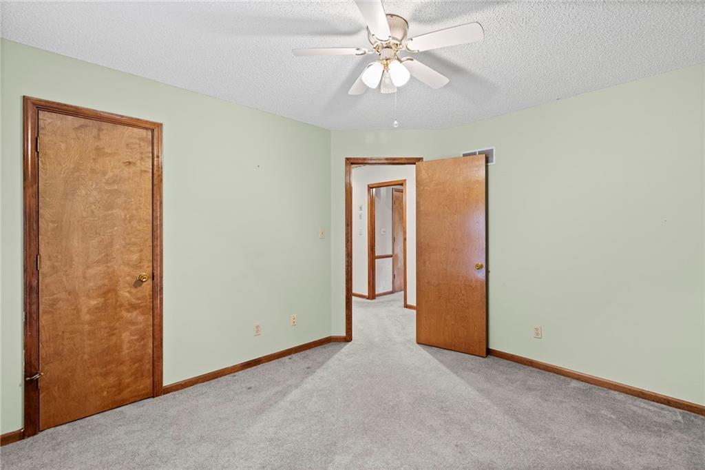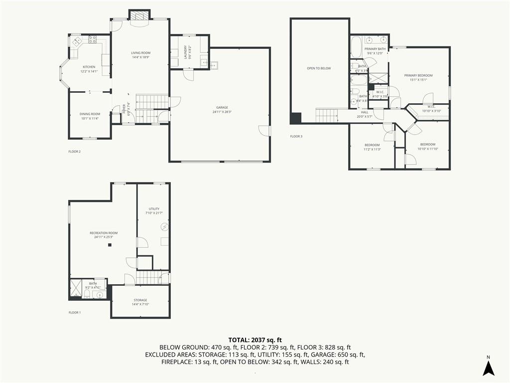The finished lower level includes a spacious recreation room and a third full bathroom, along with two unfinished areas for storage—one of which is enclosed with concrete and doubles as a storm shelter.
