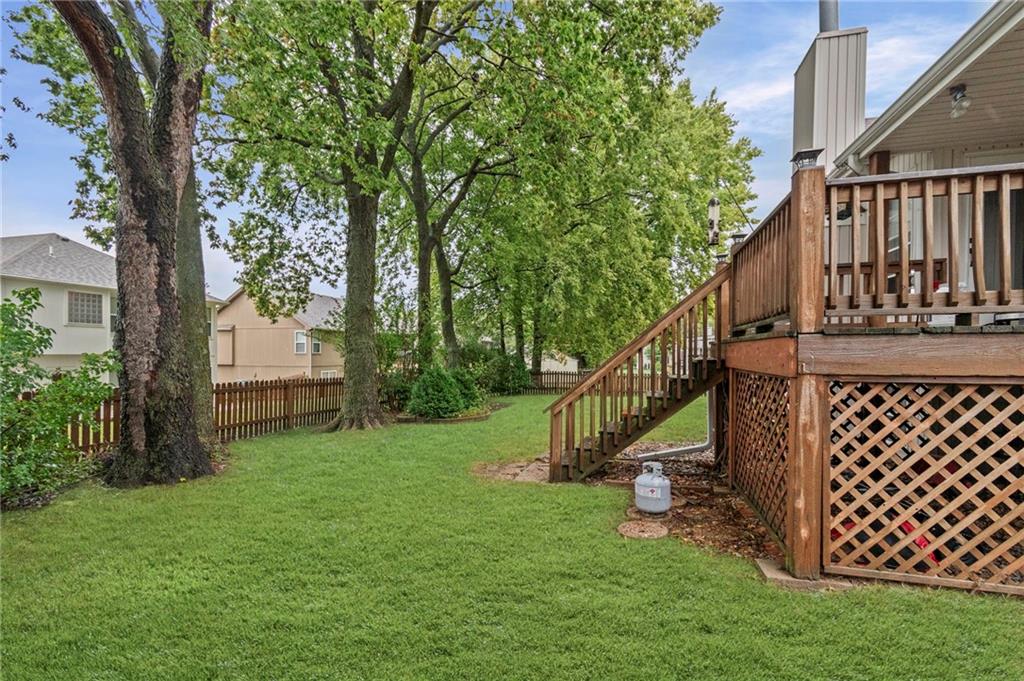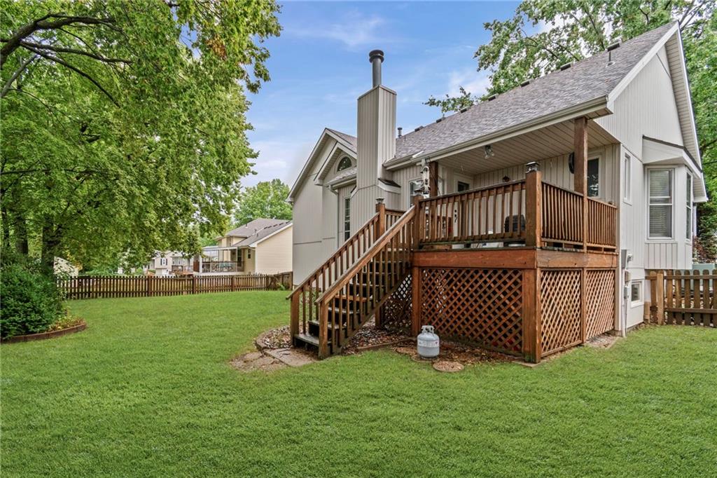 Additional conveniences include a laundry room in the garage, fully equipped with washer, dryer, sink, and built-in cabinets. Outdoors, enjoy the covered front porch, a fenced backyard with a covered deck, and mature trees providing shade and privacy.