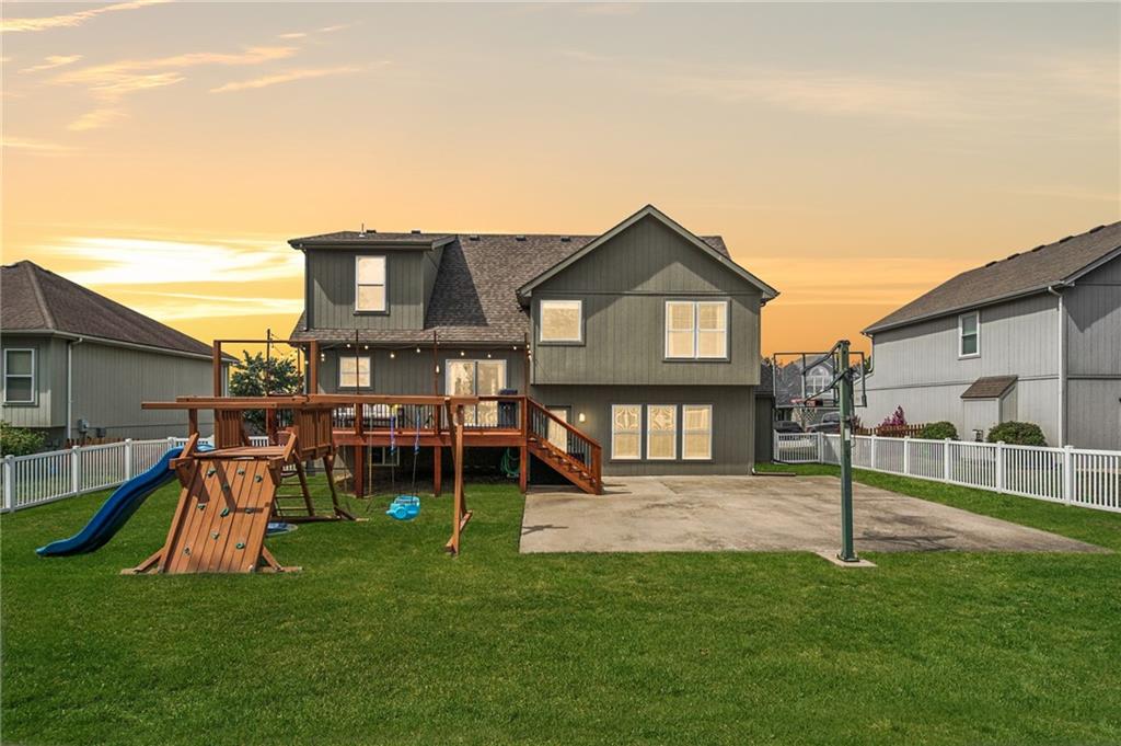 The entry and living room impress with soaring ceilings, charming dormers, and a cozy fireplace. The dining area and family room both open to a large deck and oversized patio overlooking the backyard with low-maintenance white vinyl fencing, a sport court, and beautifully groomed lawn—ideal for quiet evenings outdoors or endless entertainment possibilities.